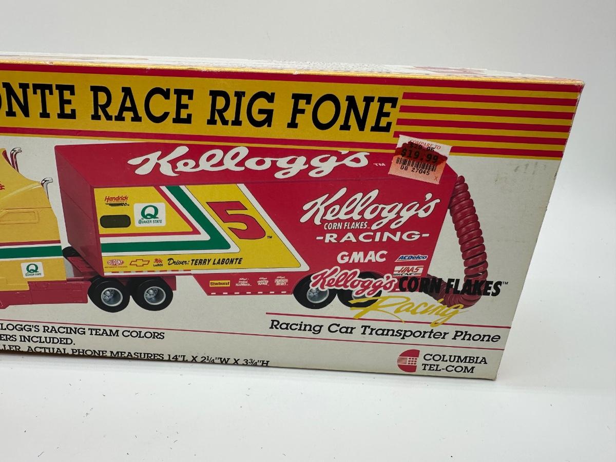 Vintage Terry Labonte Kellogg’s Racing Race Rig Telephone featuring the iconic #5 Kellogg’s Corn Flakes NASCAR transporter design. Produced by Columbia Tel-Com, this novelty landline phone is styled as a race car hauler and celebrates Labonte’s Hendrick Motorsports era.