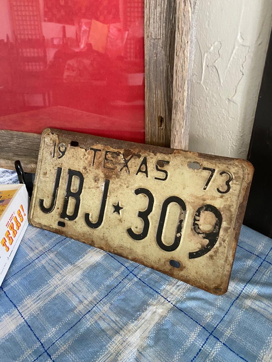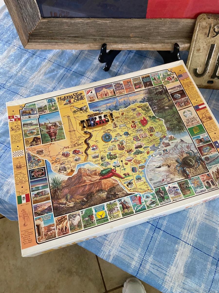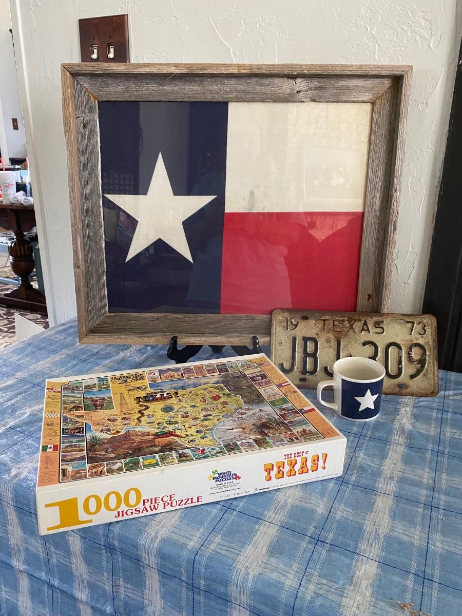 Framed Texas Flag - Vintage Texas puzzle- 1973 License plate - coffee cup