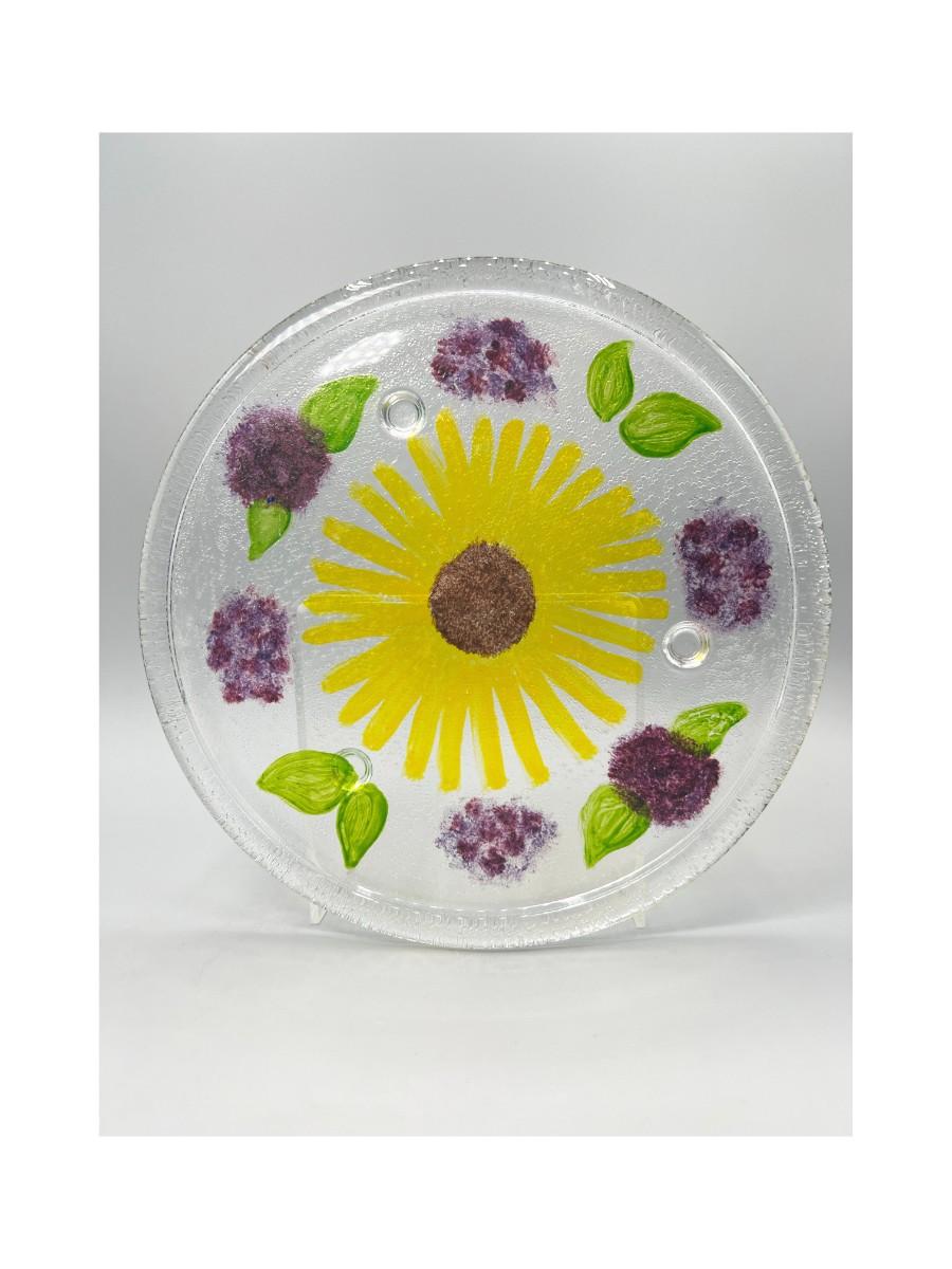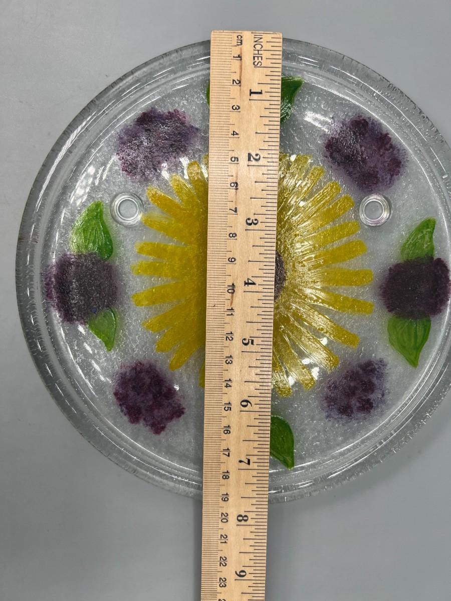 Vintage Textured Glass Sunflower Springtime Plate, there is no signifncant cracks or chips to the glass and is in good useable condition. Check pictures for more details and for sizing.