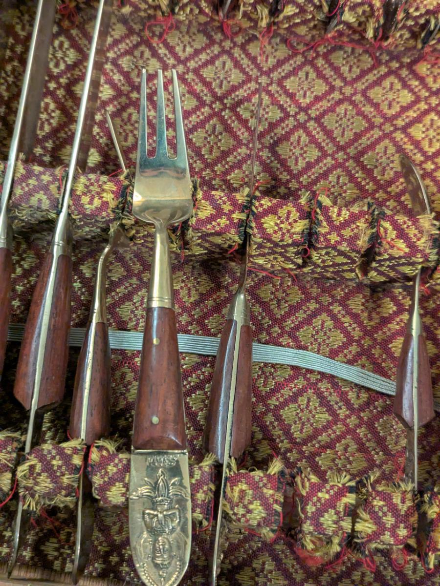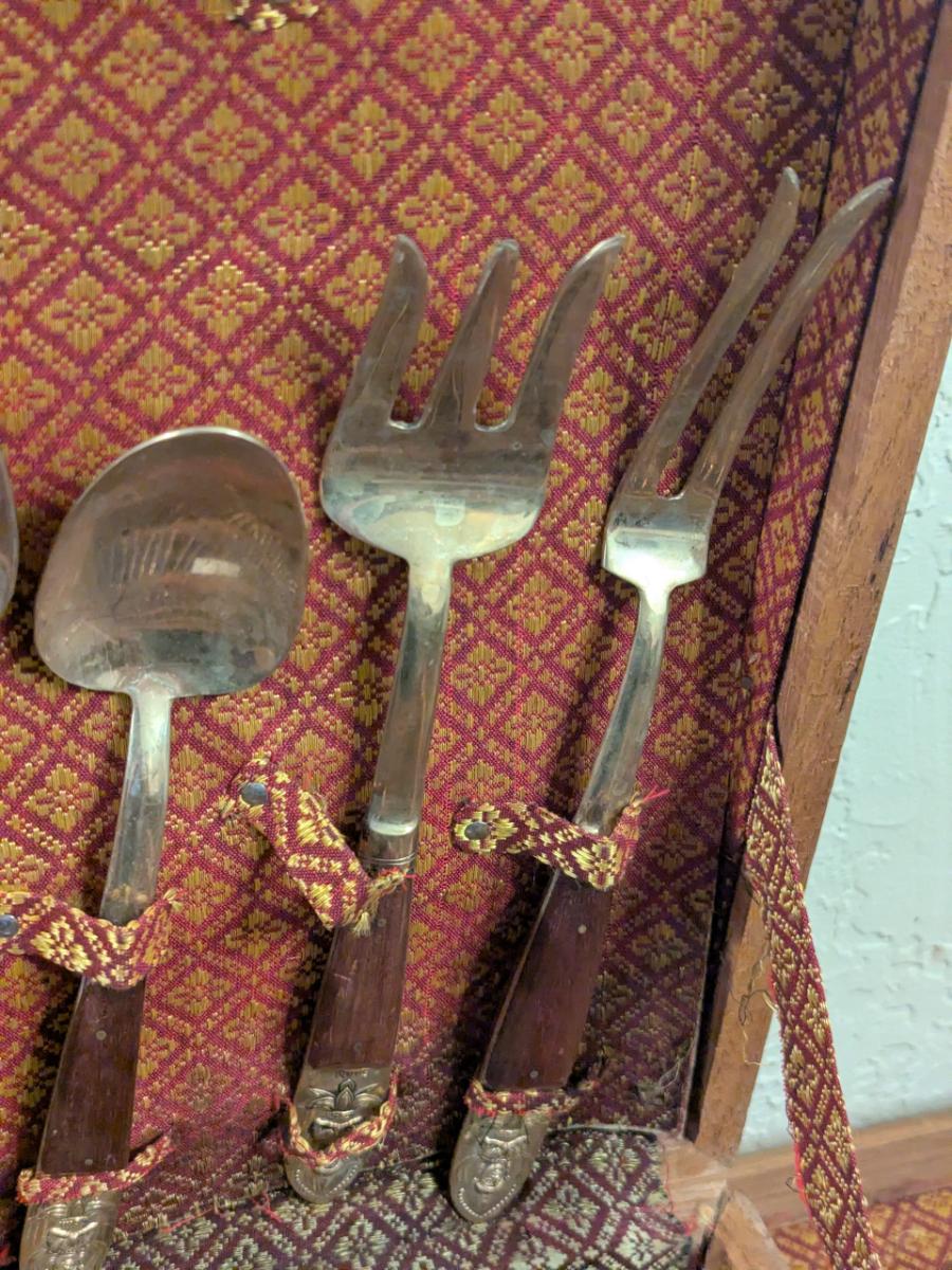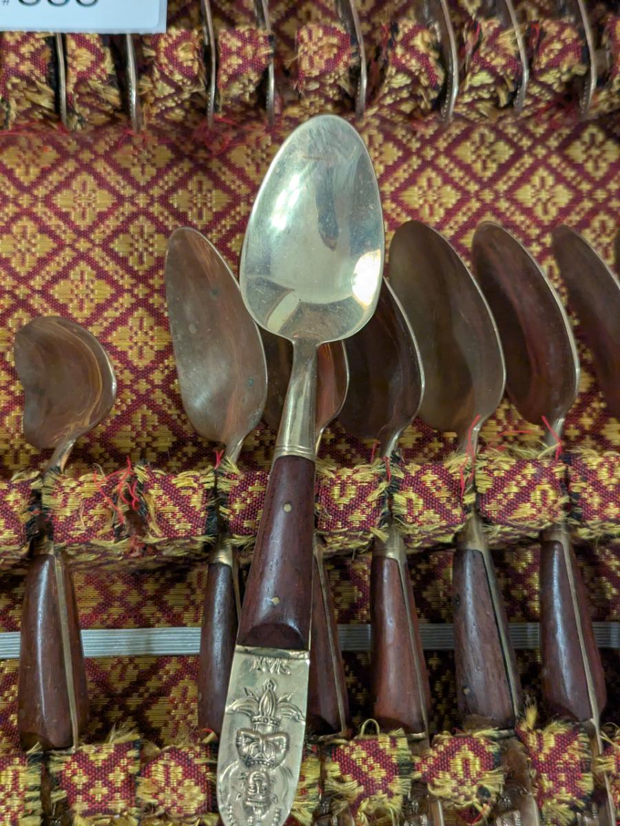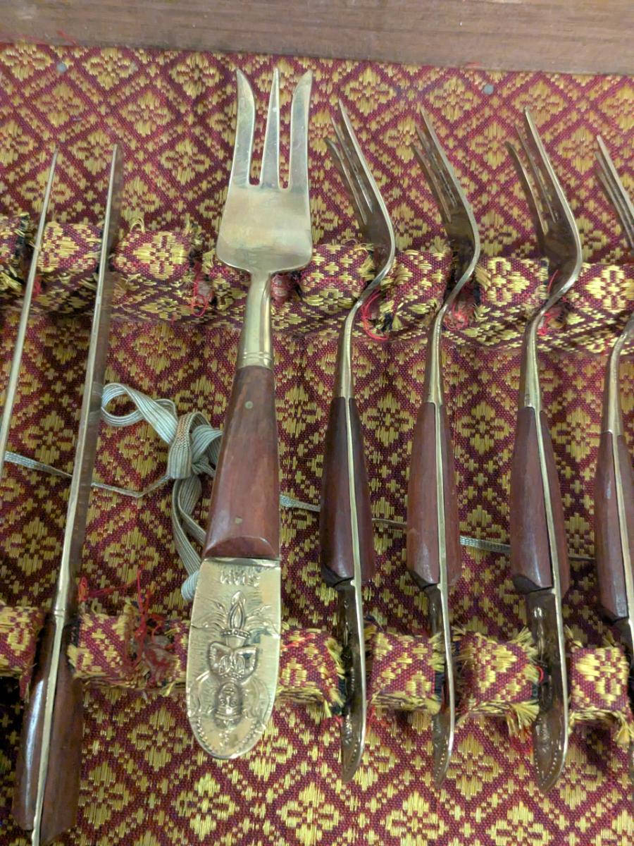 vintage Thai Siam Brass flatware set with rosewood handles in Storage box