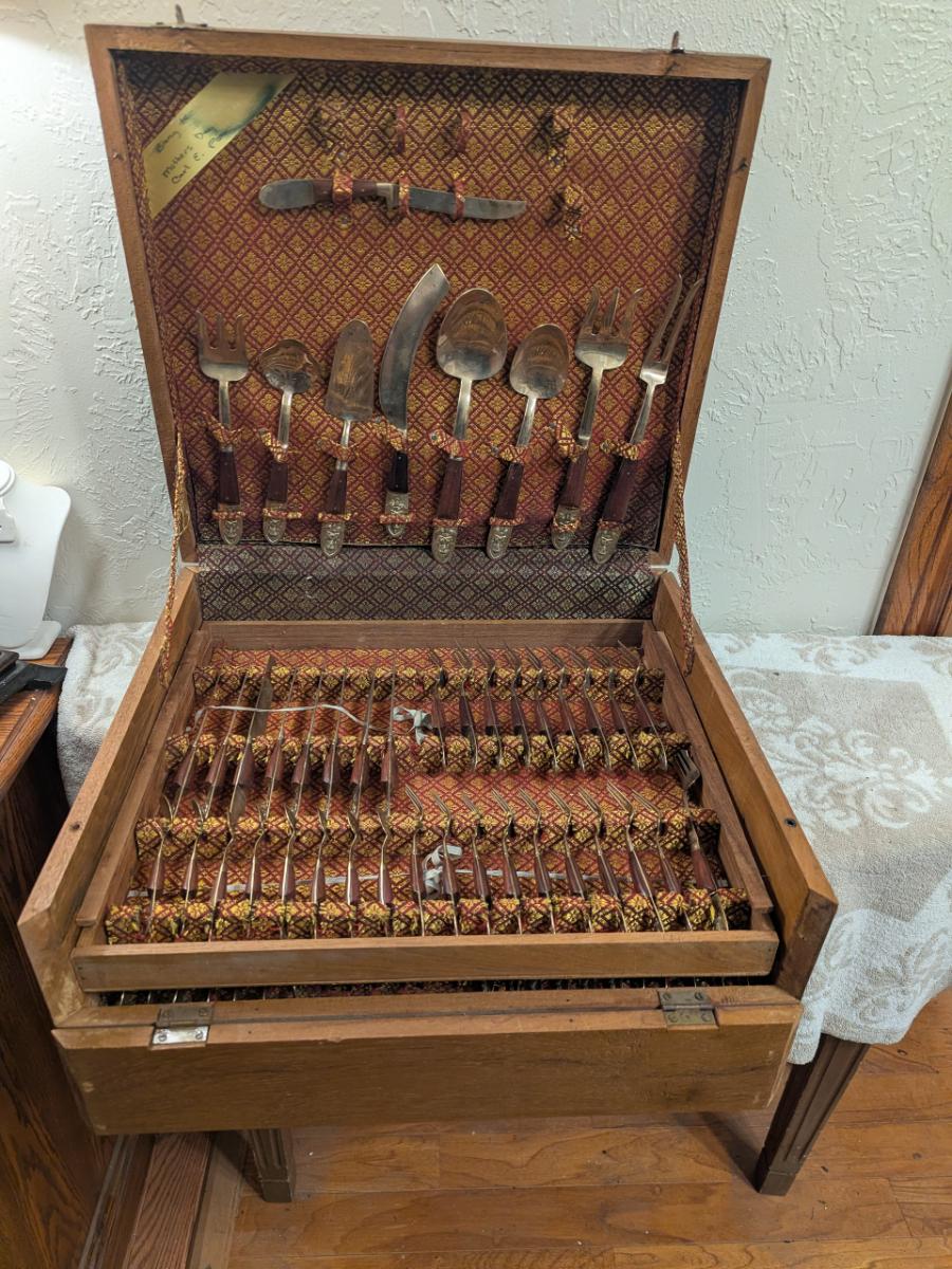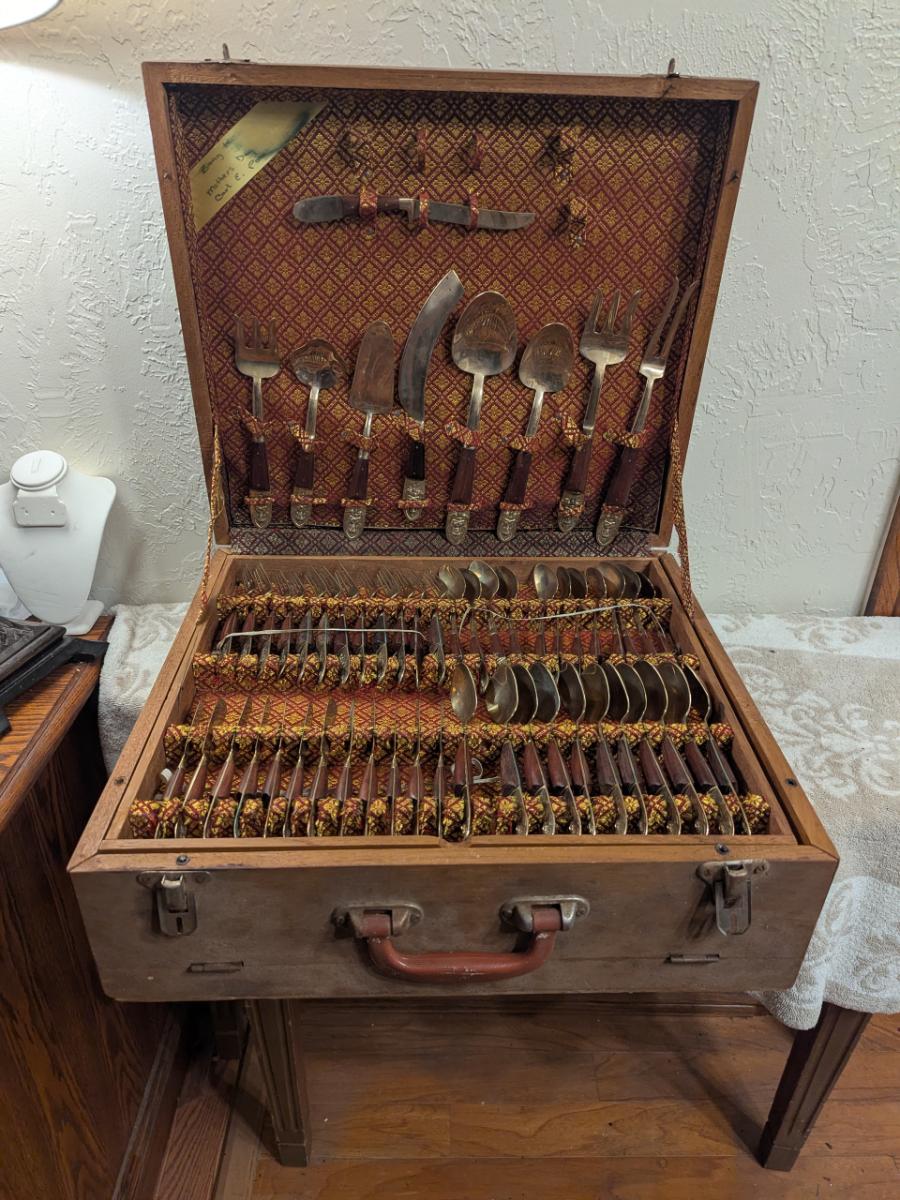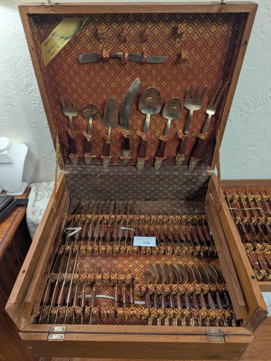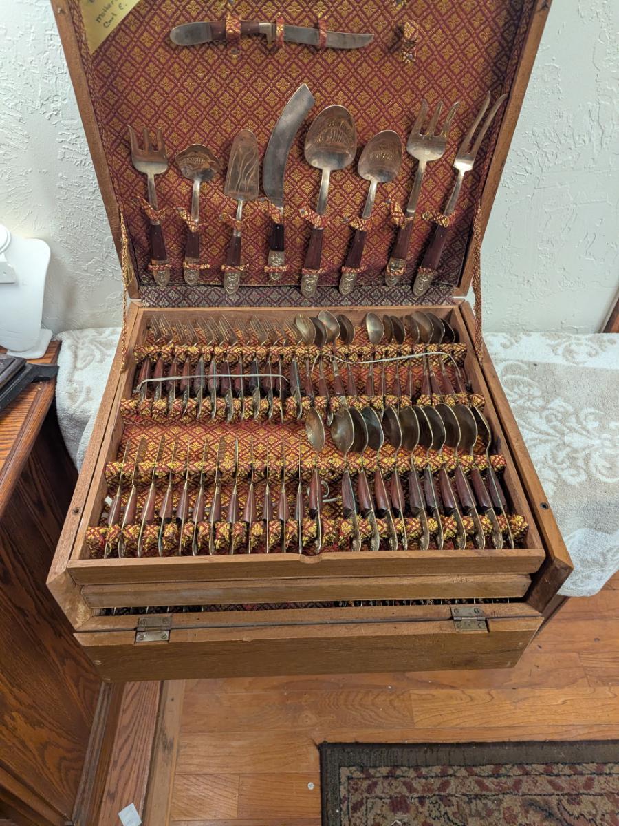 vintage Thai Siam bronze flatware set with rosewood handles in Storage box
