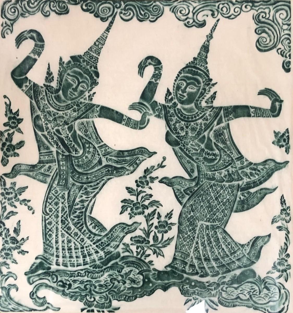 Description: Vintage Thai Temple Rubbing Green dancers. Measurement approximate: 26 x 25 Frame/ 24 x 23 Image (Inches). Material: Paper