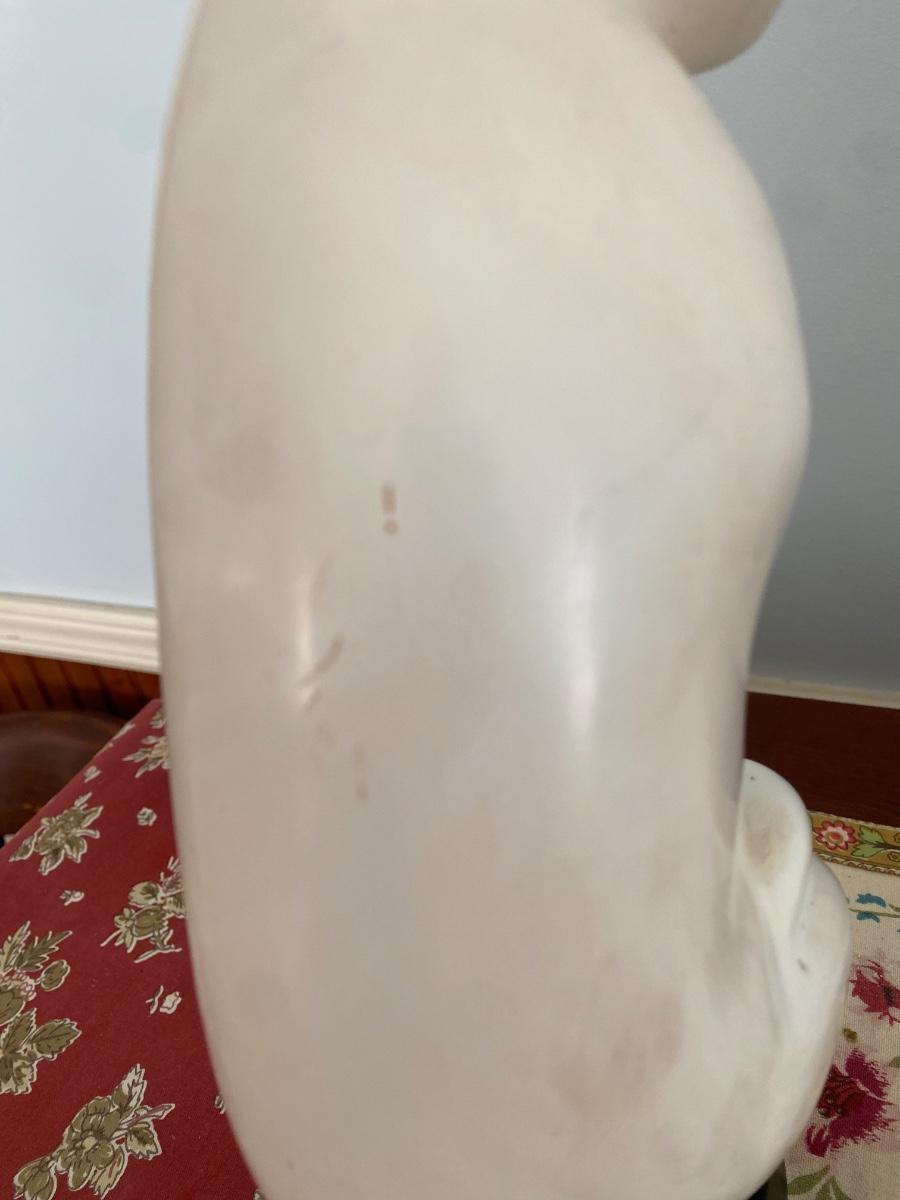 AN ALL AROUND A GREAT DECORATIVE PIECE TO ANY DECOR....CAST IN FOUNDRY STONE, HE IS SIGNED "LO LI CHING" AND SITTING ON A SMALL BLACK PEDESTAL....HE HAS A FEW TOUCH UP SPOTS THAT ARE VISIBLE IN PICTURES. .HE IS QUITE A WEIGHTY PIECE SO HE WILL NOT BE KNOCKED OVER OR TOSSED ABOUT EASILY.. There are surface issues as shown in photos, but does not detract from overall beauty.
