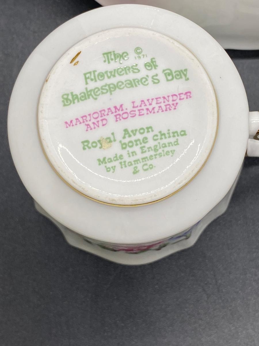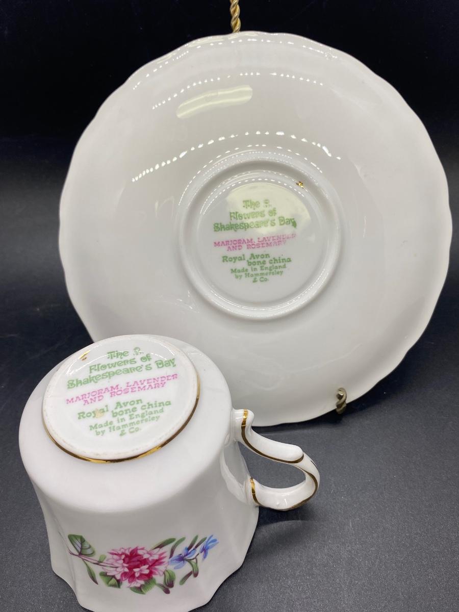 Vintage The Flowers of Shakespeare's Day Royal Avon Bone China England Hammersley & Co. Tea & Saucer Set, there is some light wear, but there is no significant damage to the pieces and is in good vintage condition. Check pictures for more details and for sizing