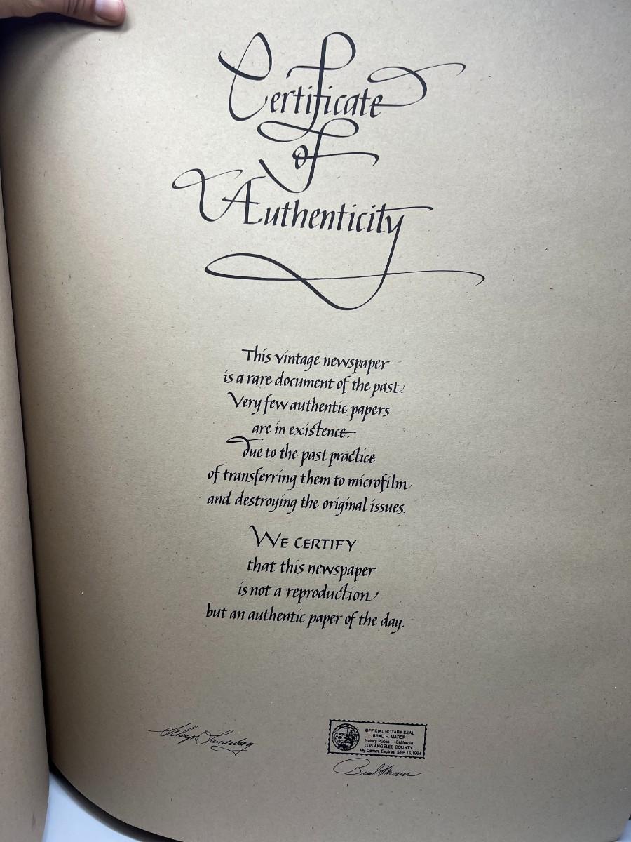 There is no significant damage to the newspaper or hardcover and is in overall good vintage condition. Check pictures for more details and for sizing.