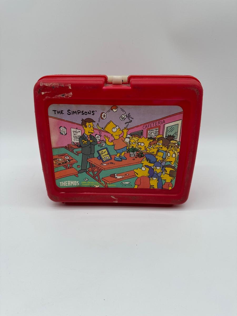 Vintage Simpsons lunchbox set featuring a red plastic Thermos lunchbox with classic cafeteria scene graphic and matching Bart Simpson thermos. Original pieces, not reproduction. Shows honest wear from age and use including scuffs, scratches, and surface grime (see photos). Hinges, latch, and handle present. Thermos lid screws on properly. Great nostalgia piece for Simpsons fans and 1990s pop-culture collectors.