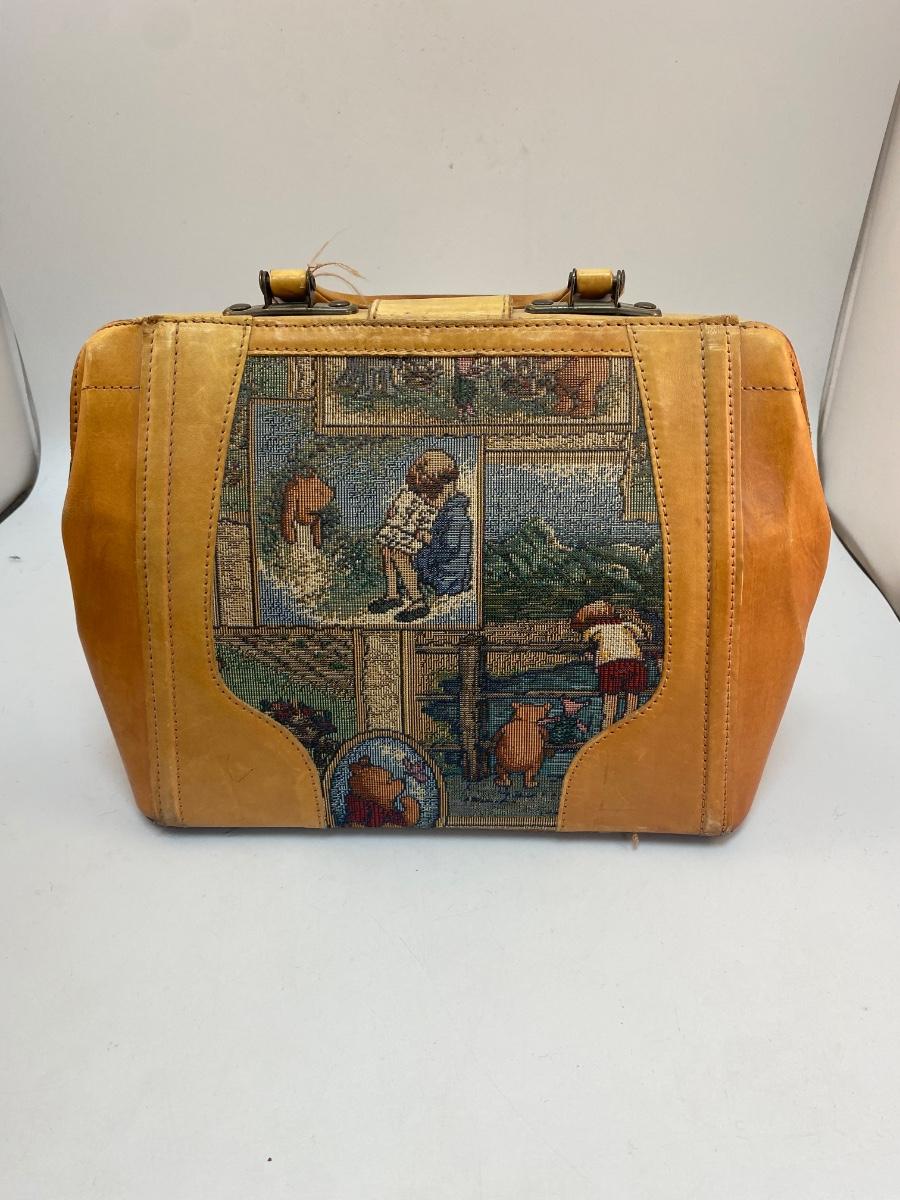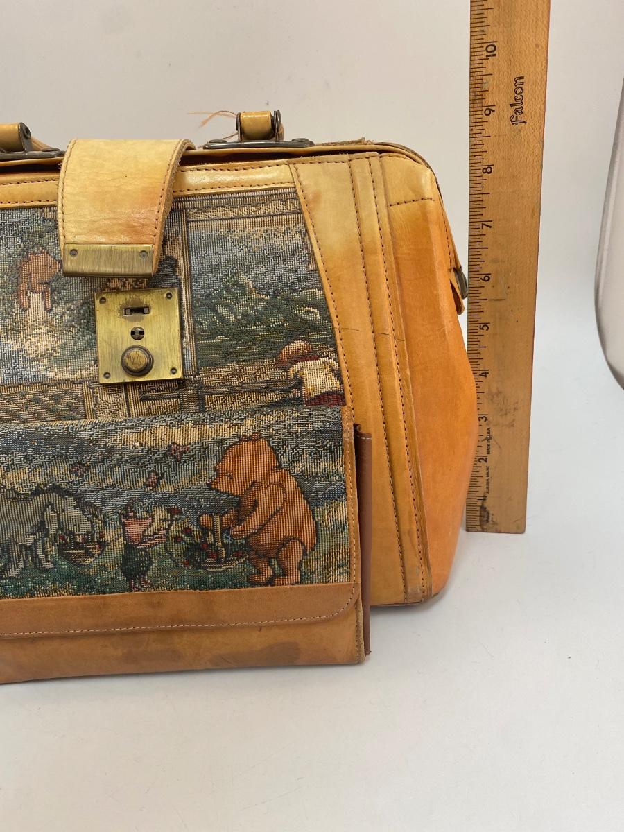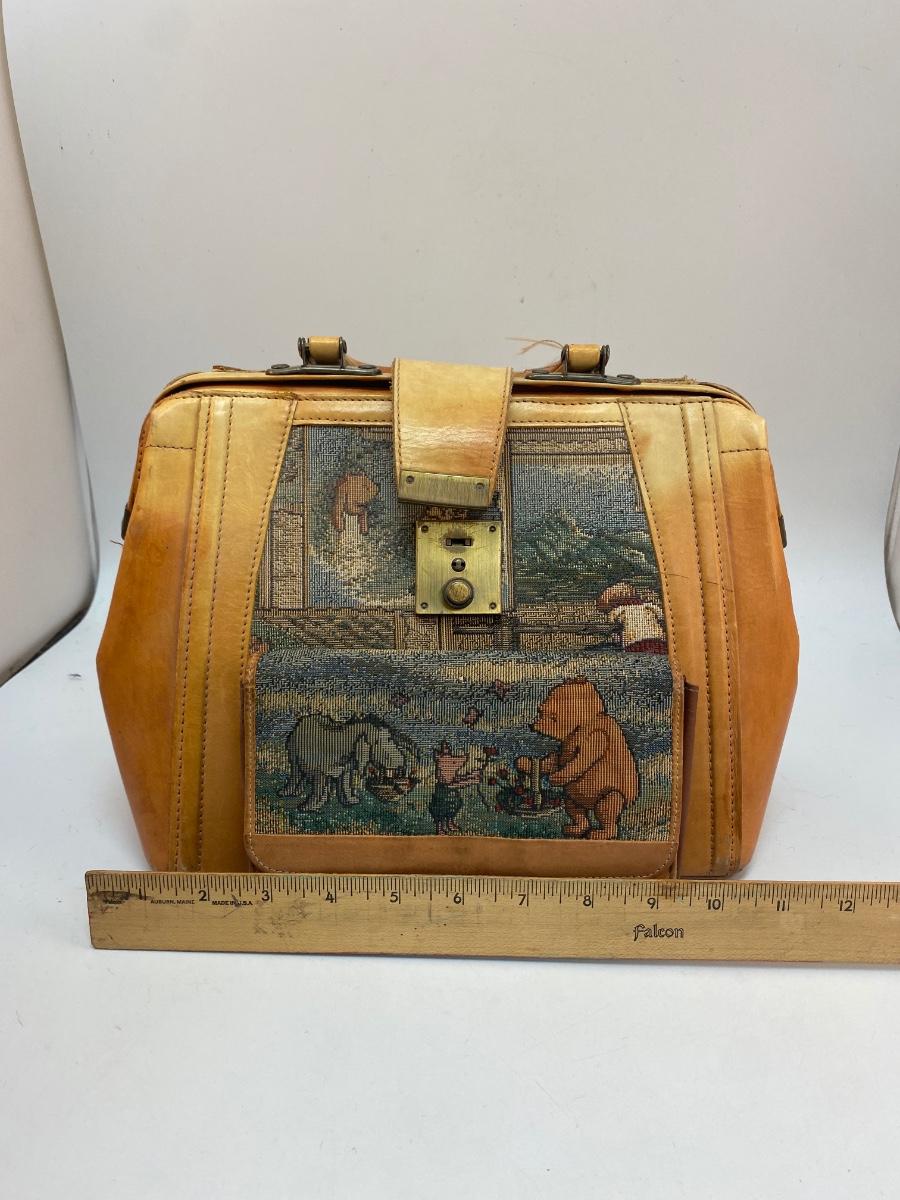 Vintage The Walt Disney Gallery Winnie the Pooh Leather Handbag with Matching Wallet. Both have signs of age and use. Leather is discolored. Not sure how to clean the material. See photos. Latch and hinges work nicely.
