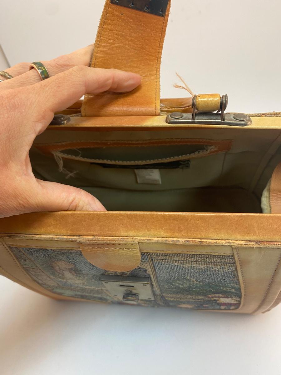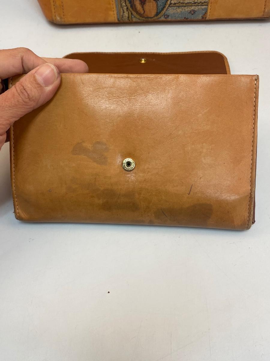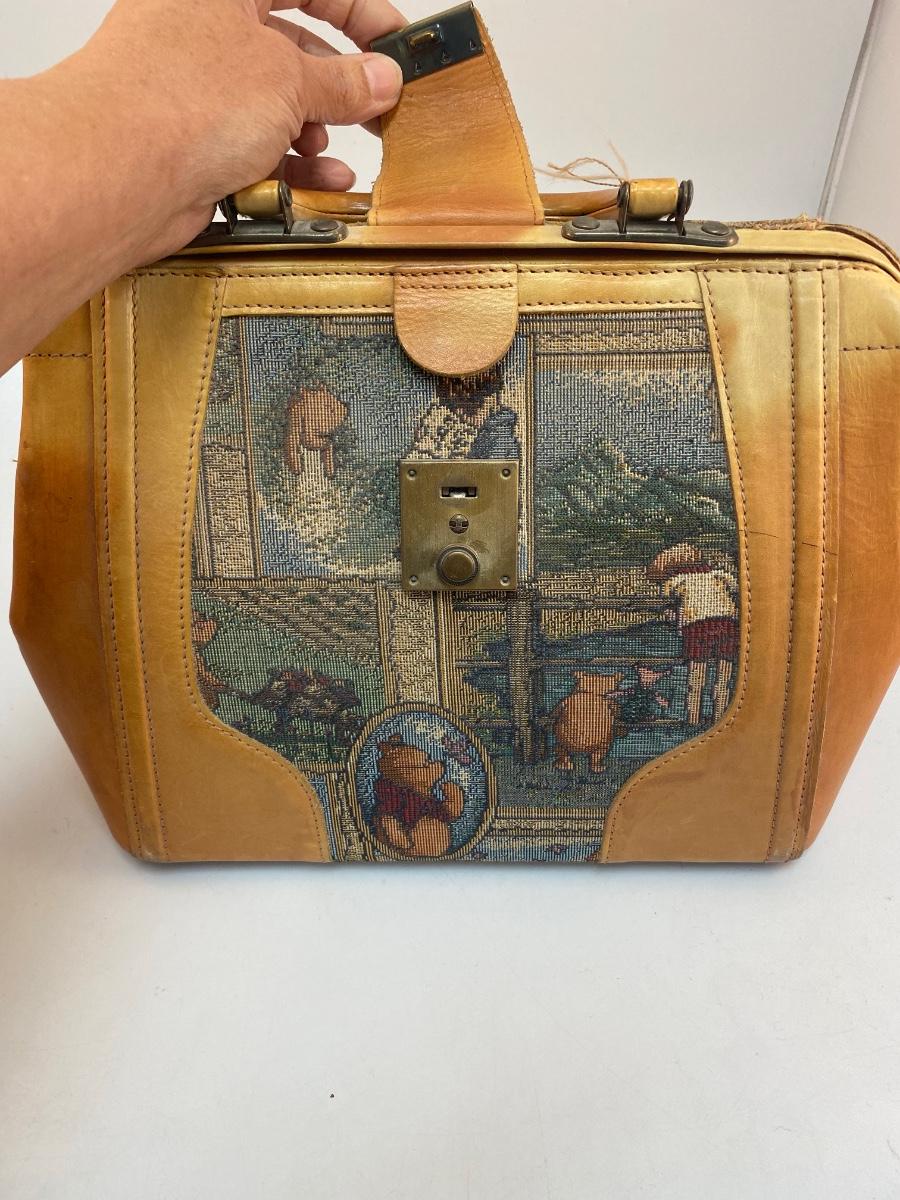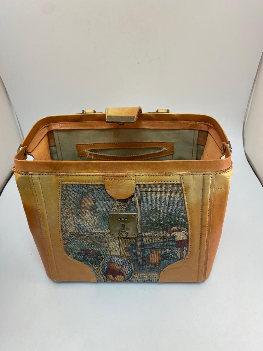 Vintage The Walt Disney Gallery Winnie the Pooh Leather Handbag with Matching Wallet. Both have signs of age and use. Leather is discolored. Not sure how to clean the material. See photos. Latch and hinges work nicely.
