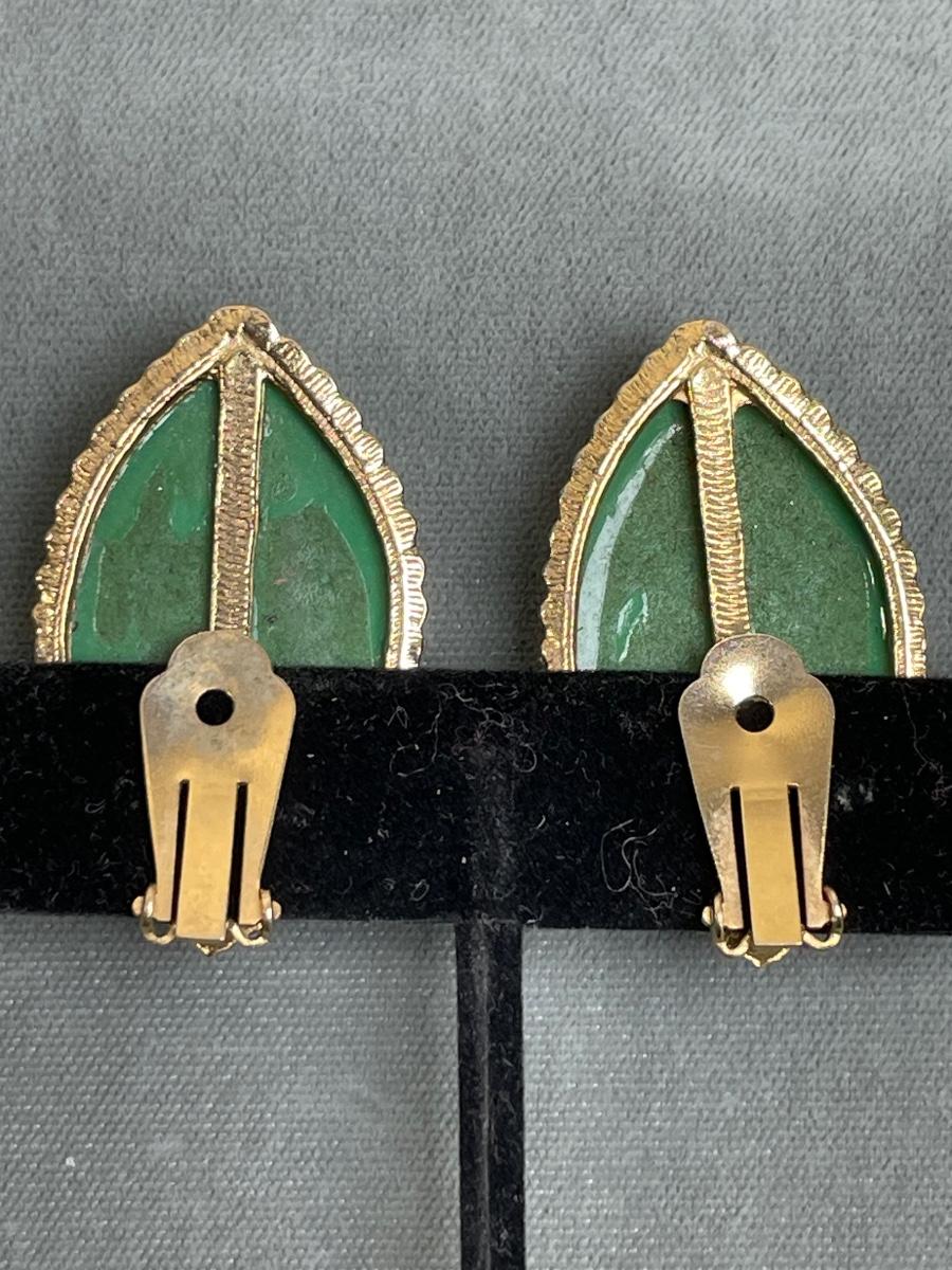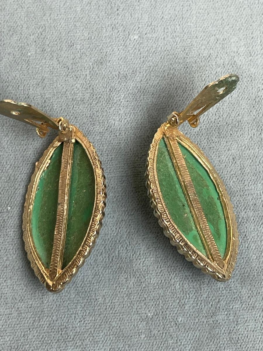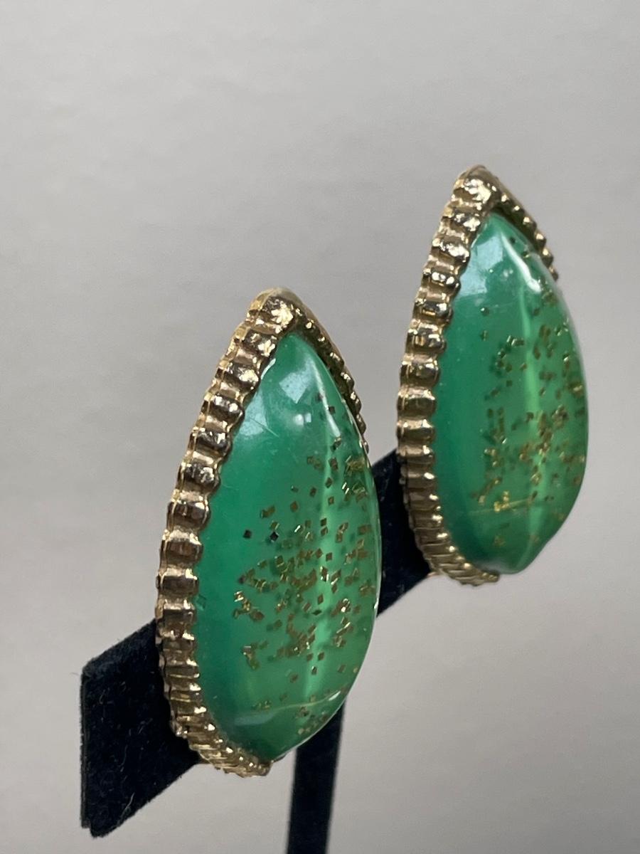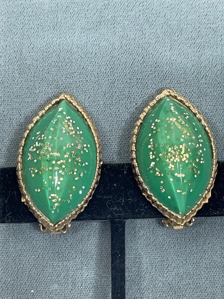In green with gold glitter flecks. 1 1/2” long clip ons.