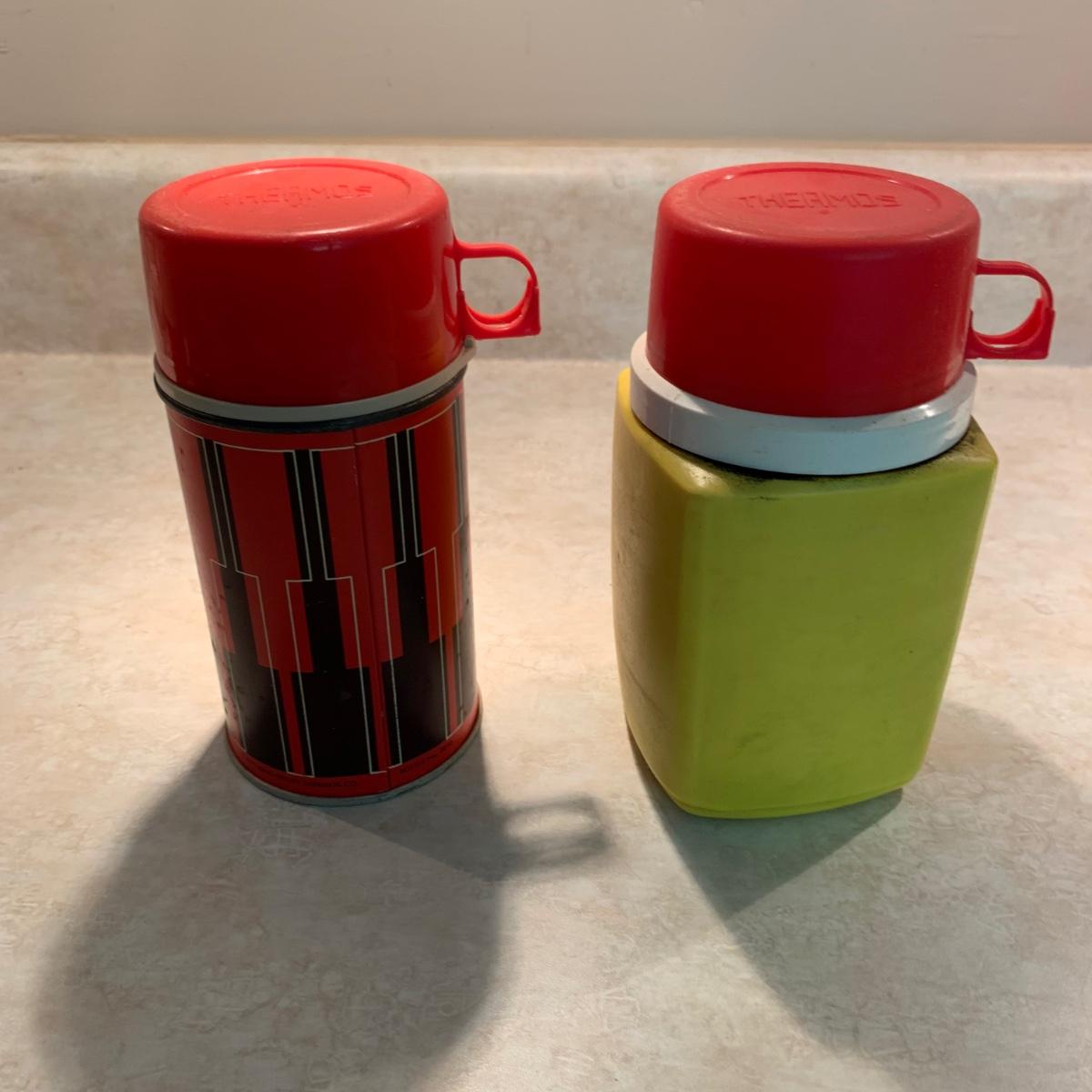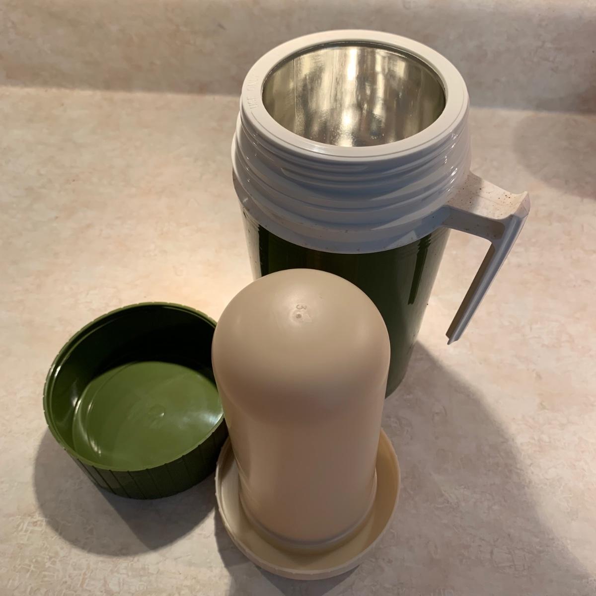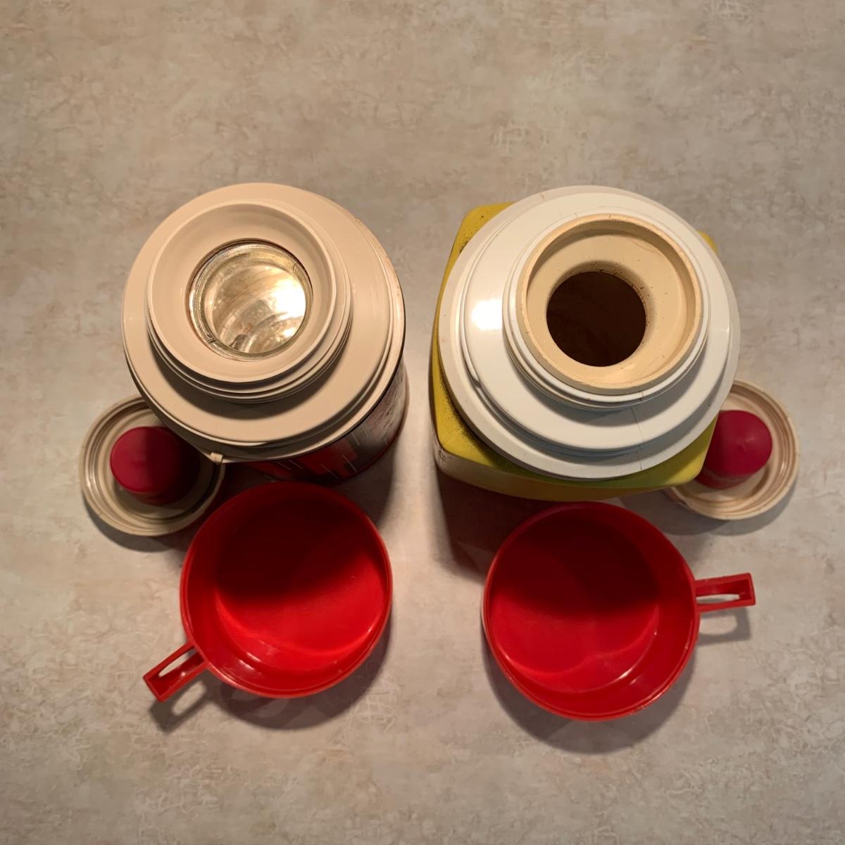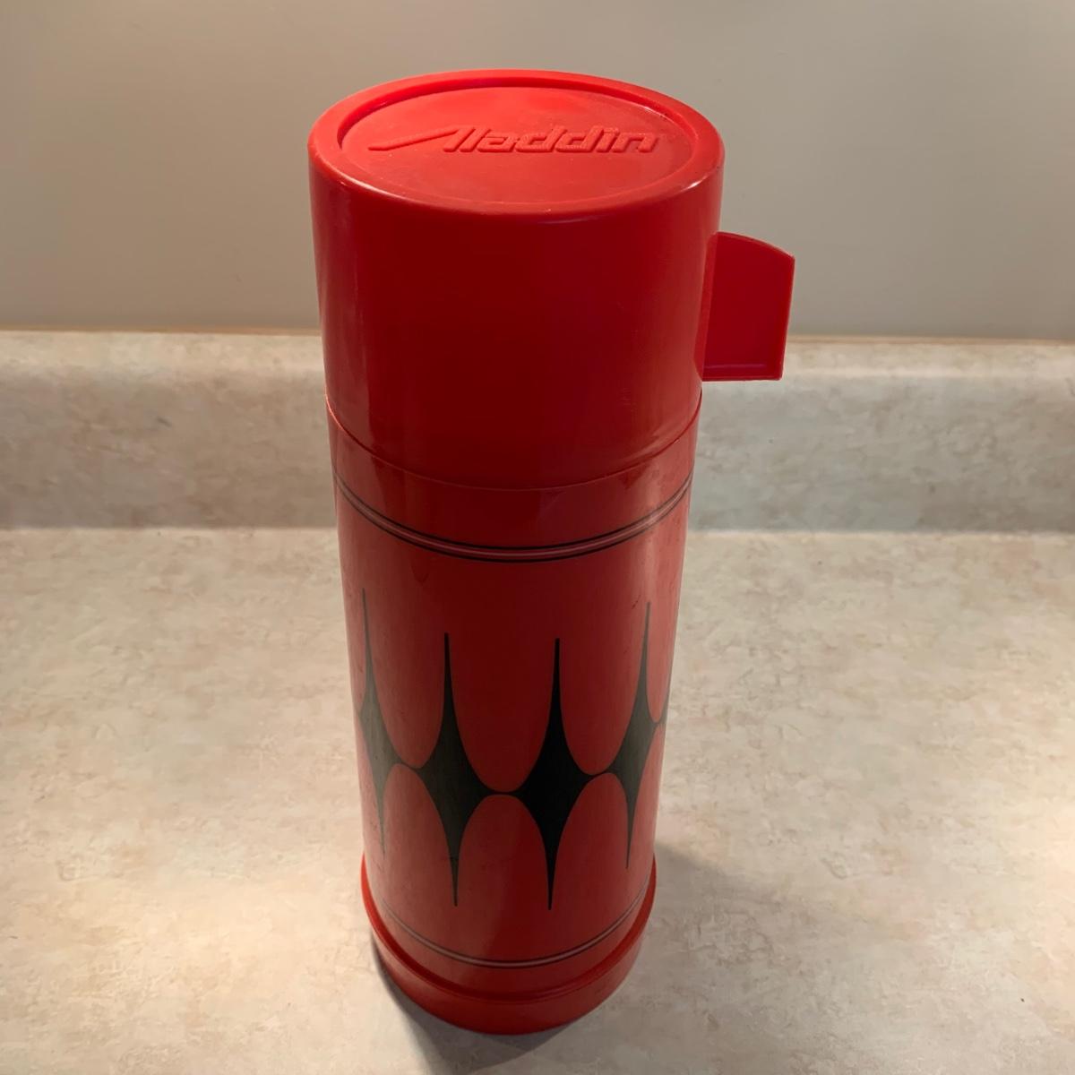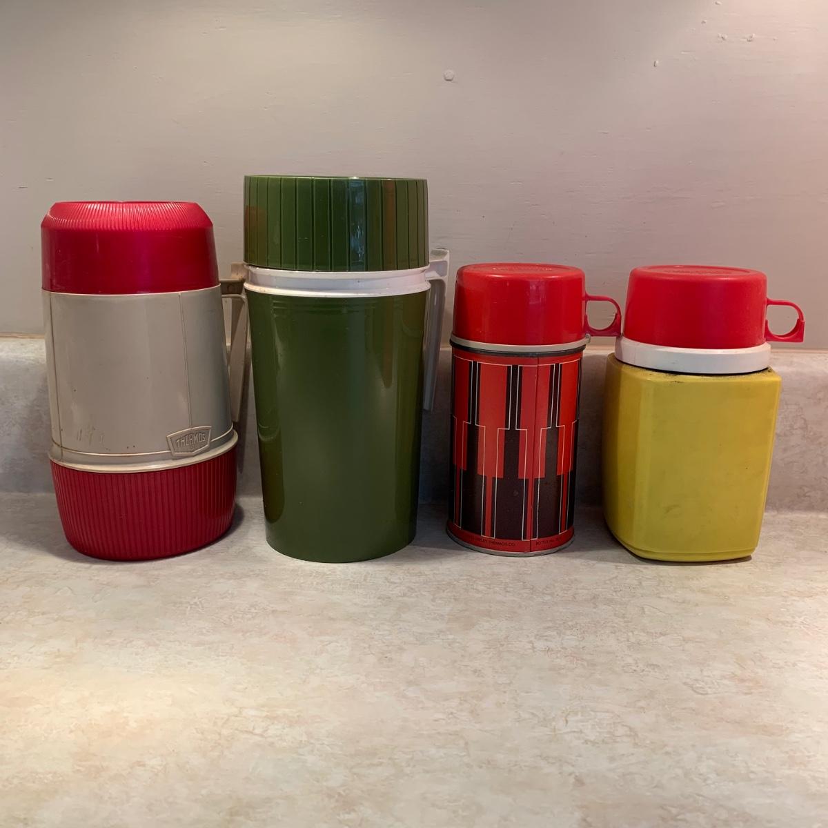 Vintage thermos lot includes six Thermos brand mugs and jars, one Aladdin brand Vanguard thermos bottle, and a Thermo Serv Insulated Coffee Maker. Five of the Thermos items are plastic, whereas the red and black one is a metal container. The Aladdin bottle is 12” tall and the small Thermos jars are 3.5” tall. The Thermo Serv Insulated Coffee Maker comes with filters and instructions. The items show some wear due to their age, but otherwise seem to be in very good condition. Shipping available.