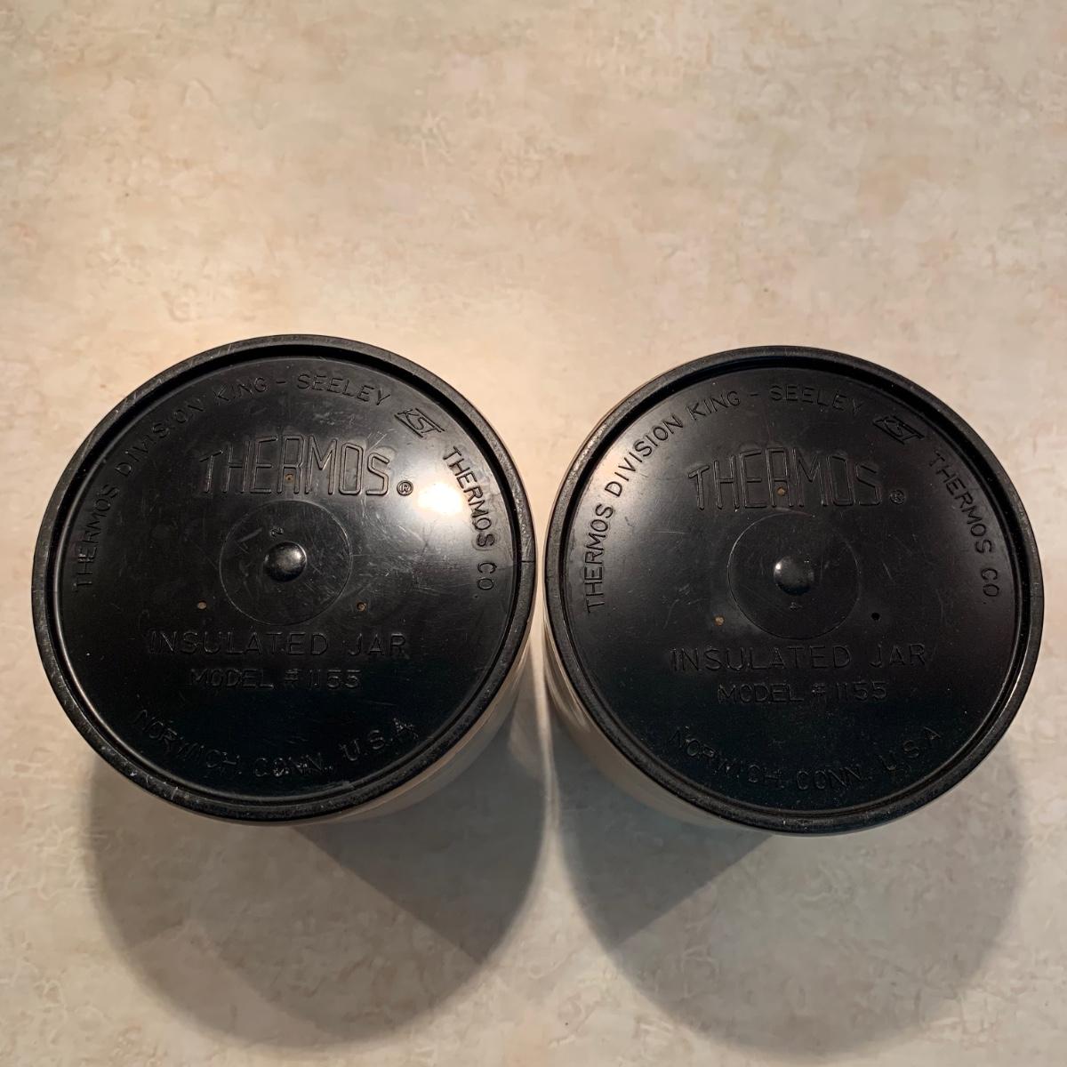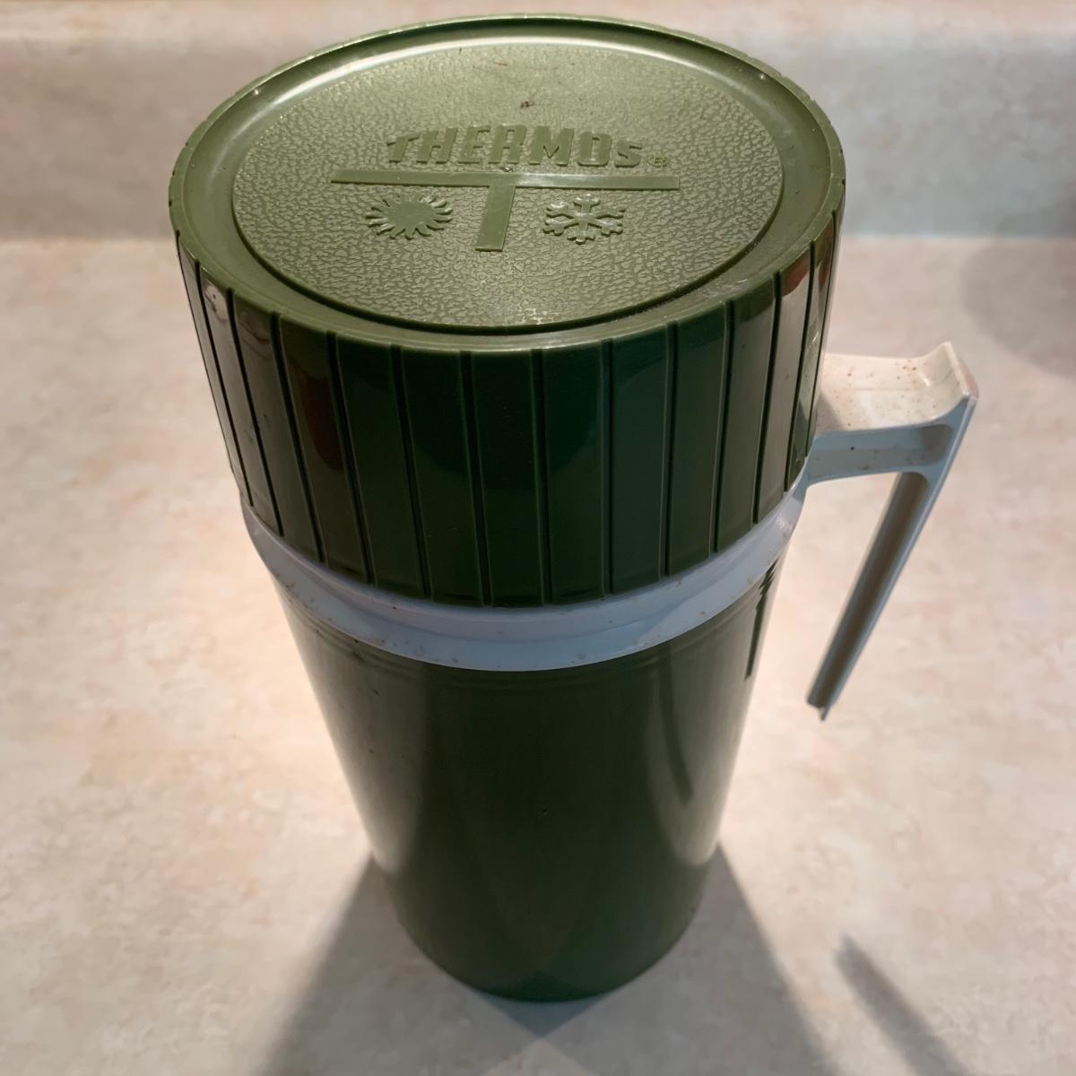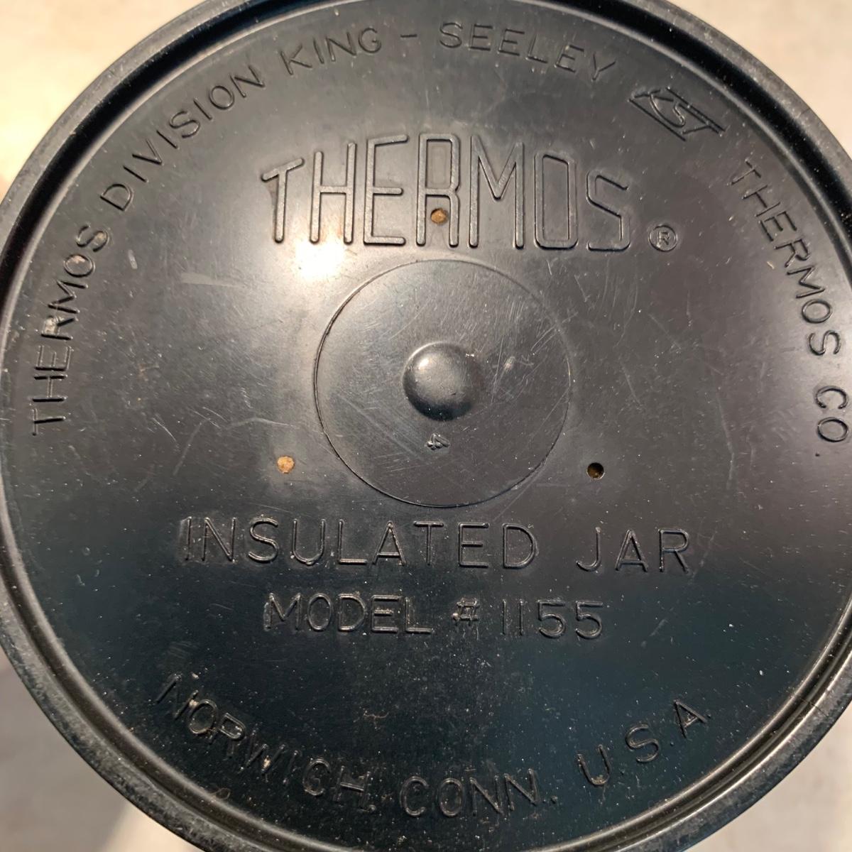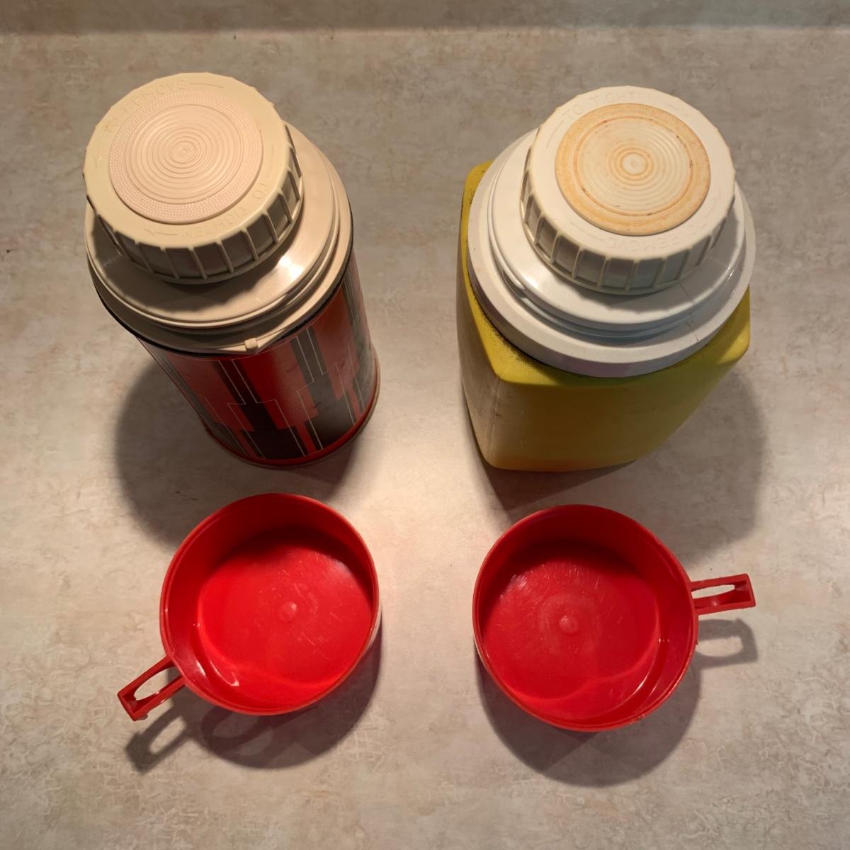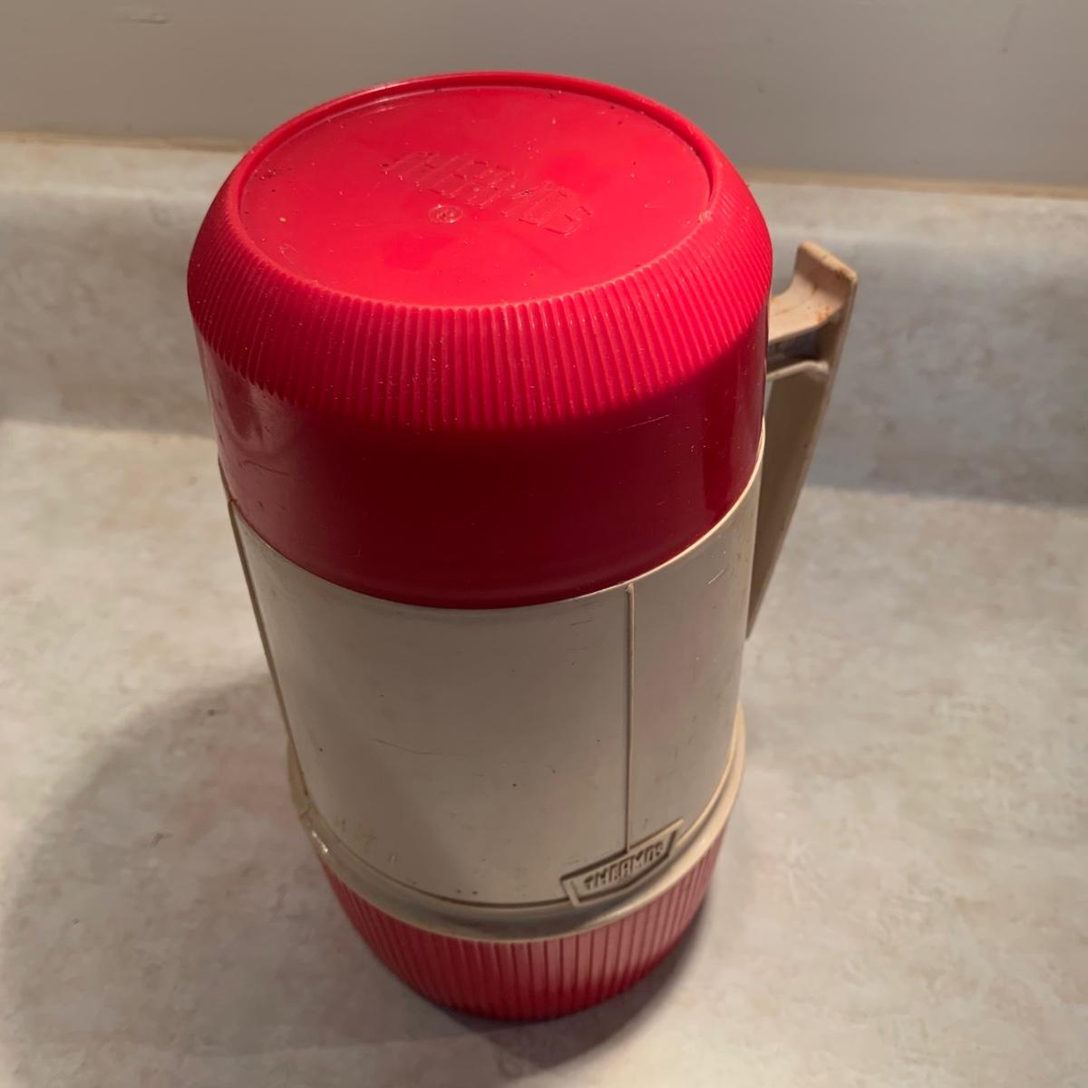 Vintage thermos lot includes six Thermos brand mugs and jars, one Aladdin brand Vanguard thermos bottle, and a Thermo Serv Insulated Coffee Maker. Five of the Thermos items are plastic, whereas the red and black one is a metal container. The Aladdin bottle is 12” tall and the small Thermos jars are 3.5” tall. The Thermo Serv Insulated Coffee Maker comes with filters and instructions. The items show some wear due to their age, but otherwise seem to be in very good condition. Shipping available.