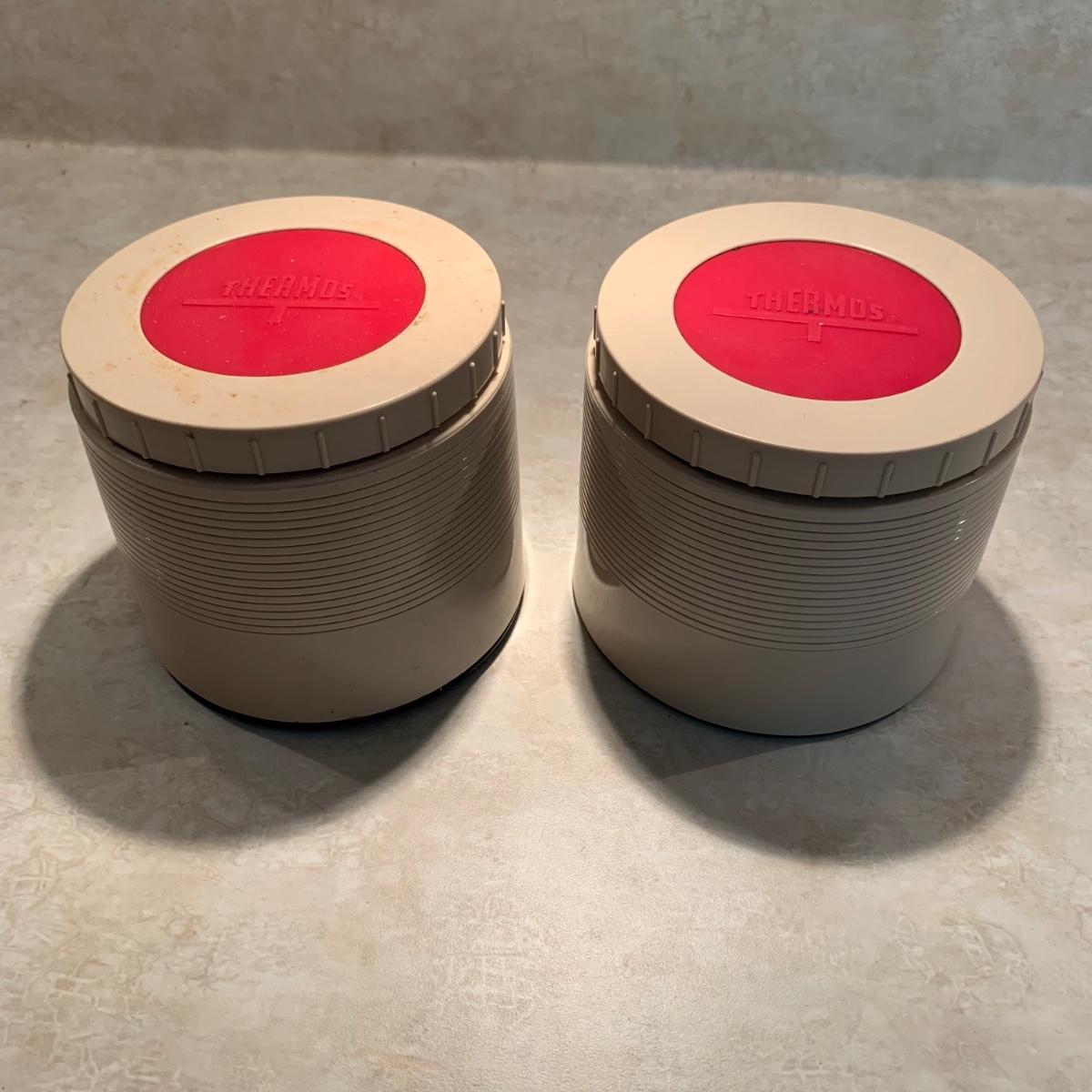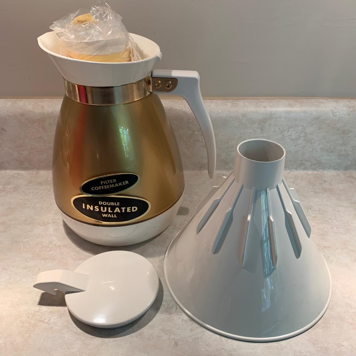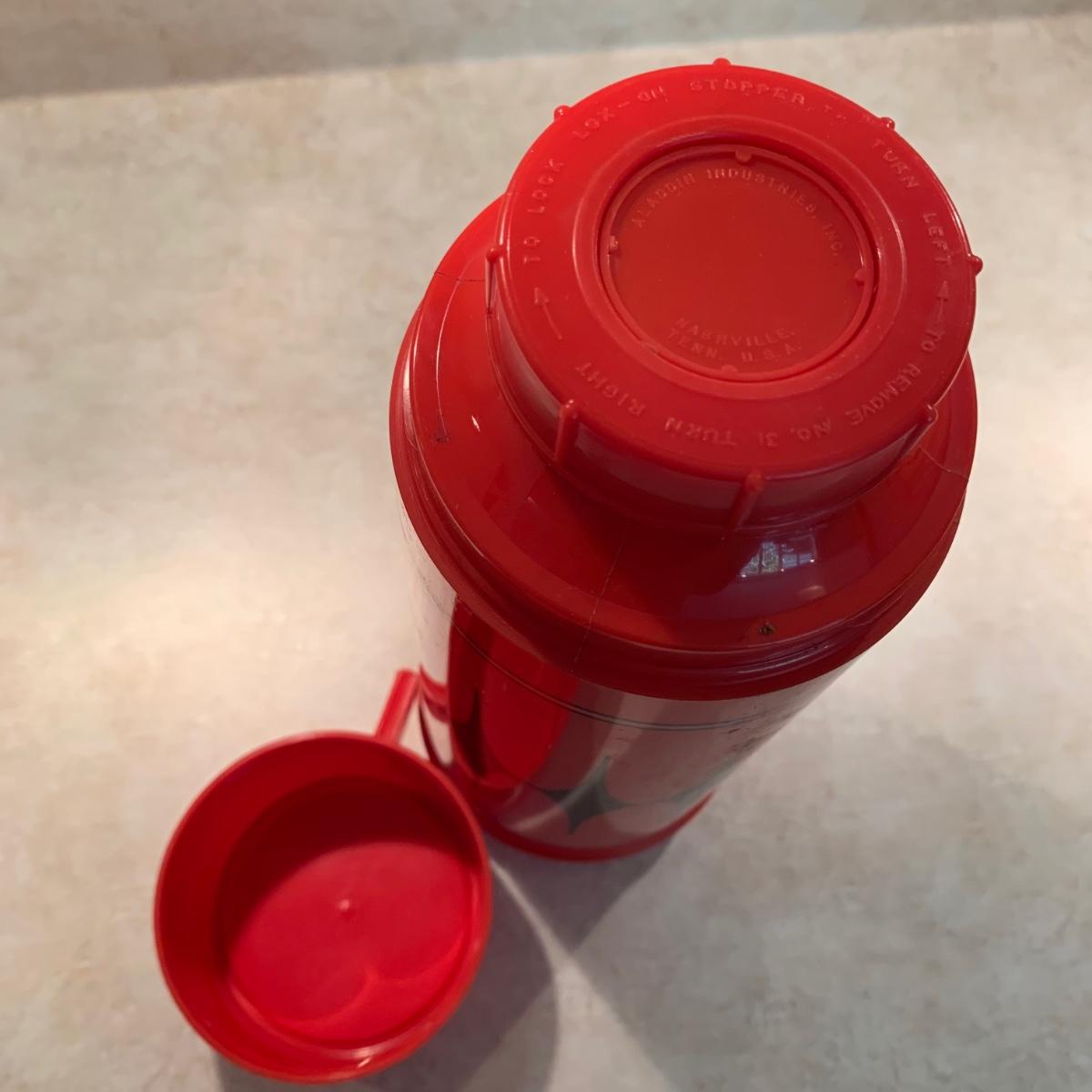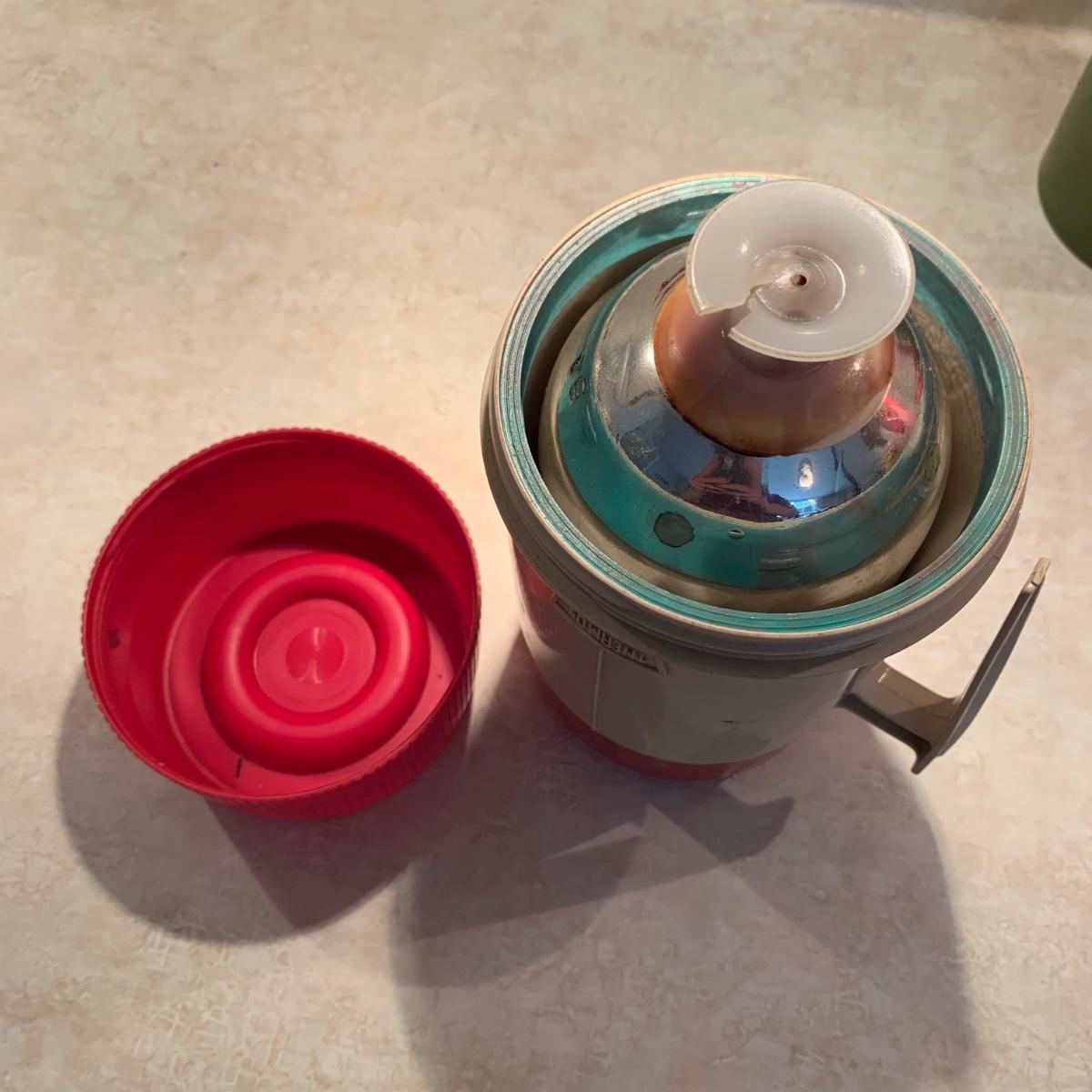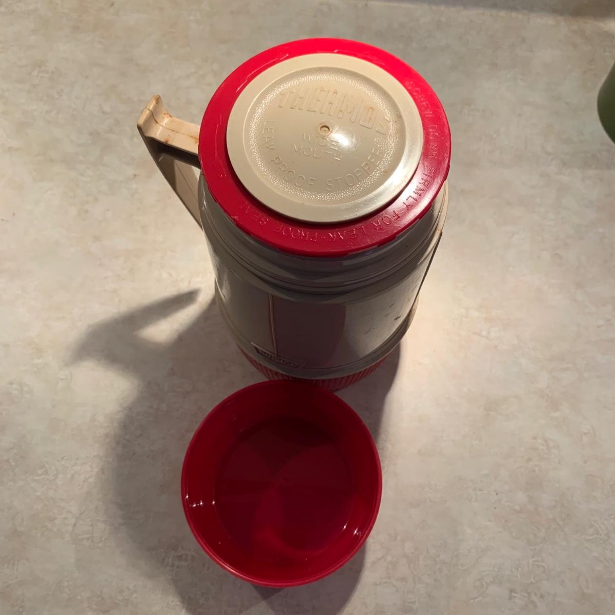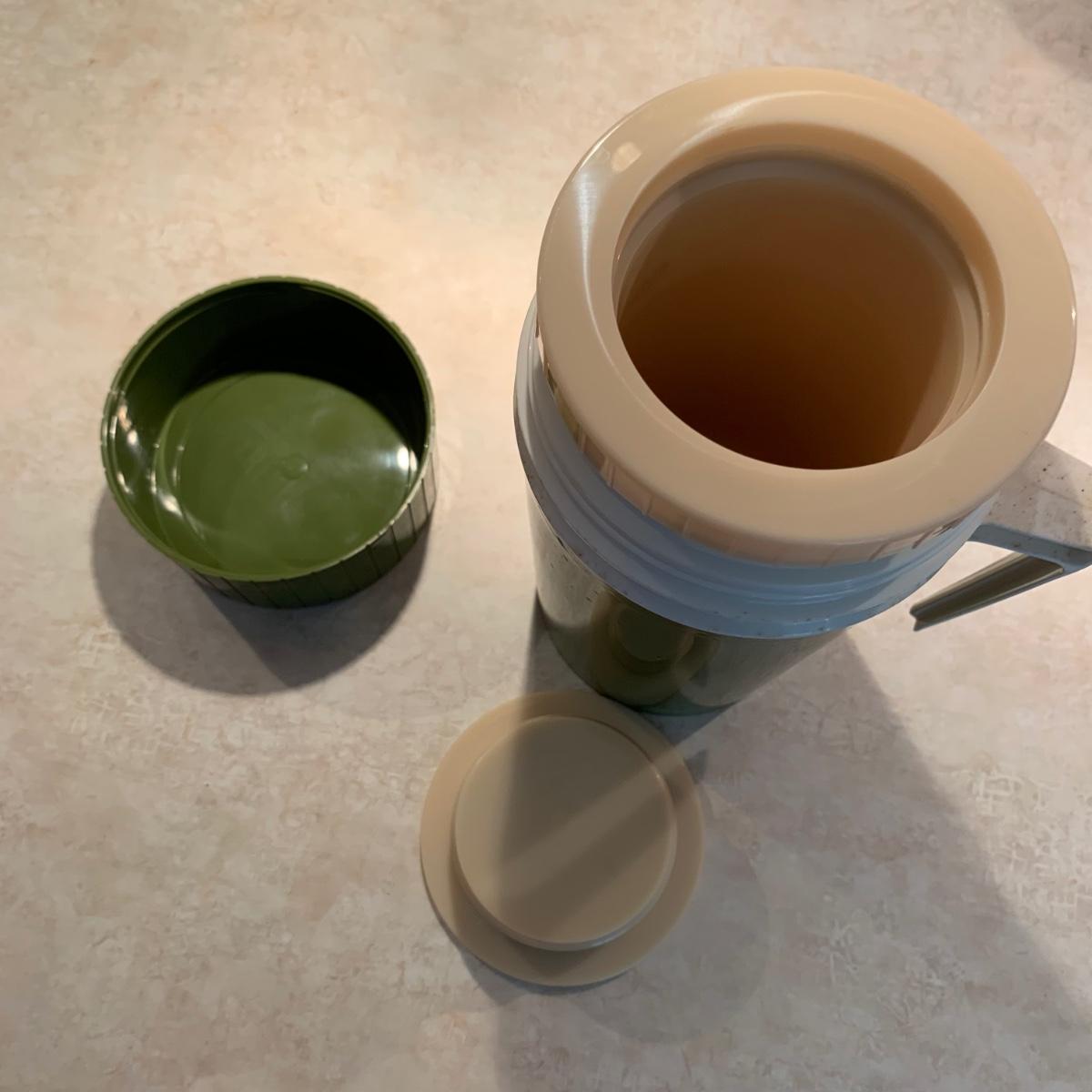 Vintage thermos lot includes six Thermos brand mugs and jars, one Aladdin brand Vanguard thermos bottle, and a Thermo Serv Insulated Coffee Maker. Five of the Thermos items are plastic, whereas the red and black one is a metal container. The Aladdin bottle is 12” tall and the small Thermos jars are 3.5” tall. The Thermo Serv Insulated Coffee Maker comes with filters and instructions. The items show some wear due to their age, but otherwise seem to be in very good condition. Shipping available.