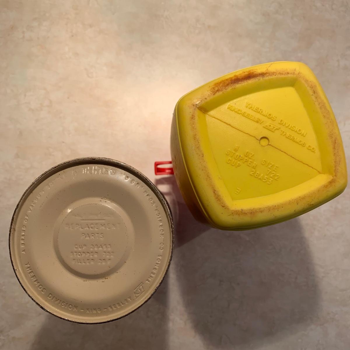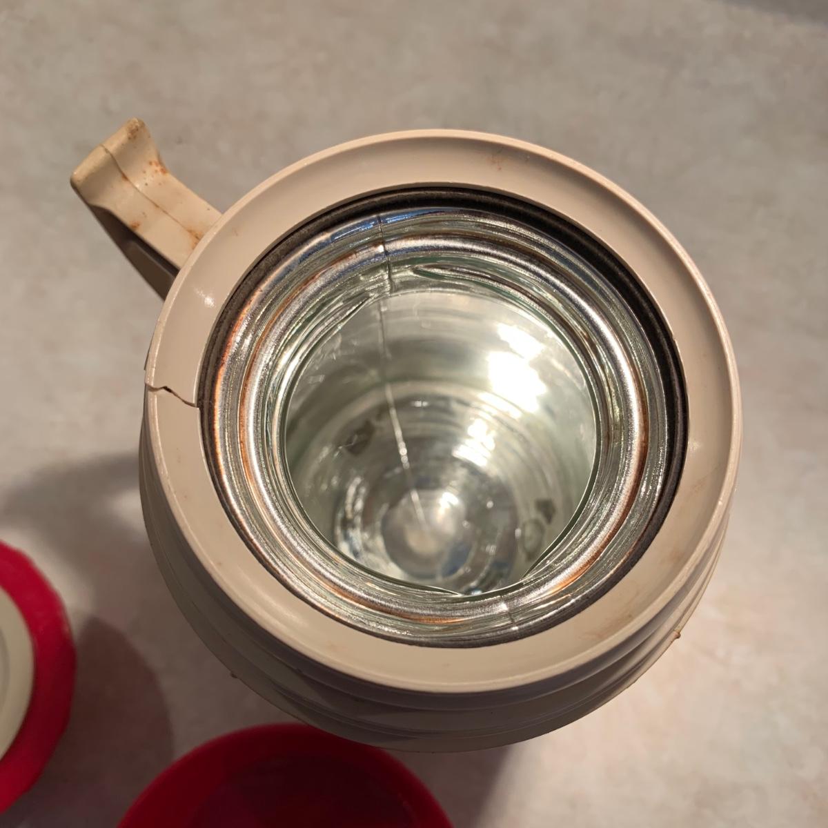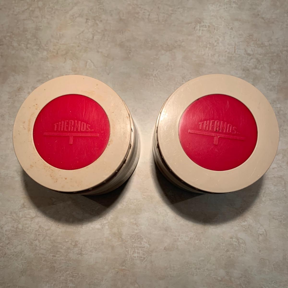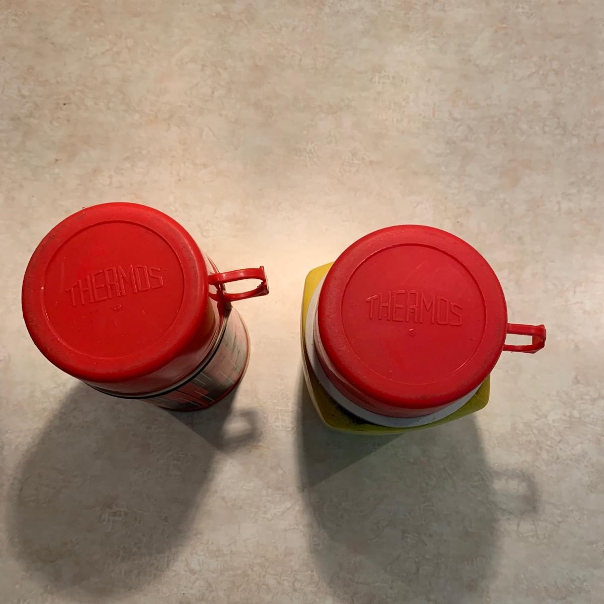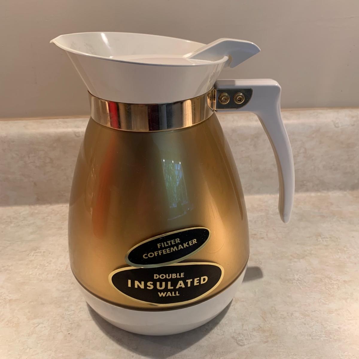 Vintage thermos lot includes six Thermos brand mugs and jars, one Aladdin brand Vanguard thermos bottle, and a Thermo Serv Insulated Coffee Maker. Five of the Thermos items are plastic, whereas the red and black one is a metal container. The Aladdin bottle is 12” tall and the small Thermos jars are 3.5” tall. The Thermo Serv Insulated Coffee Maker comes with filters and instructions. The items show some wear due to their age, but otherwise seem to be in very good condition. Shipping available.