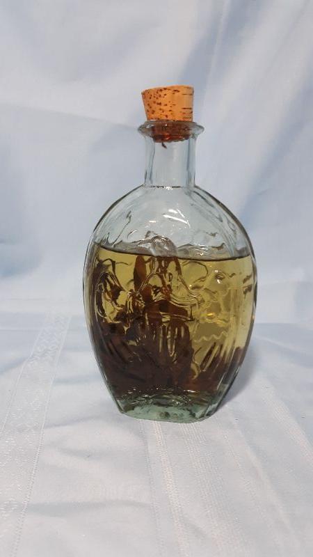 Vintage thick glass jar with cork top, eagle and cornucopia designs, must ship empty, 7"H