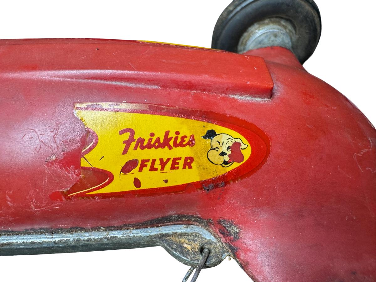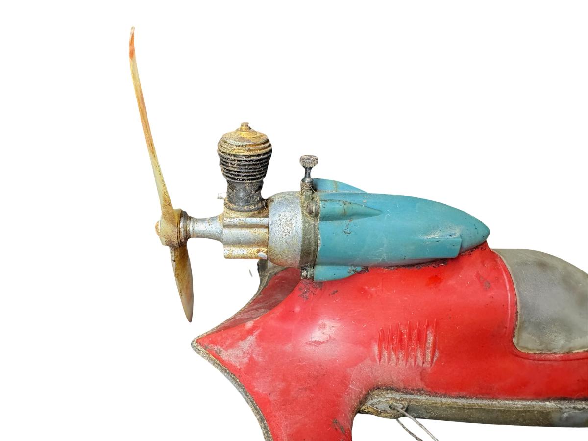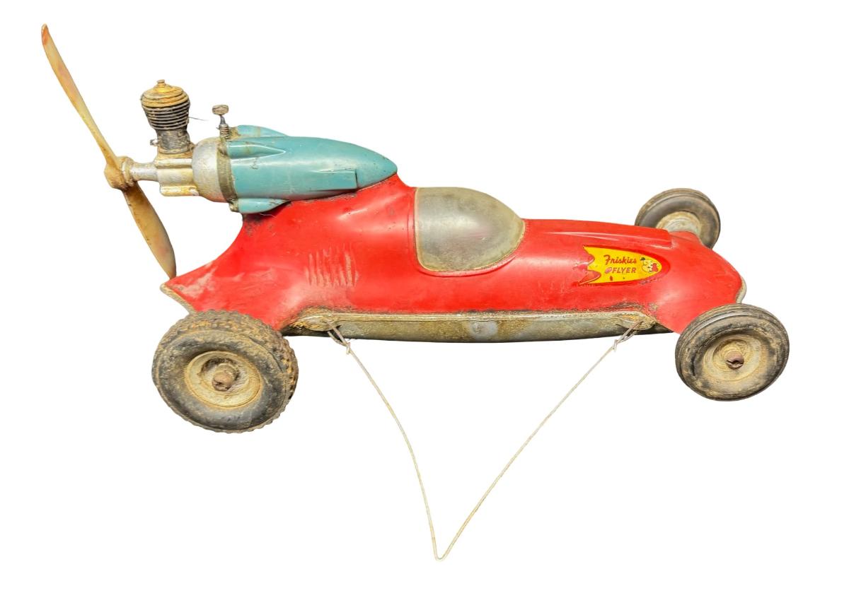 This is a vintage Roy Cox Thimble Drome “Prop Rod” pylon racing car. It has a late 1950s design, and is powered by a gas engine and propeller. It has a molded plastic body with solid rubber tires. There is use-related wear. Not tested. Measurement: 11”L. [JL]