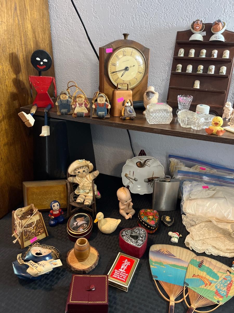 Vintage Baby Clothes, Thimbles, Trinket boxes, Clock.