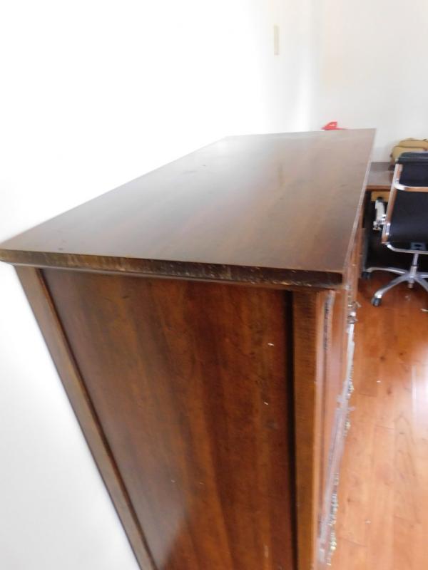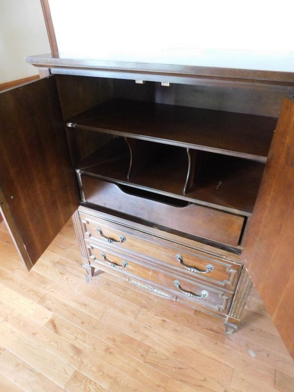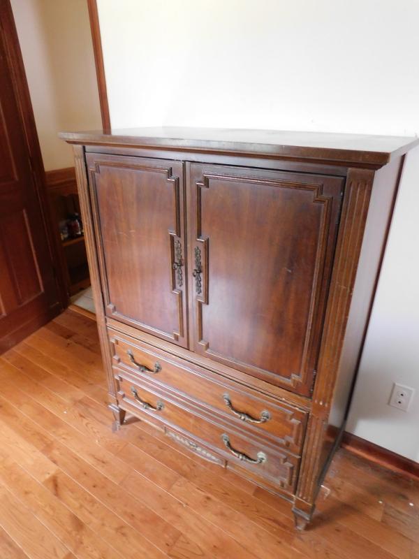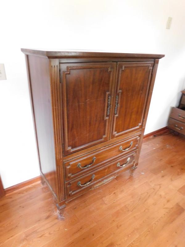 Vintage Thomasville Walnut Double Door Two Drawer Armoire with Gallery has some scratches and wear to the finish