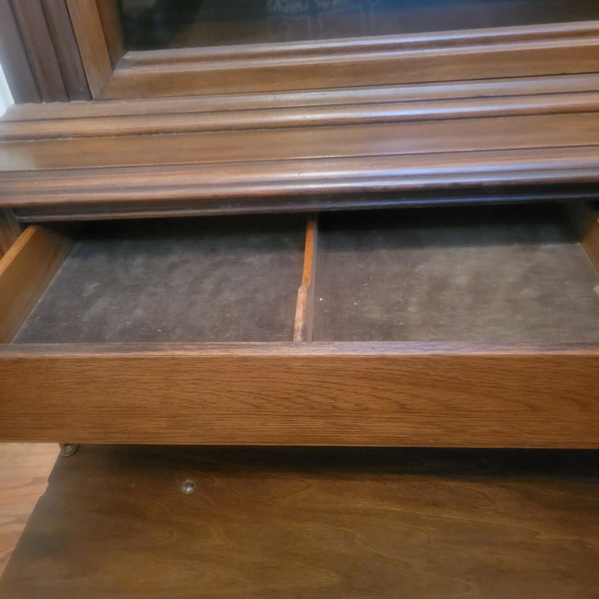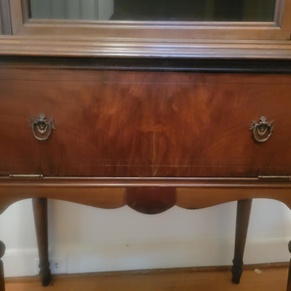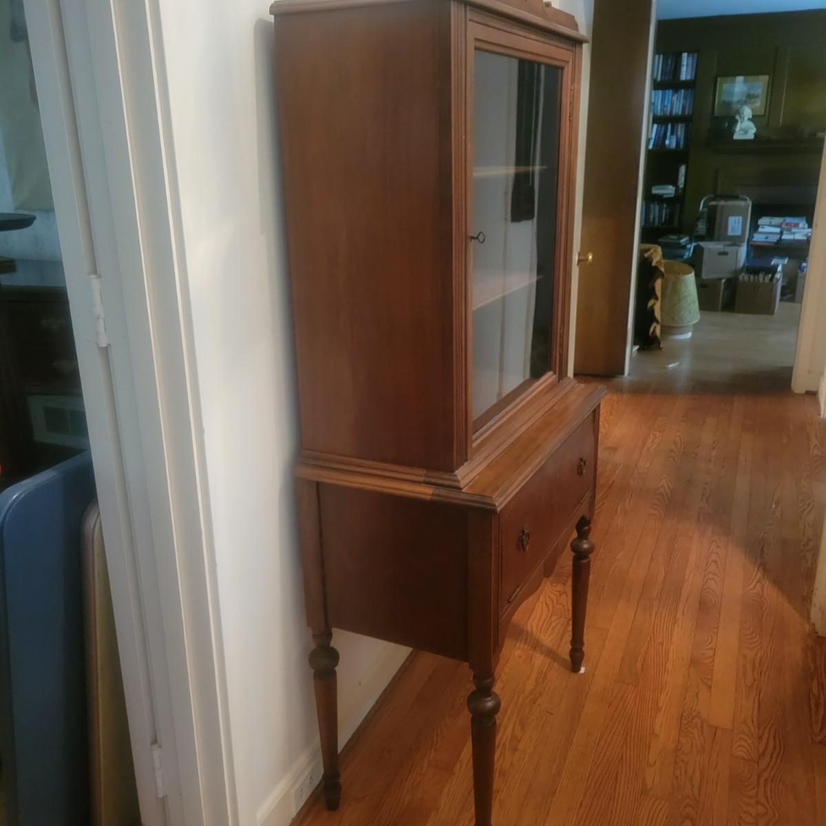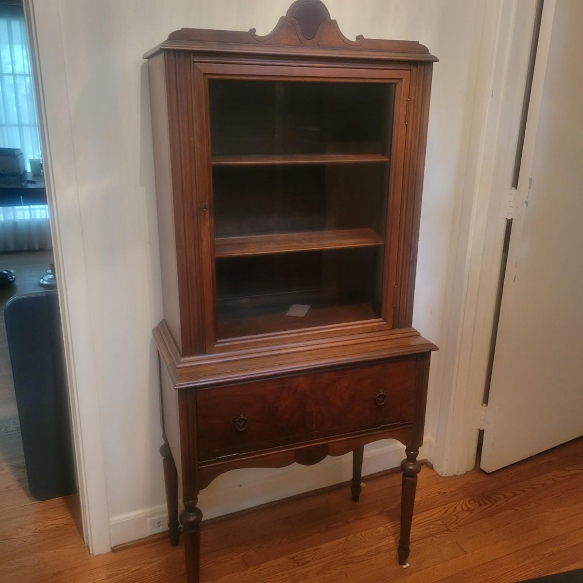 Vintage drop-down display cabinet manufactured by the Tomlinson Chair Mfg Co. based out of High Point, NC. Cabinet features 2 wooden shelves in its upper portion with grooves to display plates upright and a glass door with original key for locking. Lower portion appears to have a maple veneer with brass hardware. Pullout drawer is felt lined for silverware and has dovetailed joints. Display case is in good condition with no notable damage. Measures approximately 30" x 16" x 66". Local pickup only