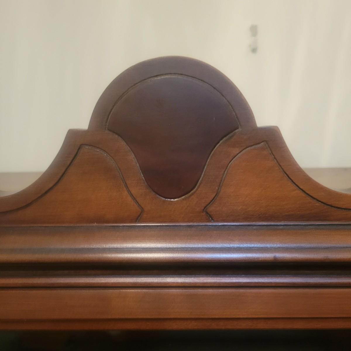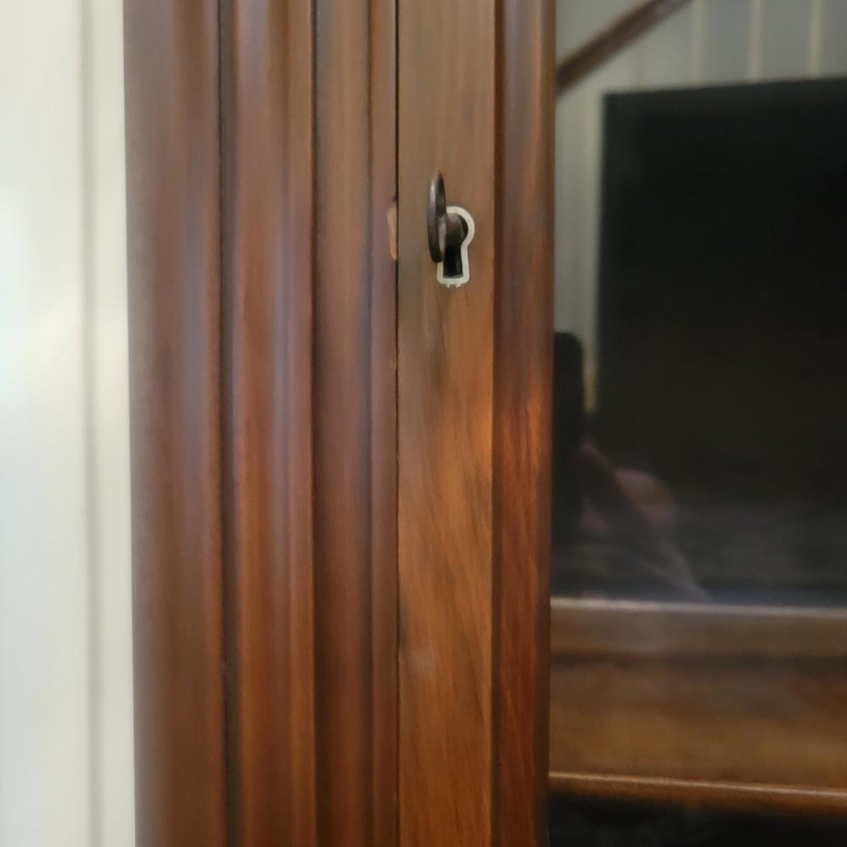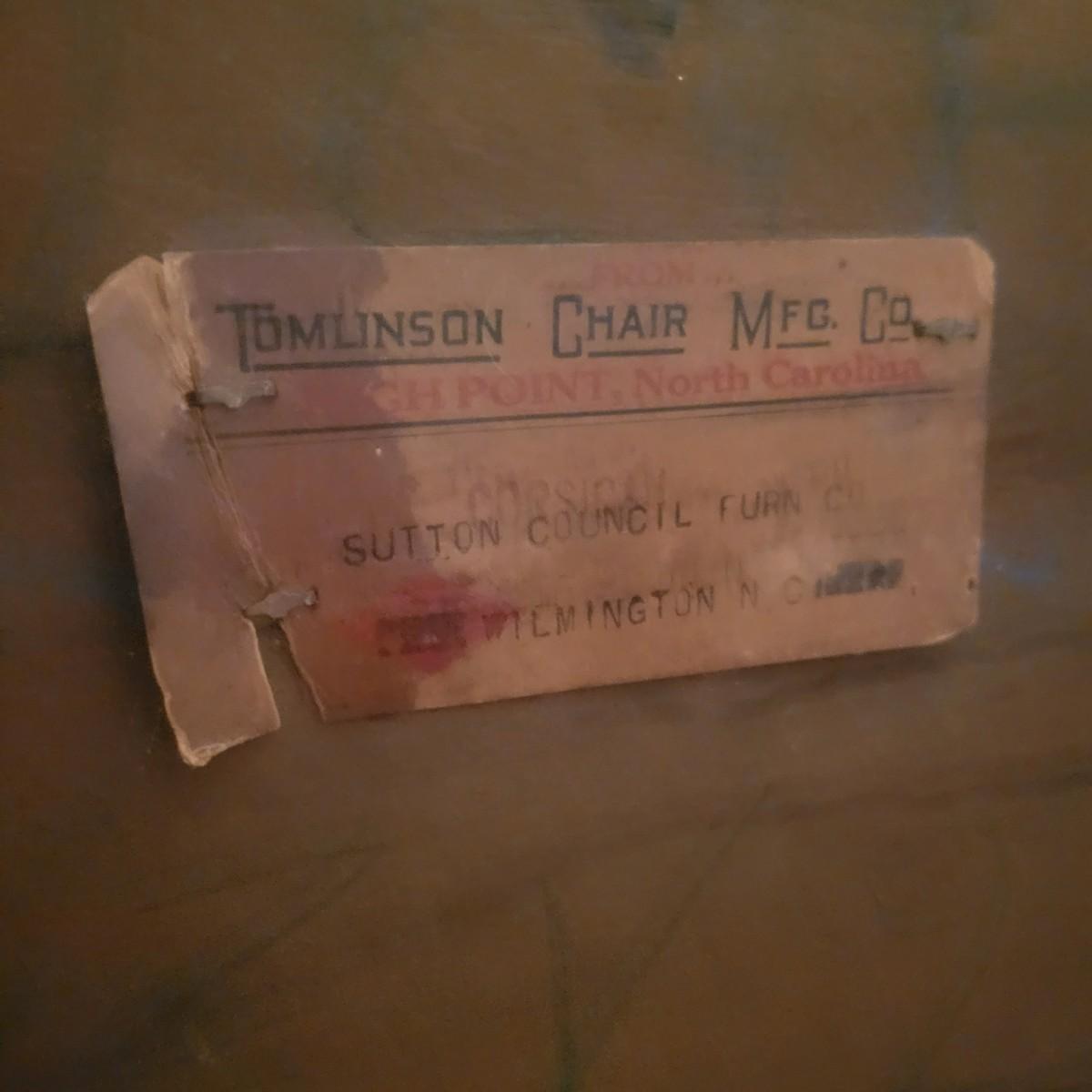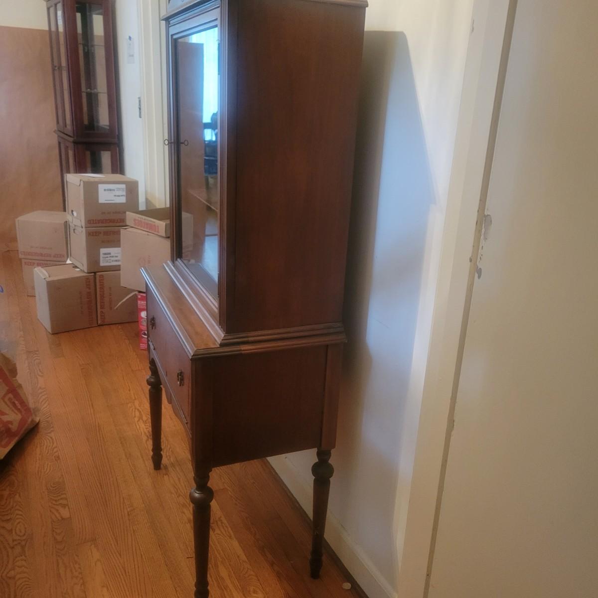 Vintage drop-down display cabinet manufactured by the Tomlinson Chair Mfg Co. based out of High Point, NC. Cabinet features 2 wooden shelves in its upper portion with grooves to display plates upright and a glass door with original key for locking. Lower portion appears to have a maple veneer with brass hardware. Pullout drawer is felt lined for silverware and has dovetailed joints. Display case is in good condition with no notable damage. Measures approximately 30" x 16" x 66". Local pickup only