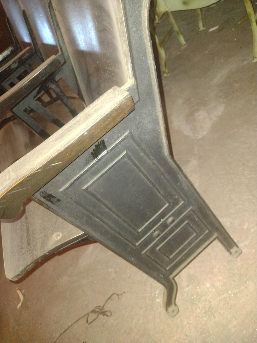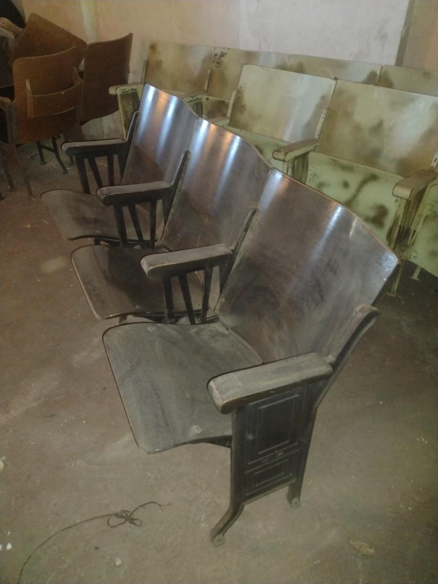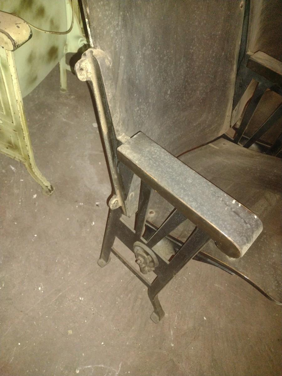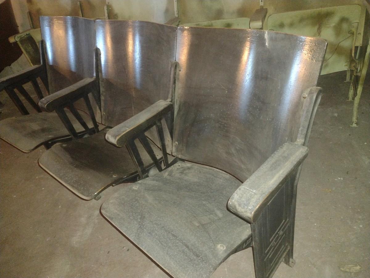 Vintage Three Chair Wood Theatre or Church Pew Seating with Flip Seat and Cast Base Choice A. Upstairs item. Bring assistance to remove from the store. Will need cleaning.
