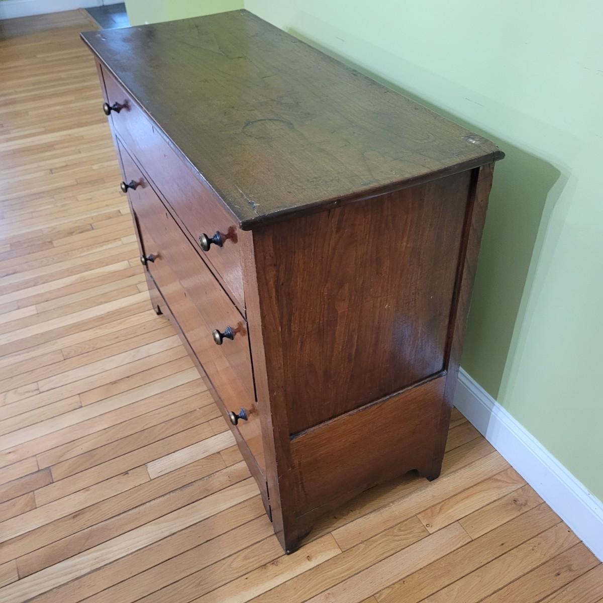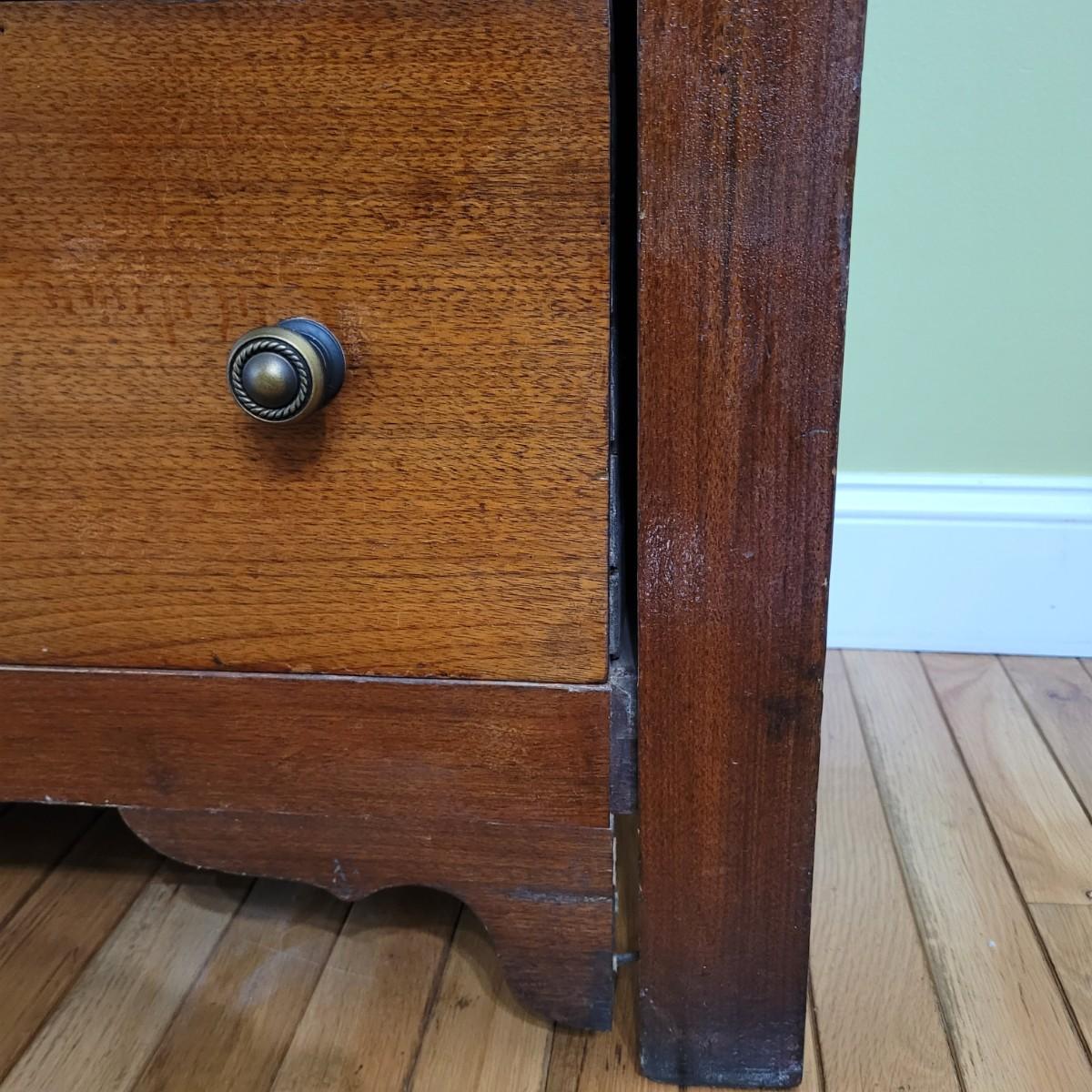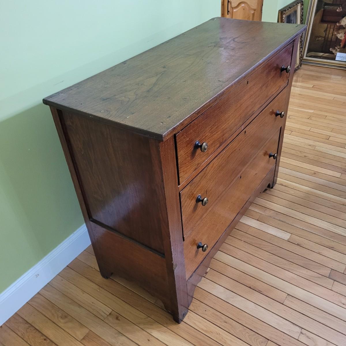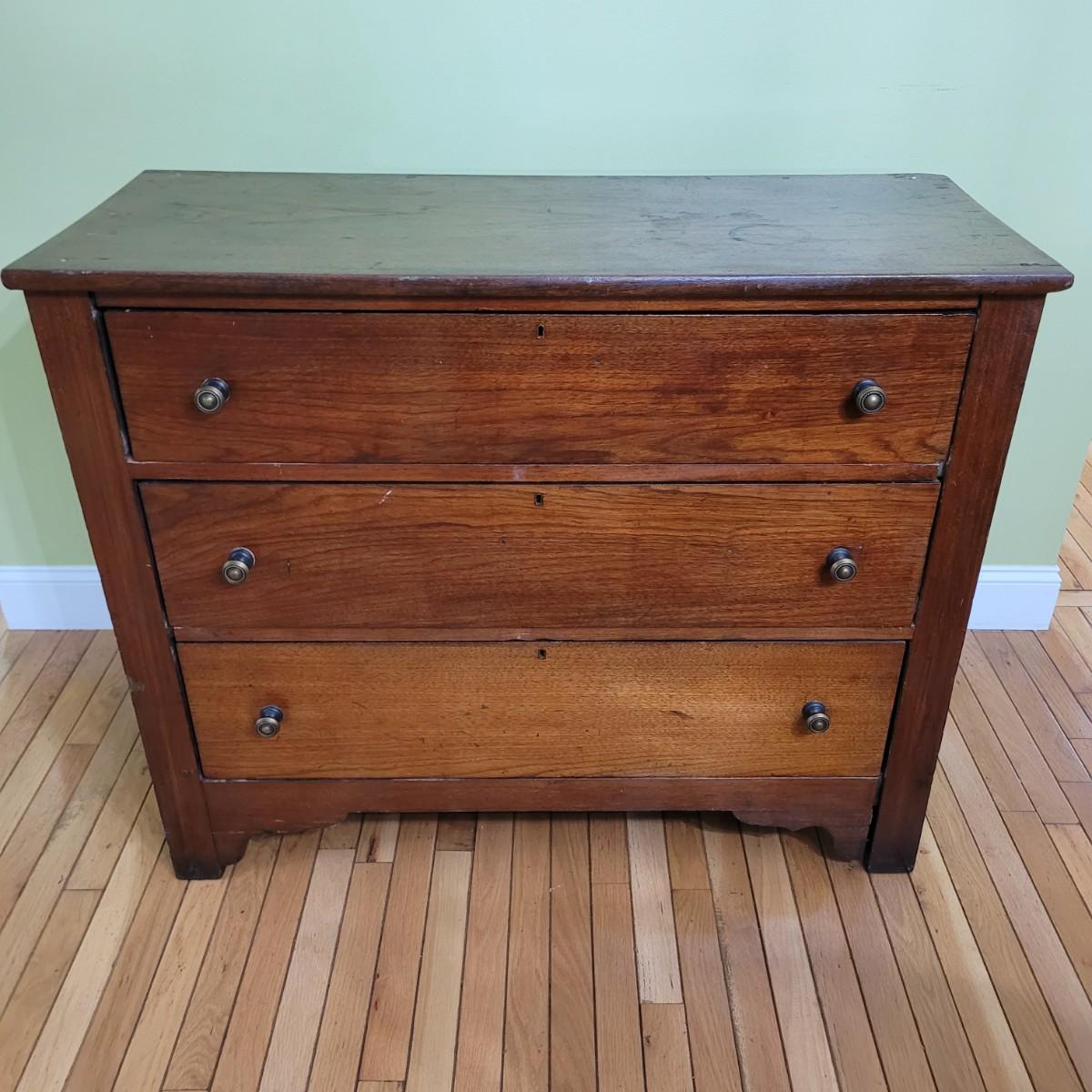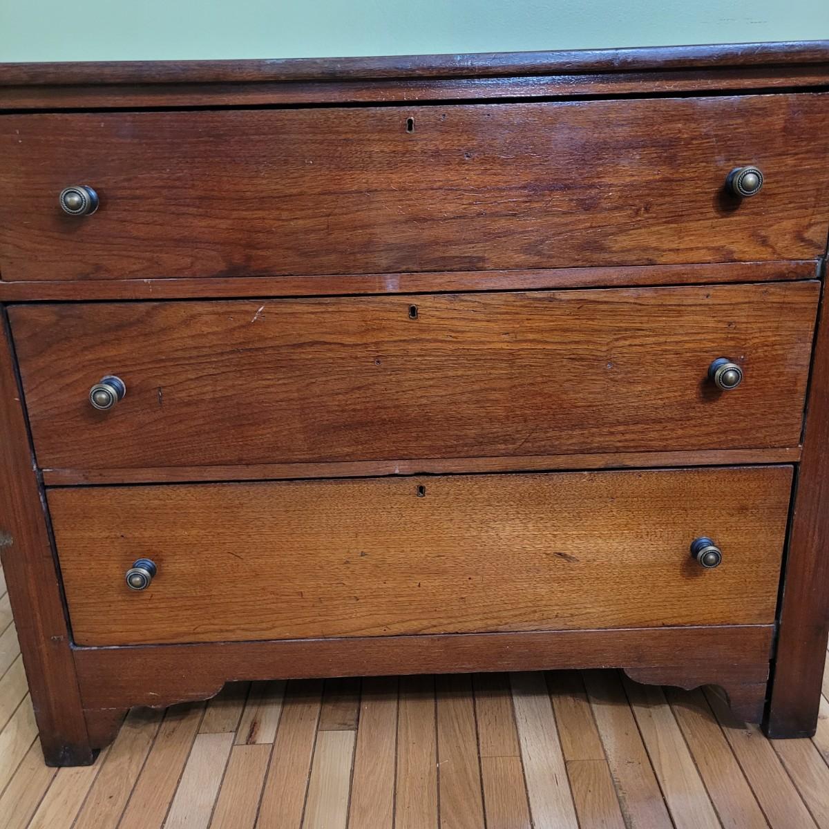 Solid wood dresser appears to be vintage in an early American style with metal knobs and keyholes. It has three sliding dovetailed drawers. The drawers do not have guide rails and move freely. The right side is pushed out slightly and shows exposed nails, but appears to be repairable. Dresser measures 42.5" x 18" x 35"H. Some overall wear due to age. Please see photos for details. This item is located on the ground floor with two steps down from the porch.