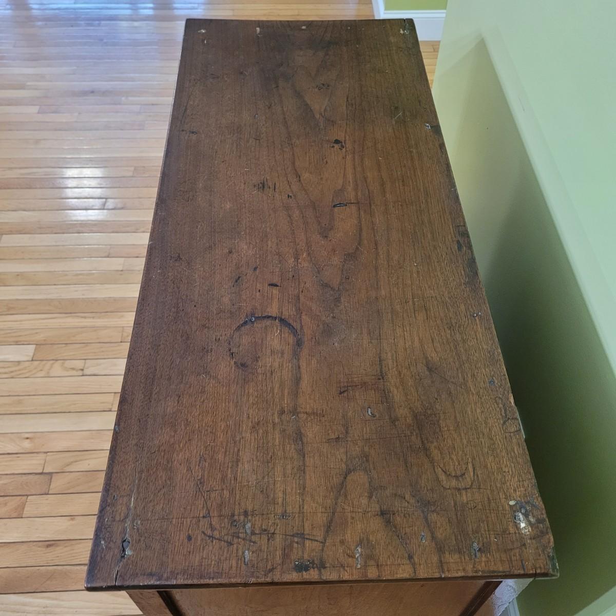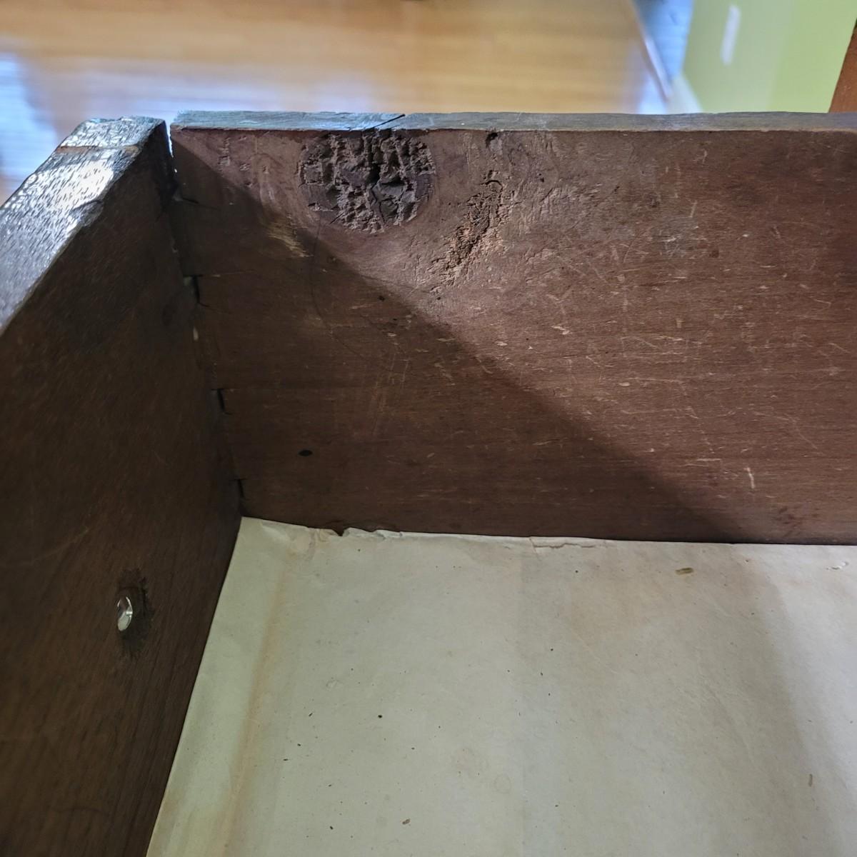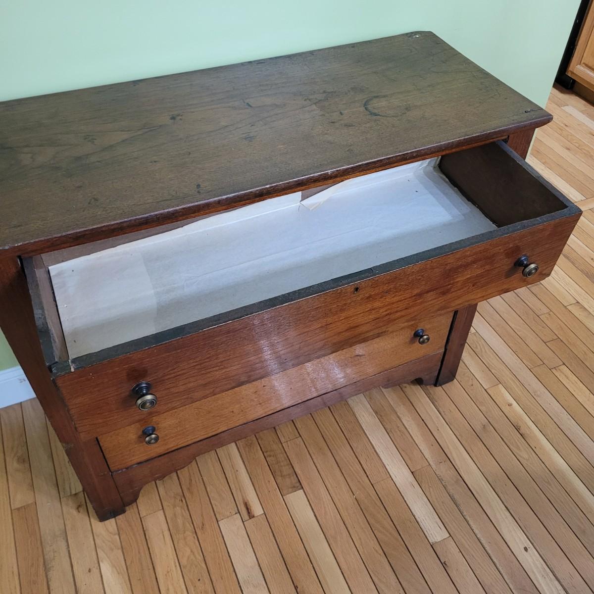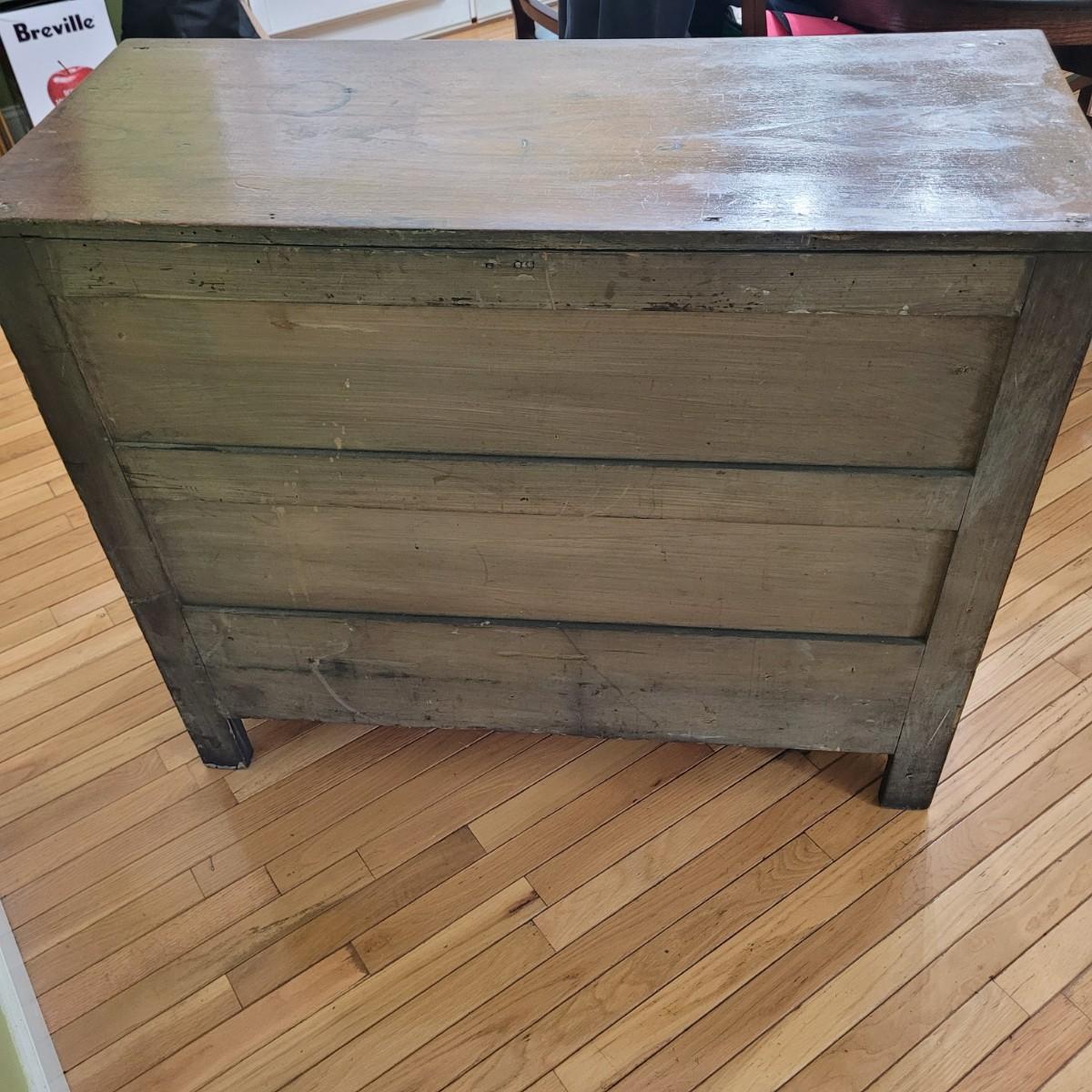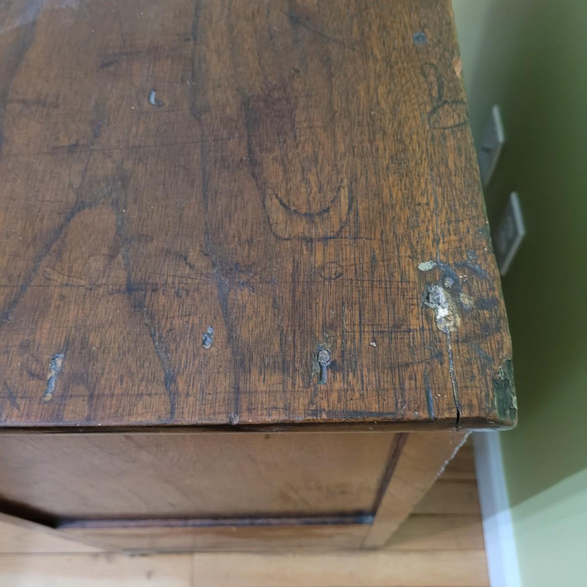 Solid wood dresser appears to be vintage in an early American style with metal knobs and keyholes. It has three sliding dovetailed drawers. The drawers do not have guide rails and move freely. The right side is pushed out slightly and shows exposed nails, but appears to be repairable. Dresser measures 42.5" x 18" x 35"H. Some overall wear due to age. Please see photos for details. This item is located on the ground floor with two steps down from the porch.