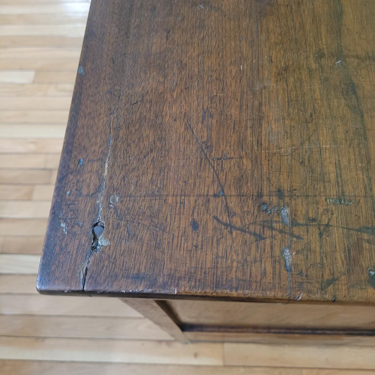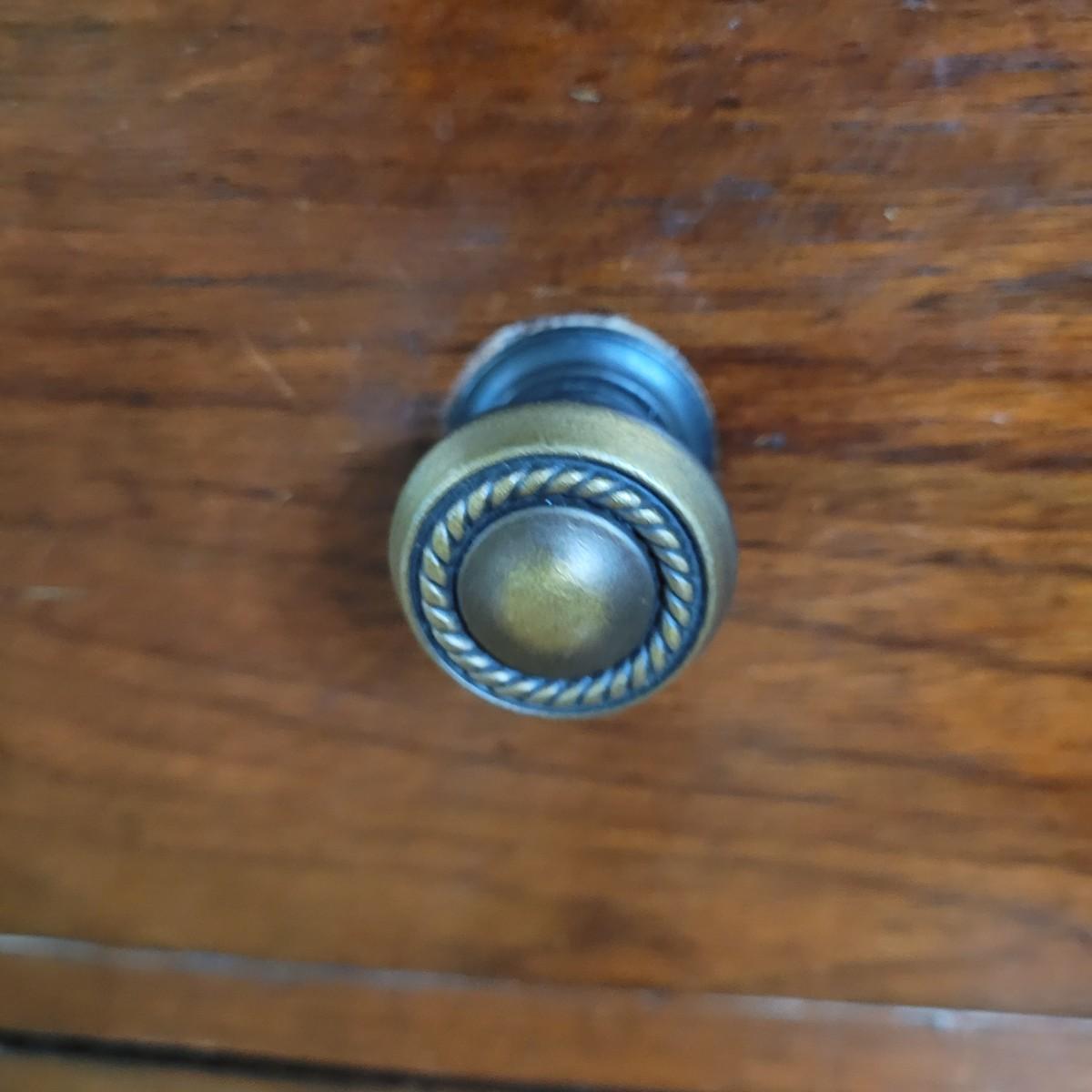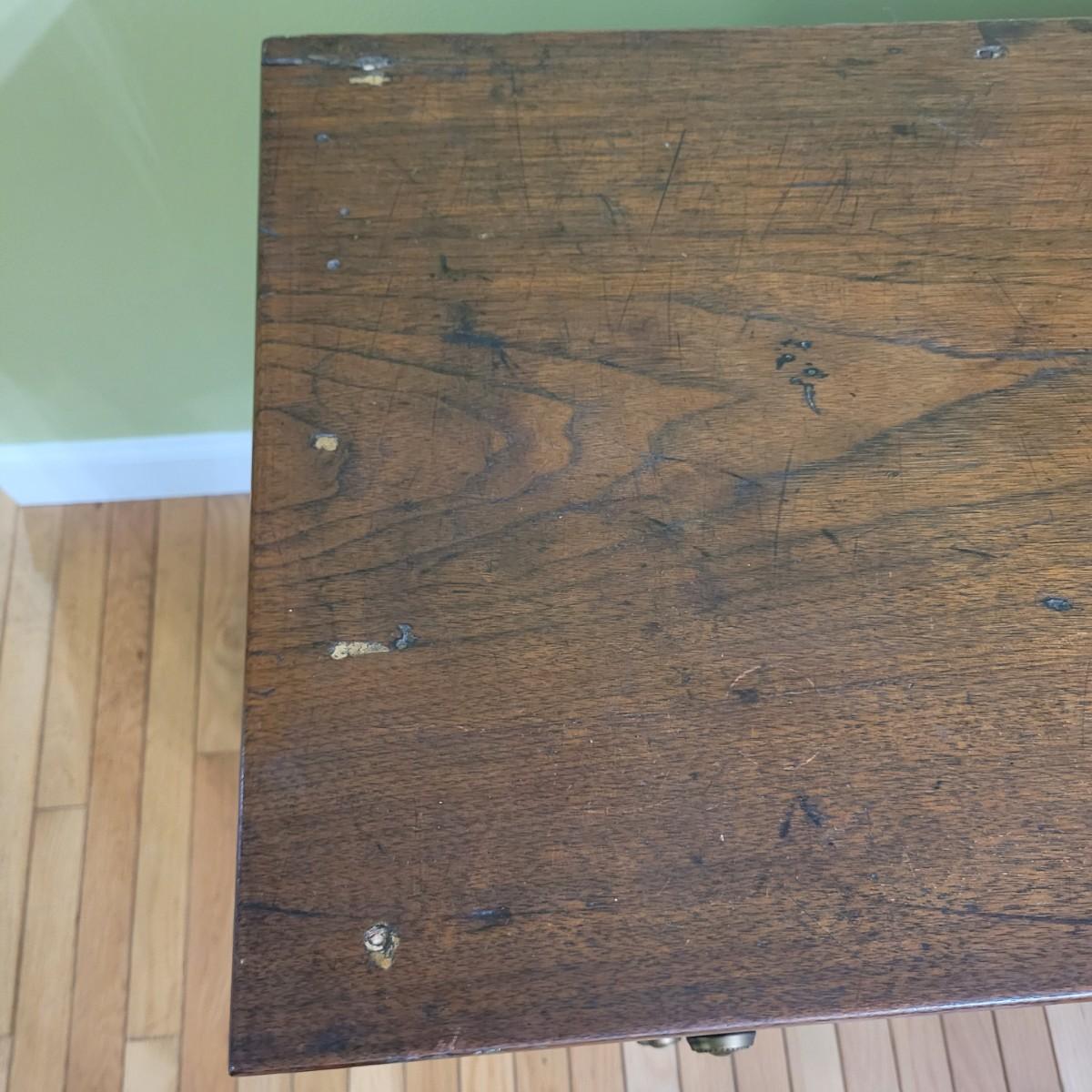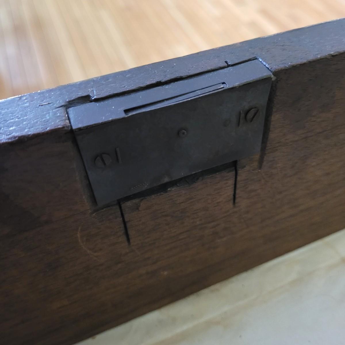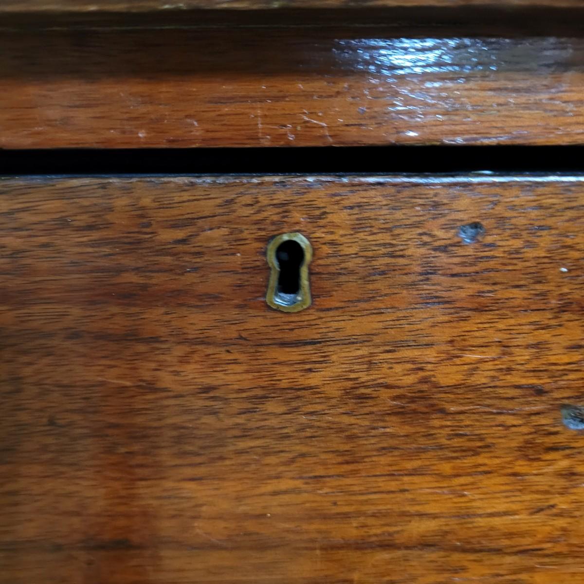 Solid wood dresser appears to be vintage in an early American style with metal knobs and keyholes. It has three sliding dovetailed drawers. The drawers do not have guide rails and move freely. The right side is pushed out slightly and shows exposed nails, but appears to be repairable. Dresser measures 42.5" x 18" x 35"H. Some overall wear due to age. Please see photos for details. This item is located on the ground floor with two steps down from the porch.