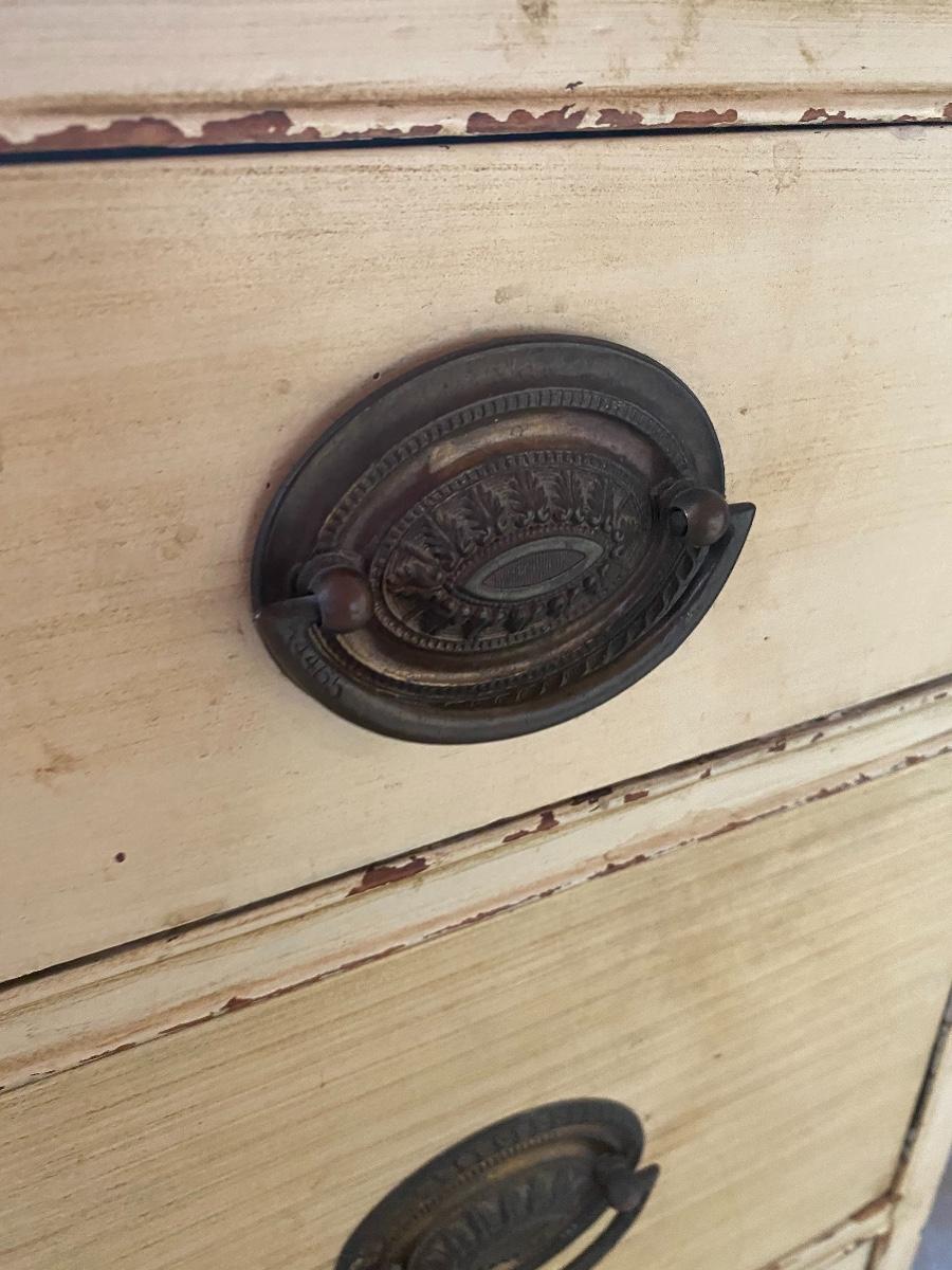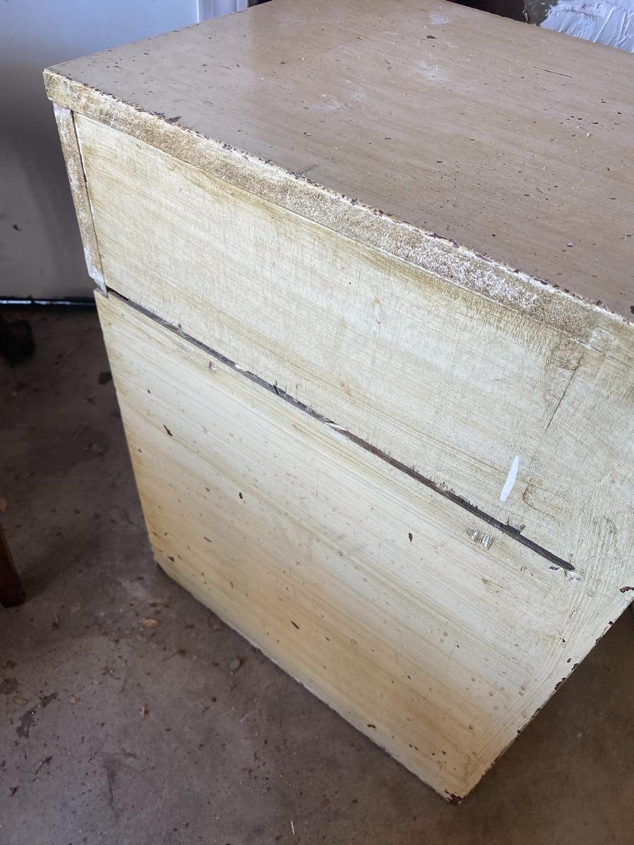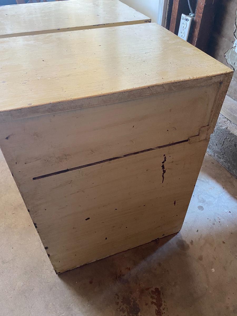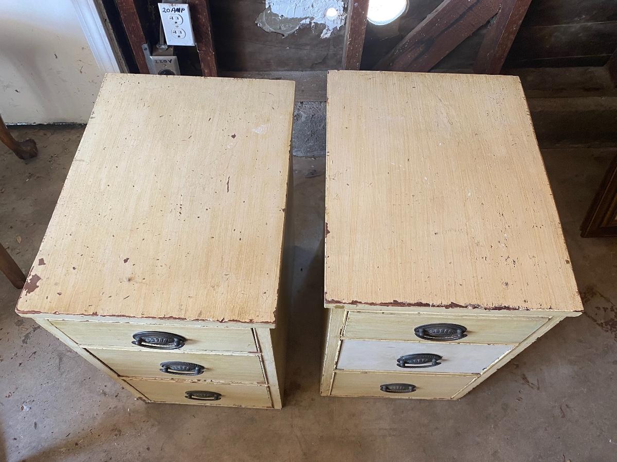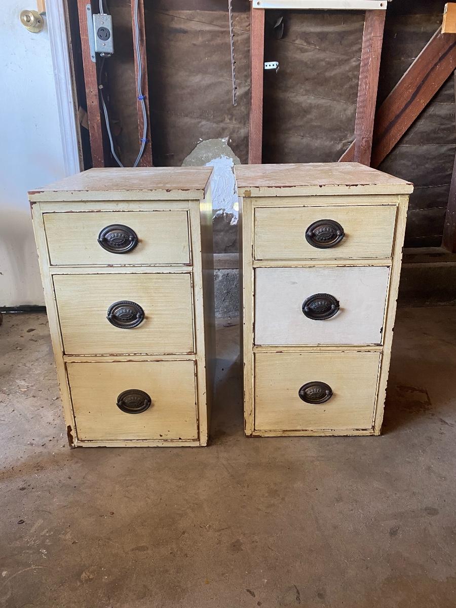 Vintage nightstands. Three drawers. Looks like they were once part of a vanity by the grooves on the one side of each. Drawers open nicely.
