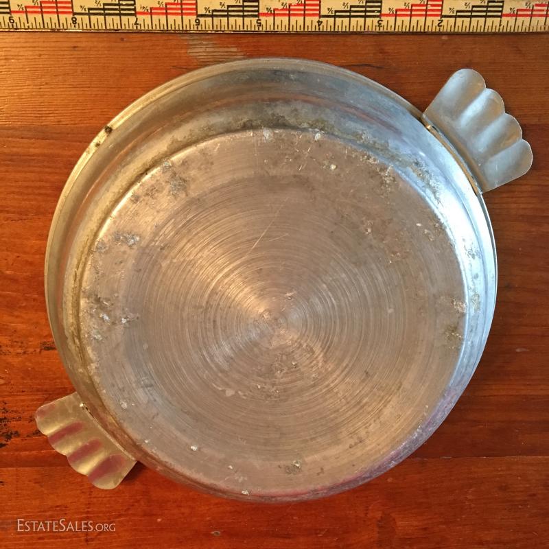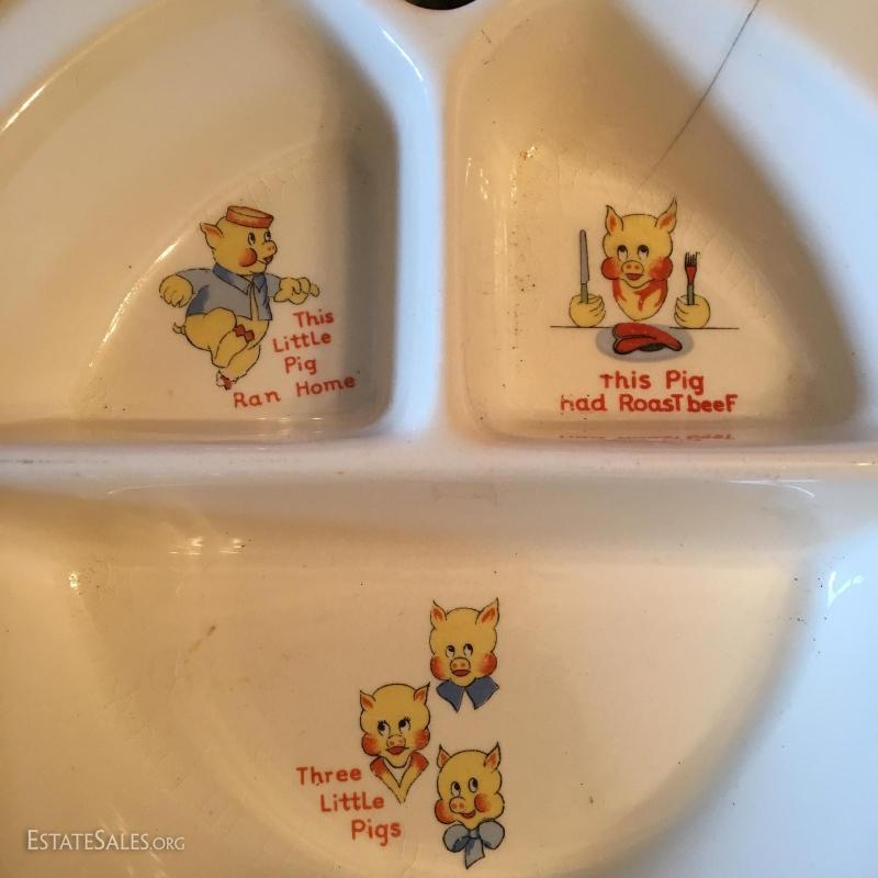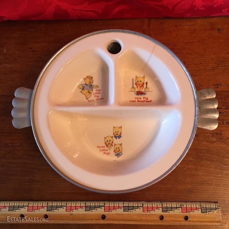 Aluminum and Ceramic, Piggies are Decals. Crack at 1:00 position. No dents, but corrosion on base.