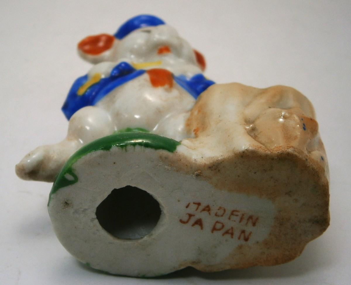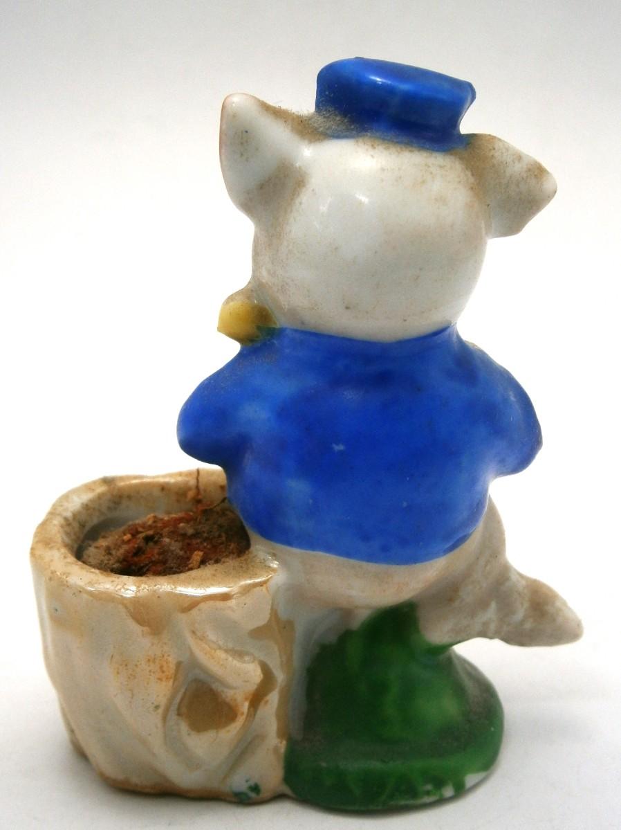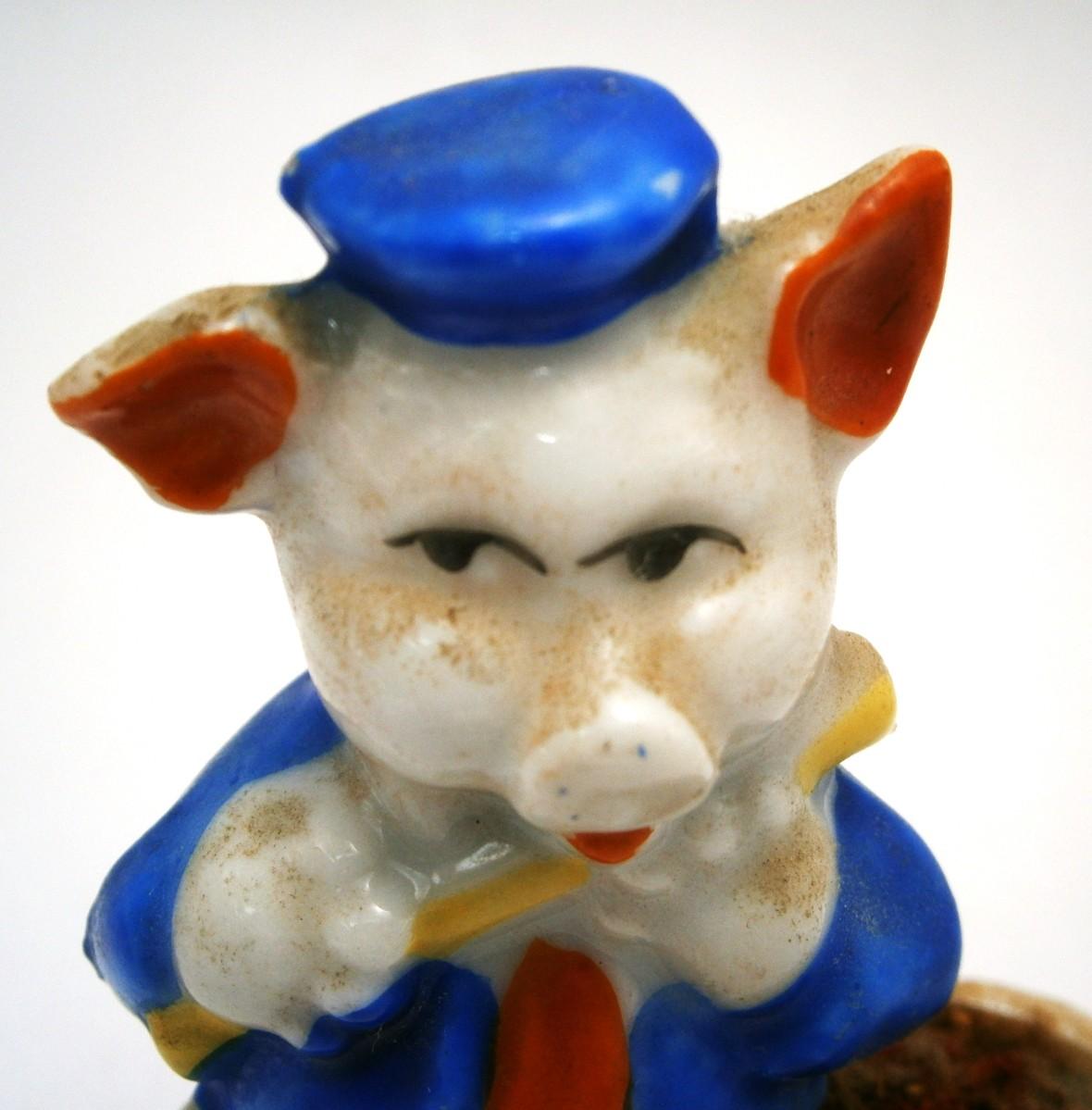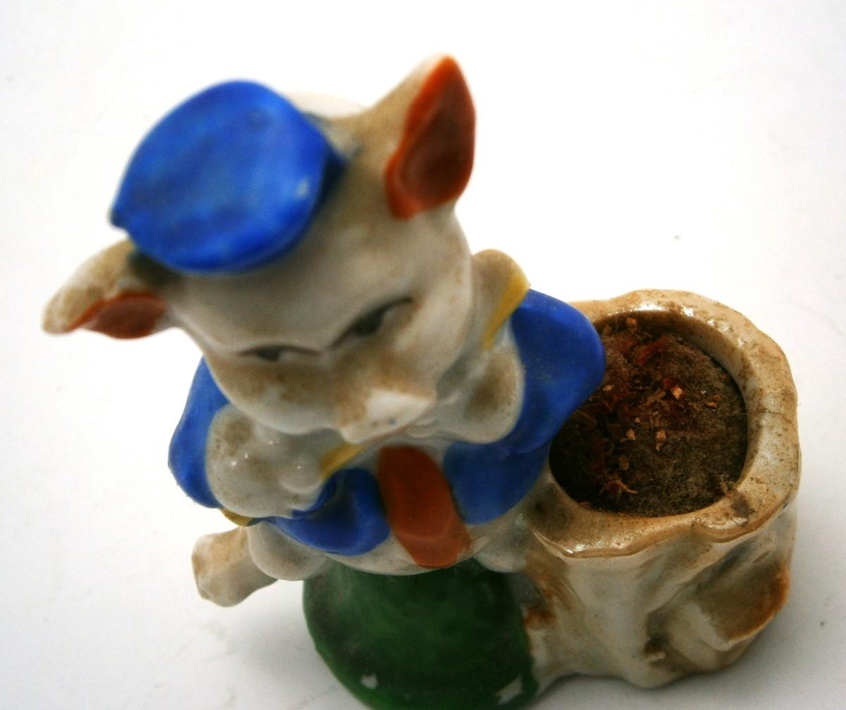 Vintage Three Little Pigs Flautist Pin Cushion made in Japan, hand painted porcelain, 3 in. tall.