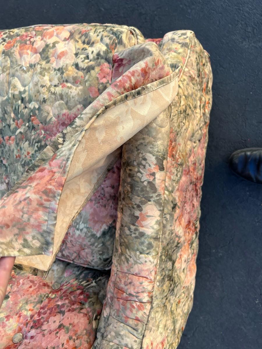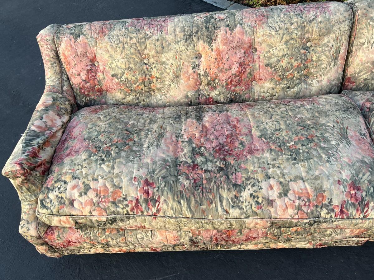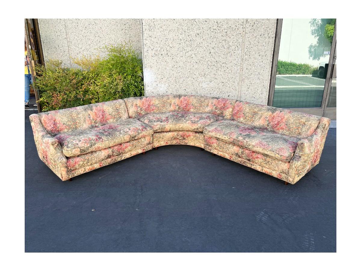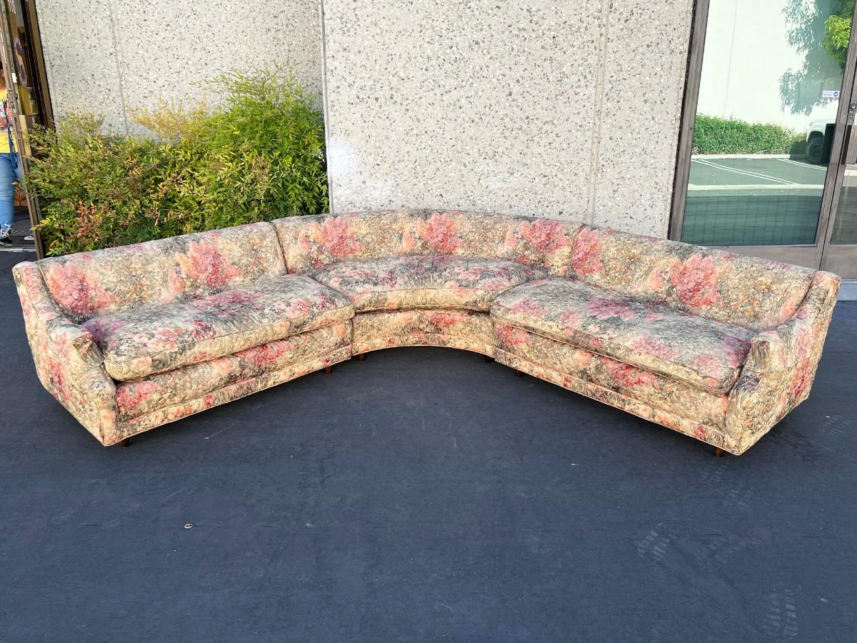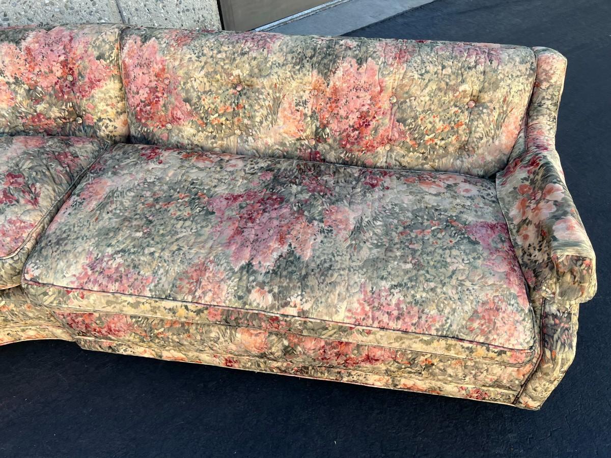 Vintage Three Piece Sectional Low Profile Floral Couch. Not the original upholstery there is tags under cushion with the company that did the reupholstery. Looks maybe 1960s-ish by the shape. In good condition, only one spot on lower corner seam. Sturdy frame, you do sink a little into the seat cushions, the cushions are not firm.