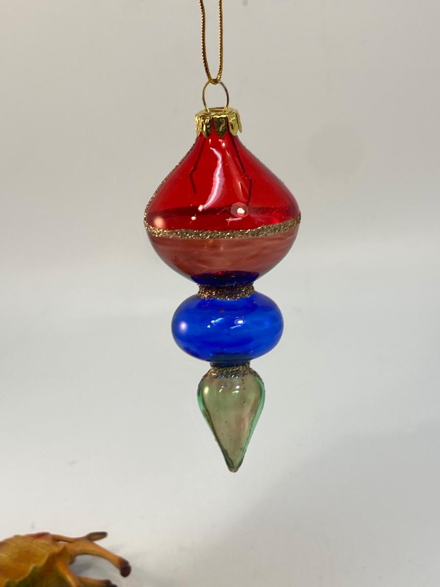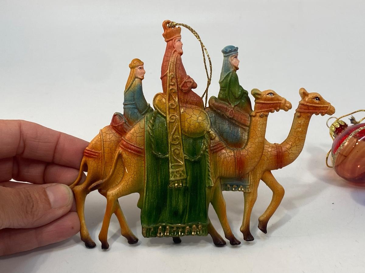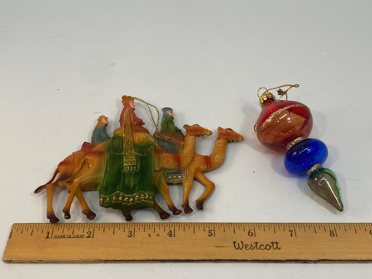 Vintage Three Wise Men and Colorful Glass Pendant Style Christmas Tree Ornament. Three wise men is double sided, can be displayed either way. Glass pendant ornament is in good condition.