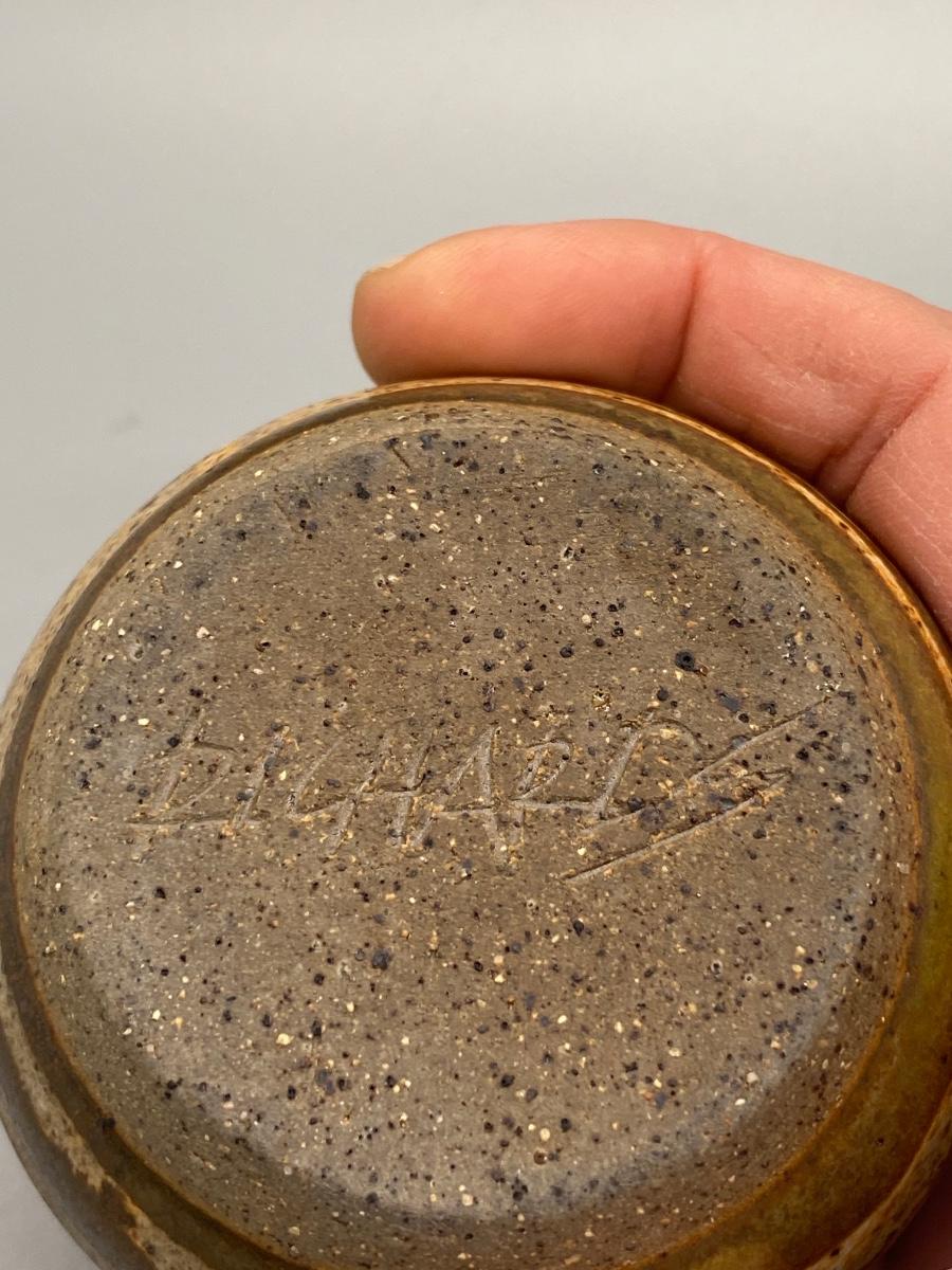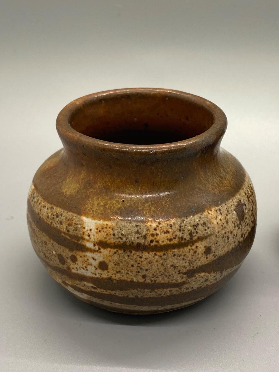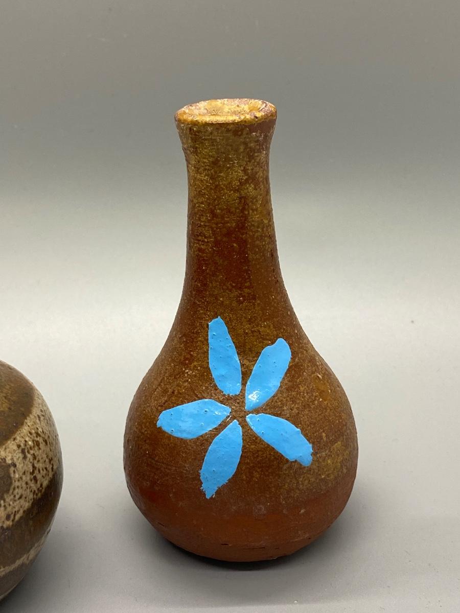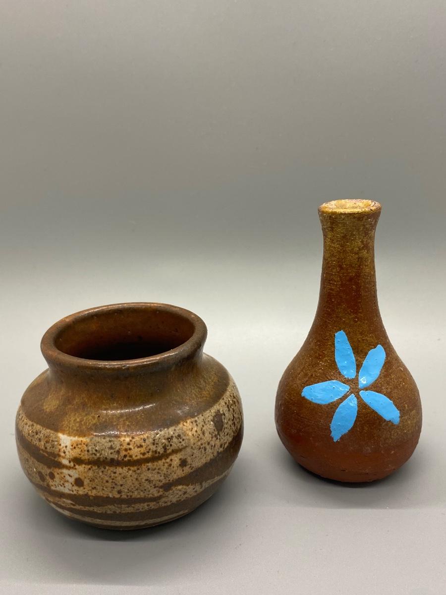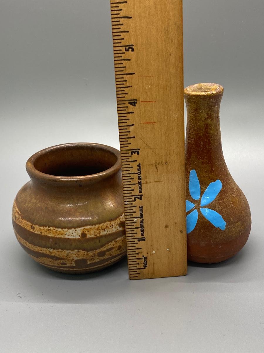 Pair of vintage thrown pottery vessels. A small planter pot and a bud vase. The planter pot is artist signed on the bottom. About 3" to 4" size.