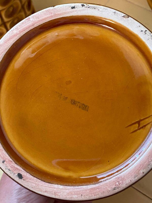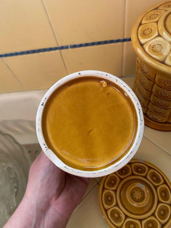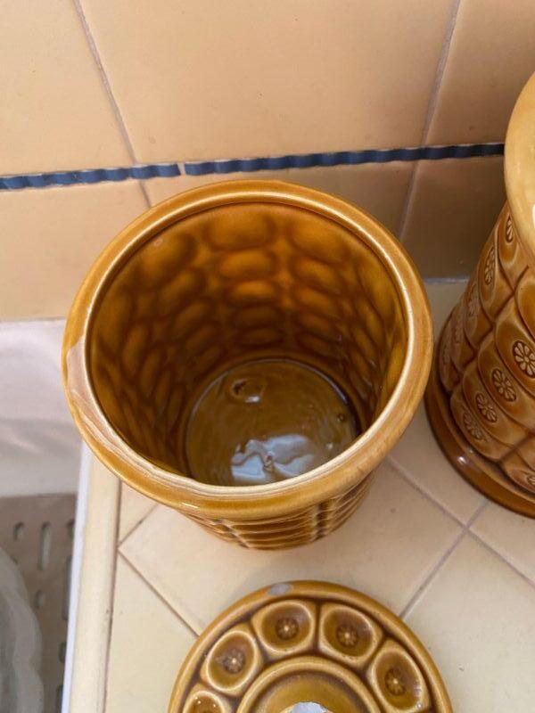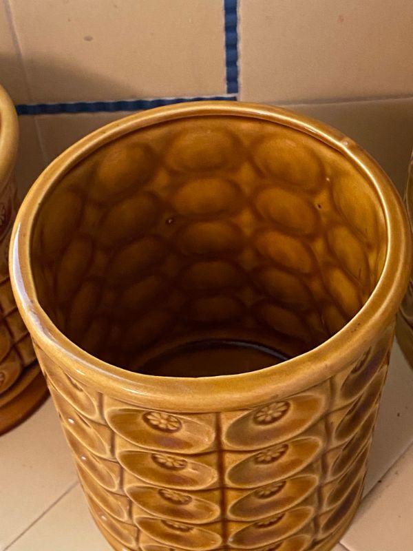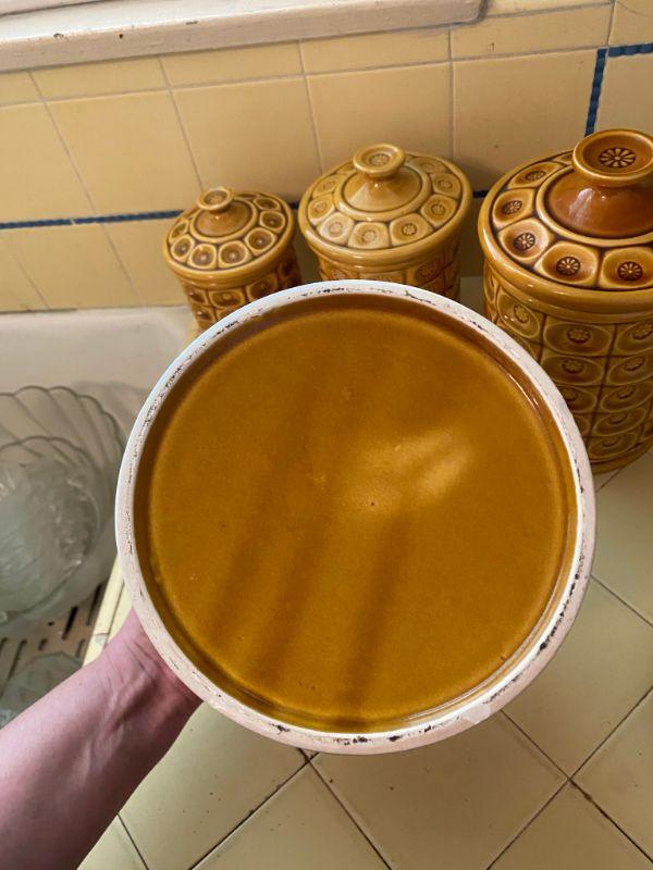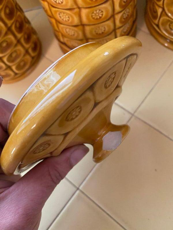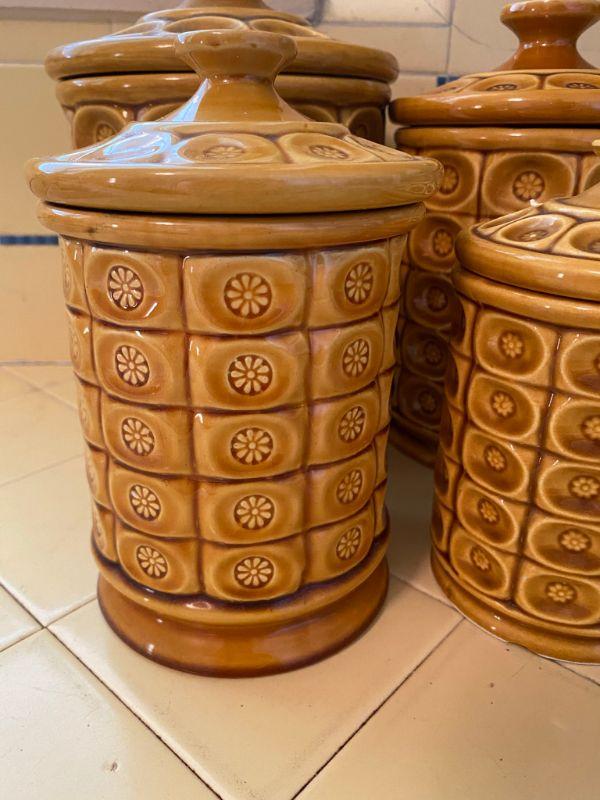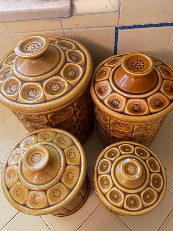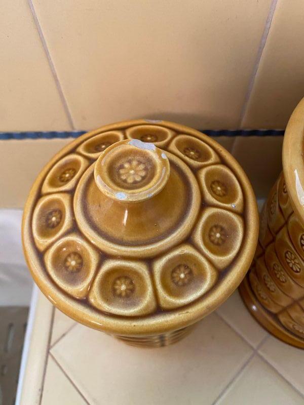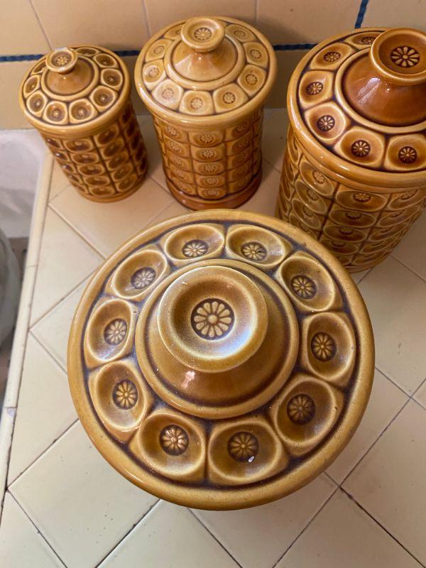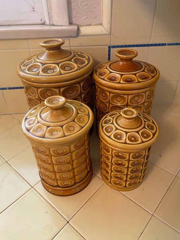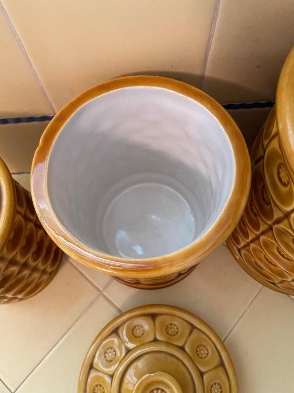 Vintage thumbprint design canister set. Beige yellow kind of color. Flower centered thumbprint design pattern. One is marked but can't read clearly, might say Made in Portugal There are a couple chips on two lids and edge of one bottom. Display great.