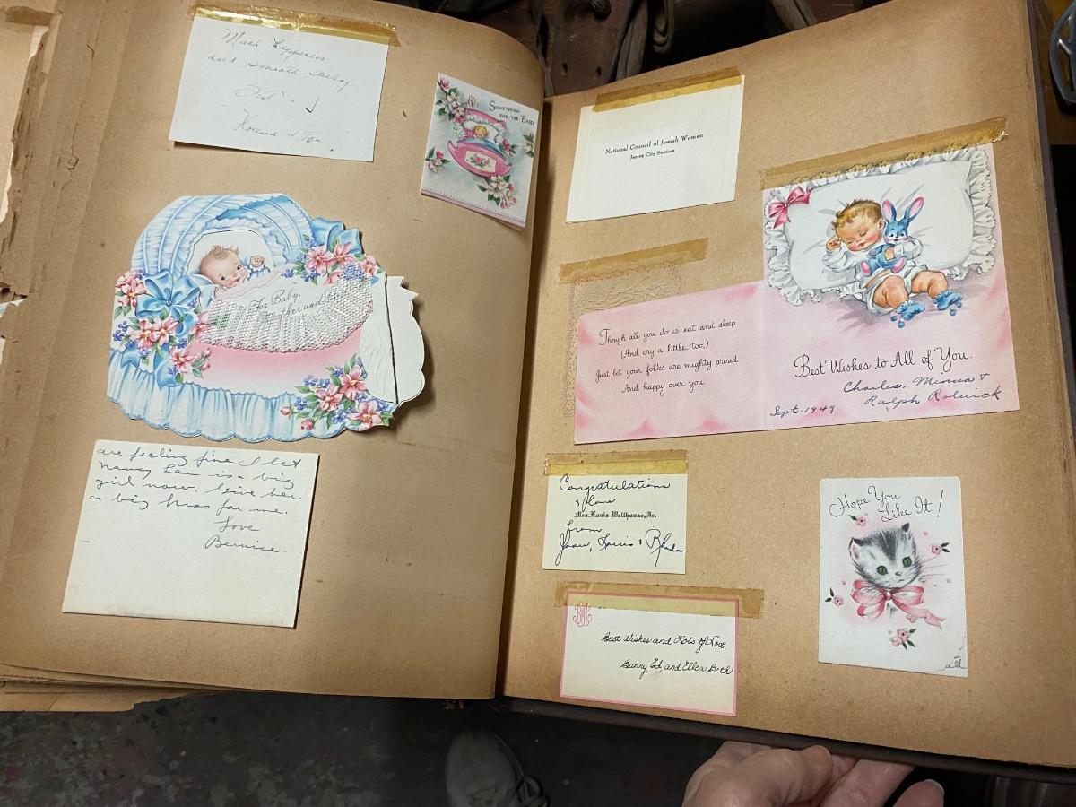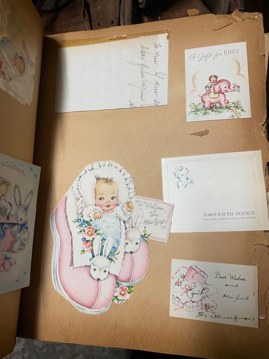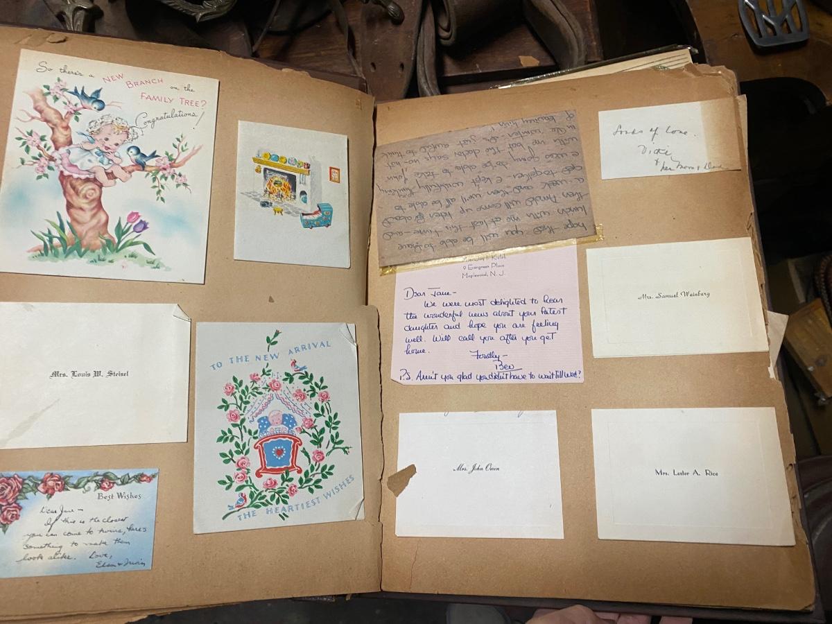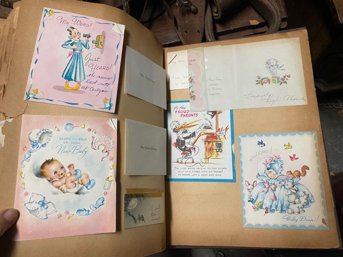 Vintage 12x14 Tie back baby birth scrapbook with letters, cards and telegrams. Some of the pages are torn away from the book. Fun way to spend a rainy Sunday afternoon.