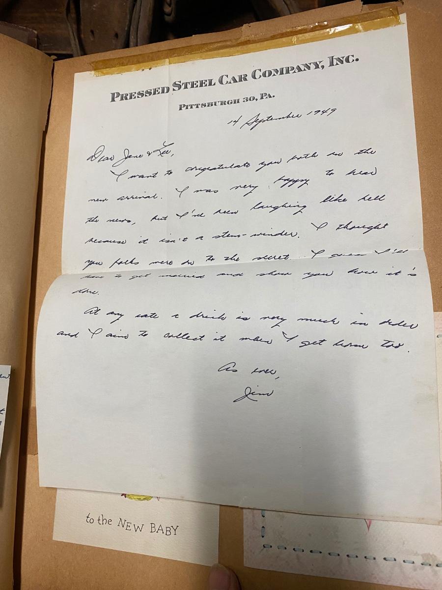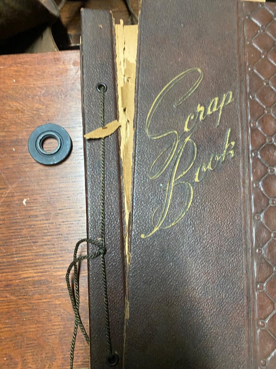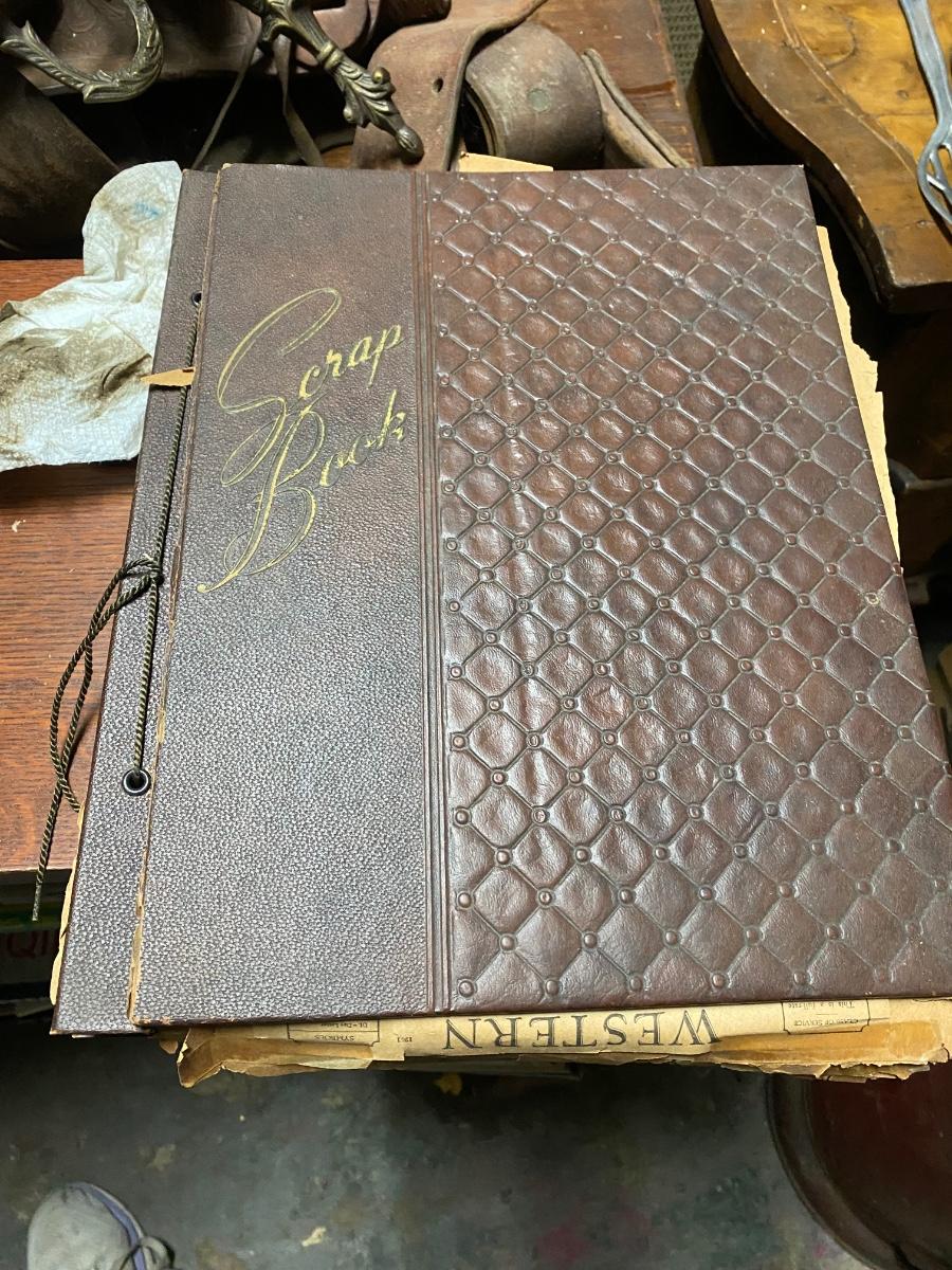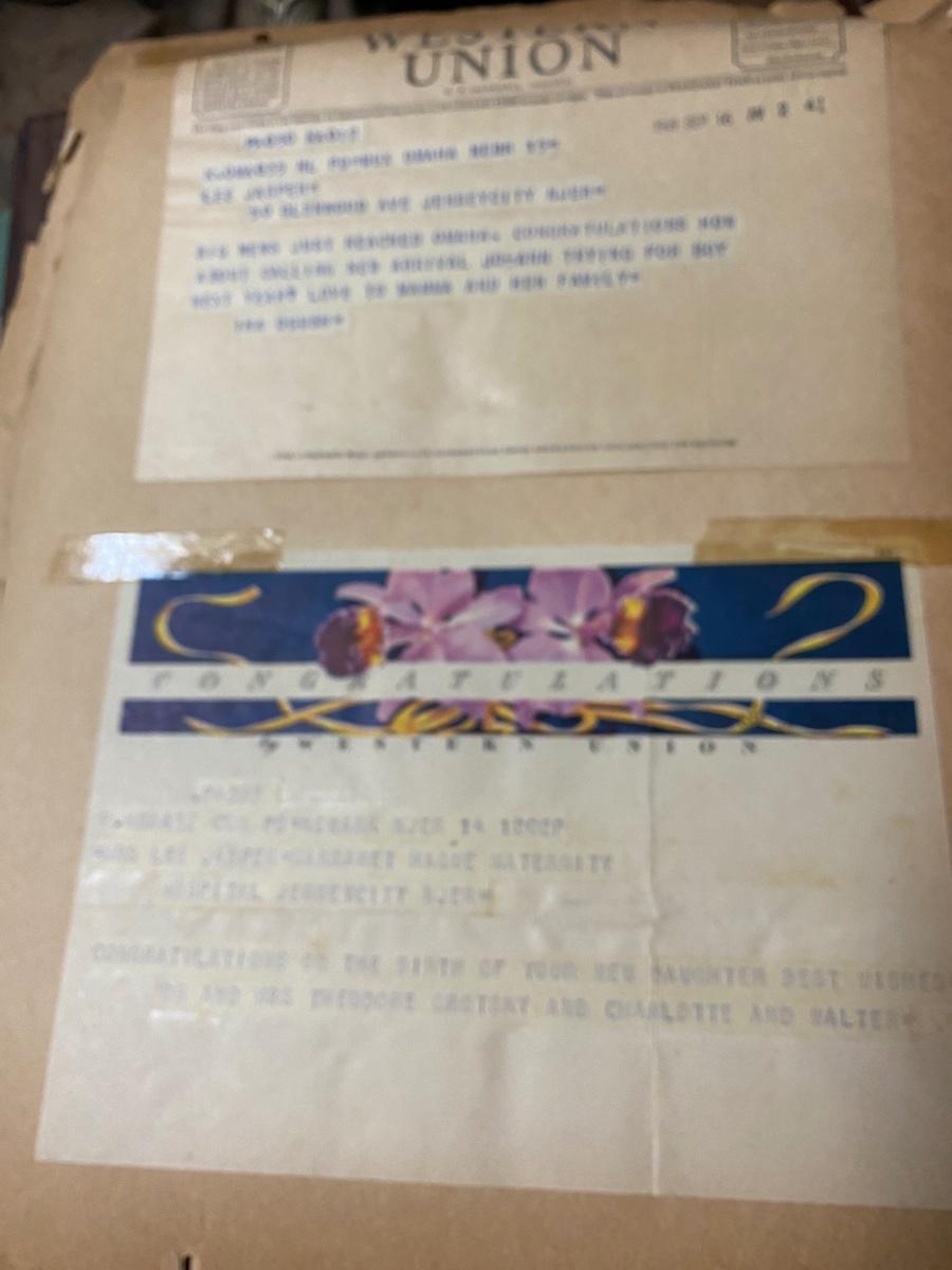Vintage 12x14 Tie back baby birth scrapbook with letters, cards and telegrams. Some of the pages are torn away from the book. Fun way to spend a rainy Sunday afternoon.