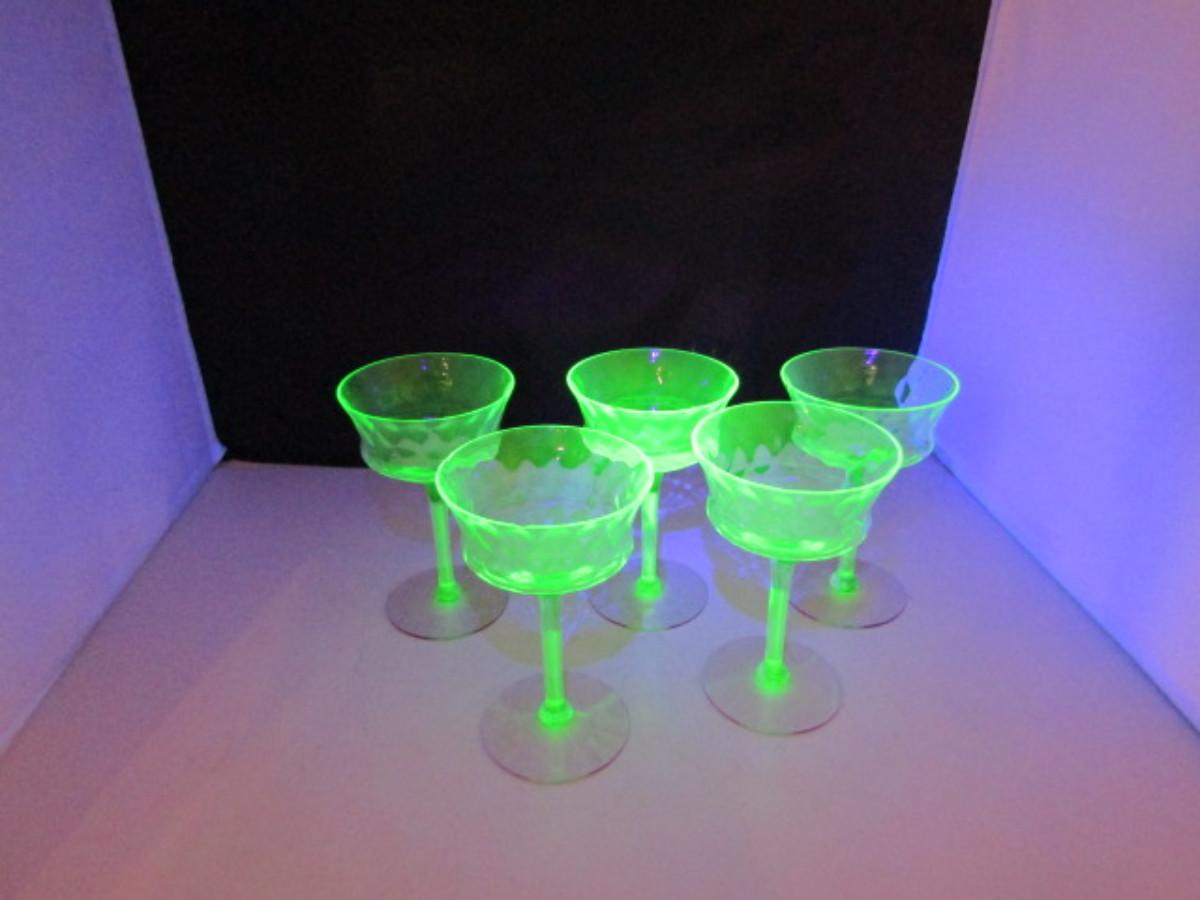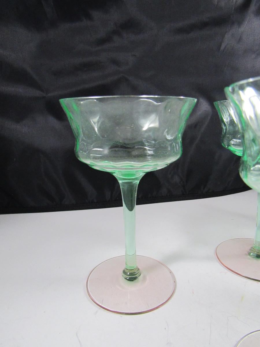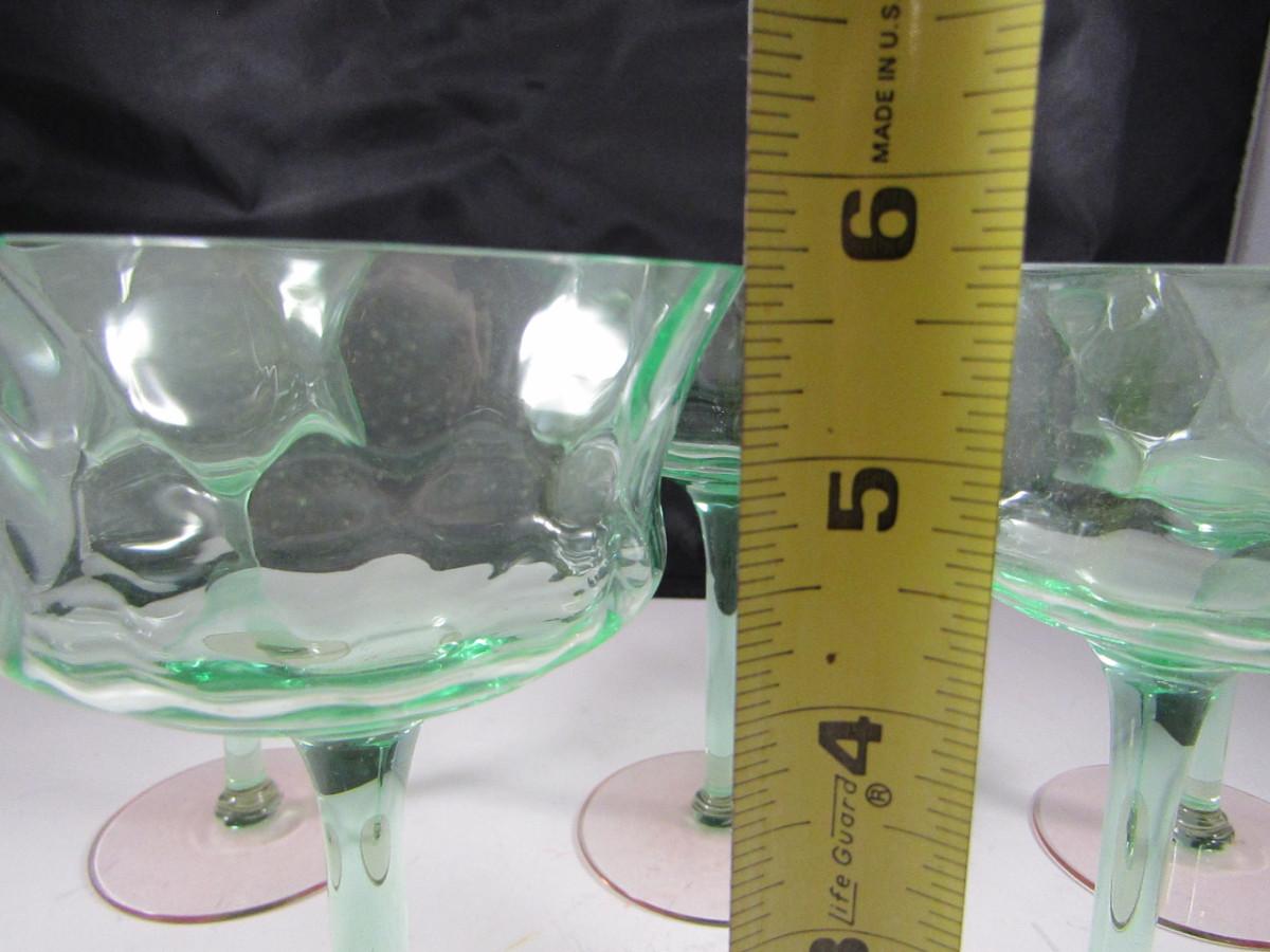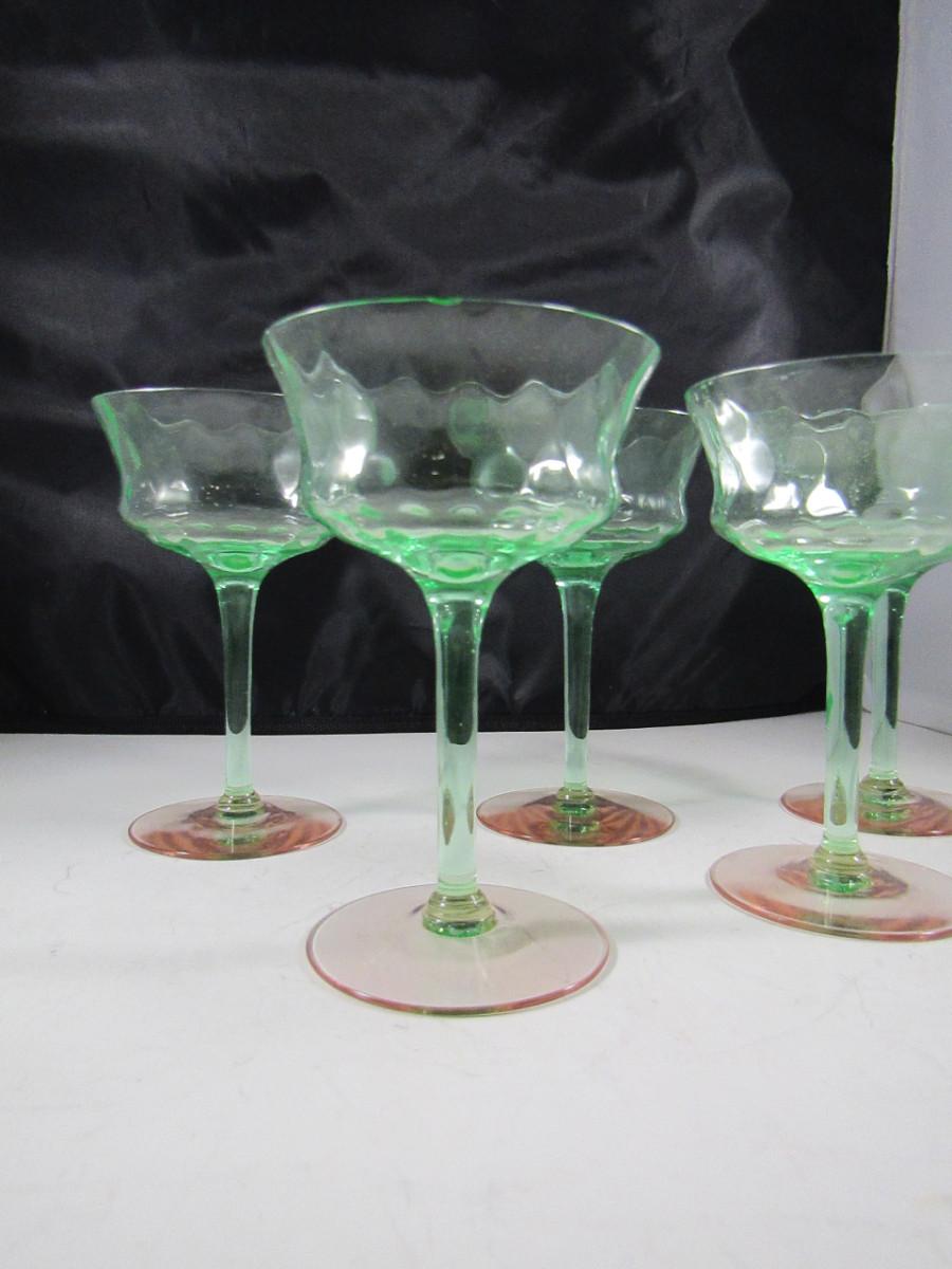 Vintage Tiffen Franciscan Champagne Glasses- Diamond Optic Pattern- 5 Pieces. Green uranium glass bowl and stem with rose colored base. Two glasses have very small (chigger bite) chip.