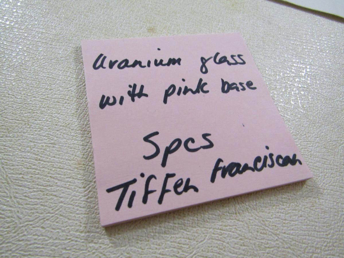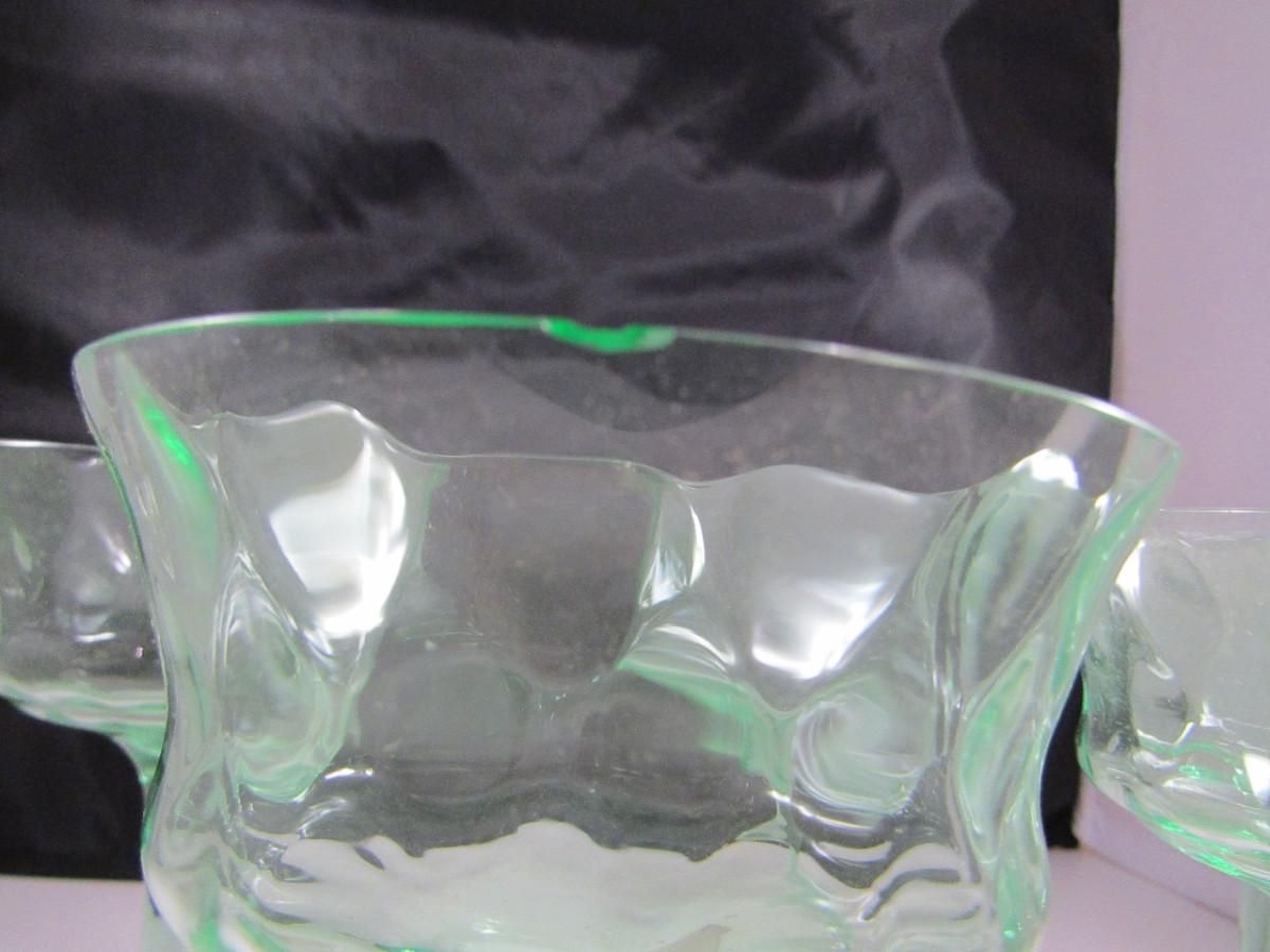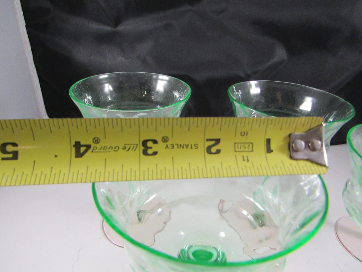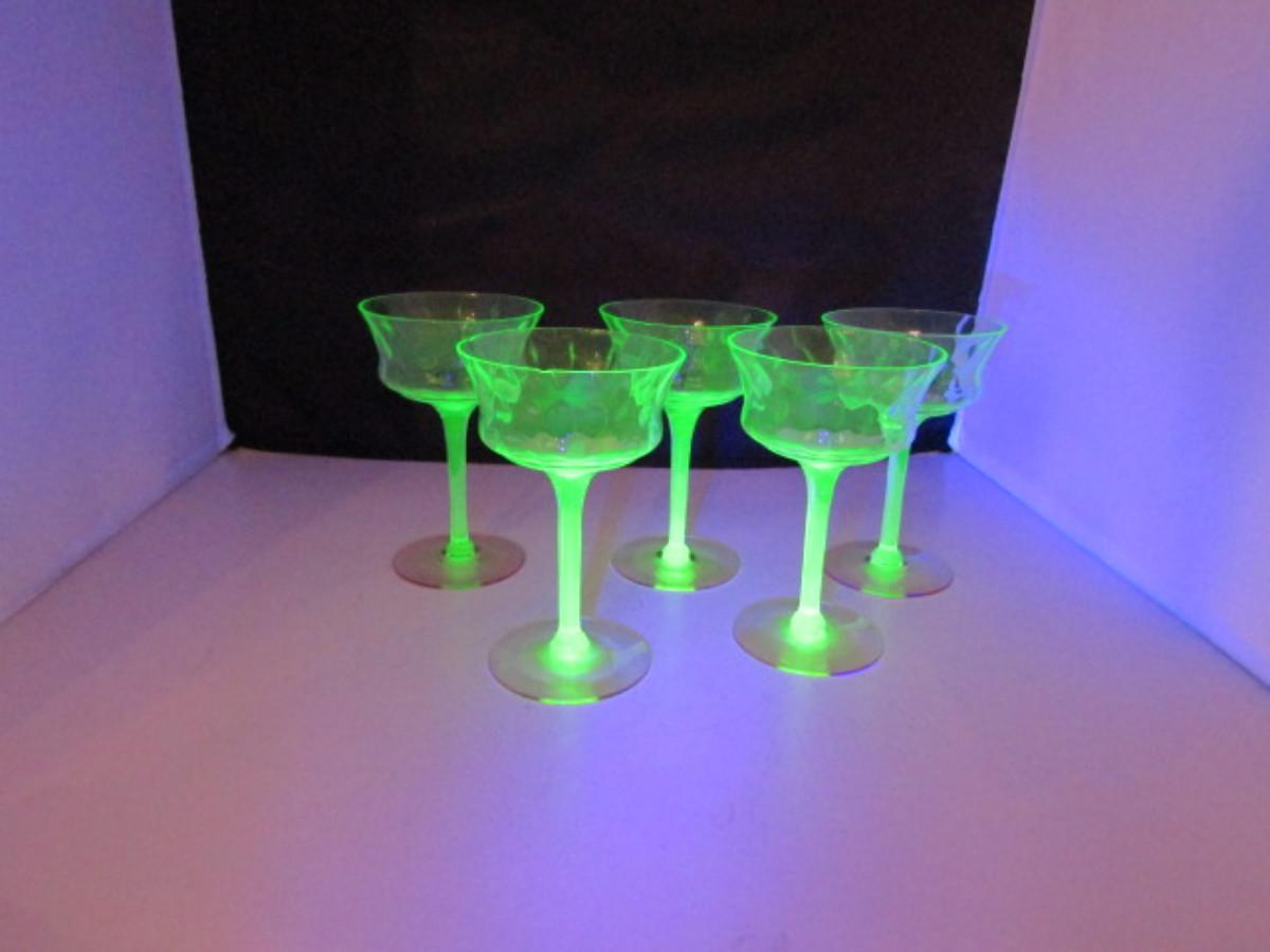 Vintage Tiffen Franciscan Champagne Glasses- Diamond Optic Pattern- 5 Pieces. Green uranium glass bowl and stem with rose colored base. Two glasses have very small (chigger bite) chip.