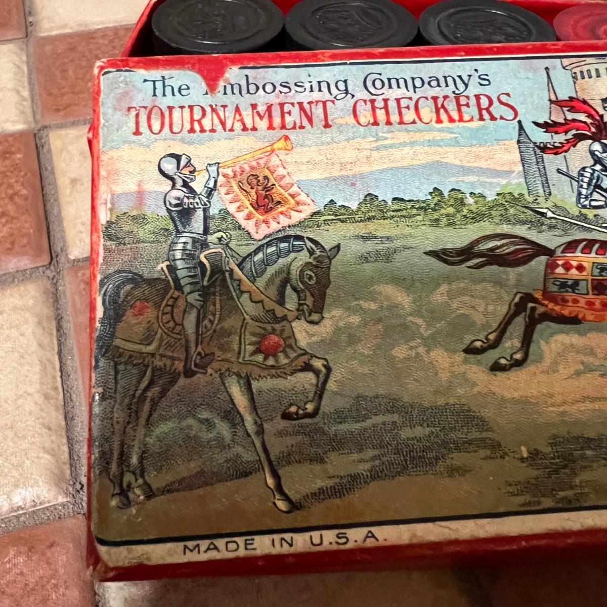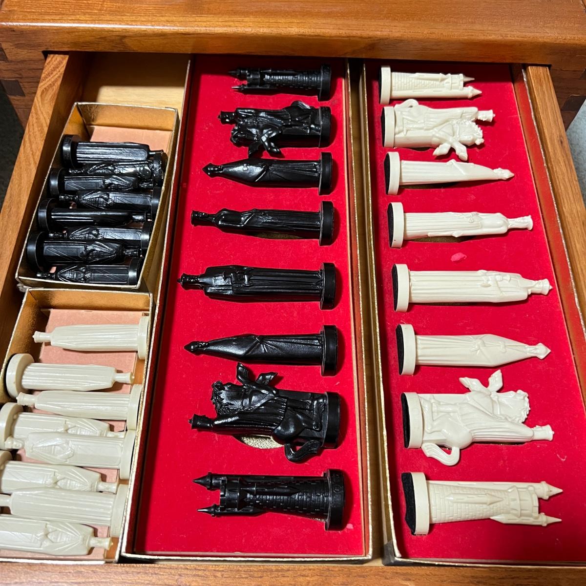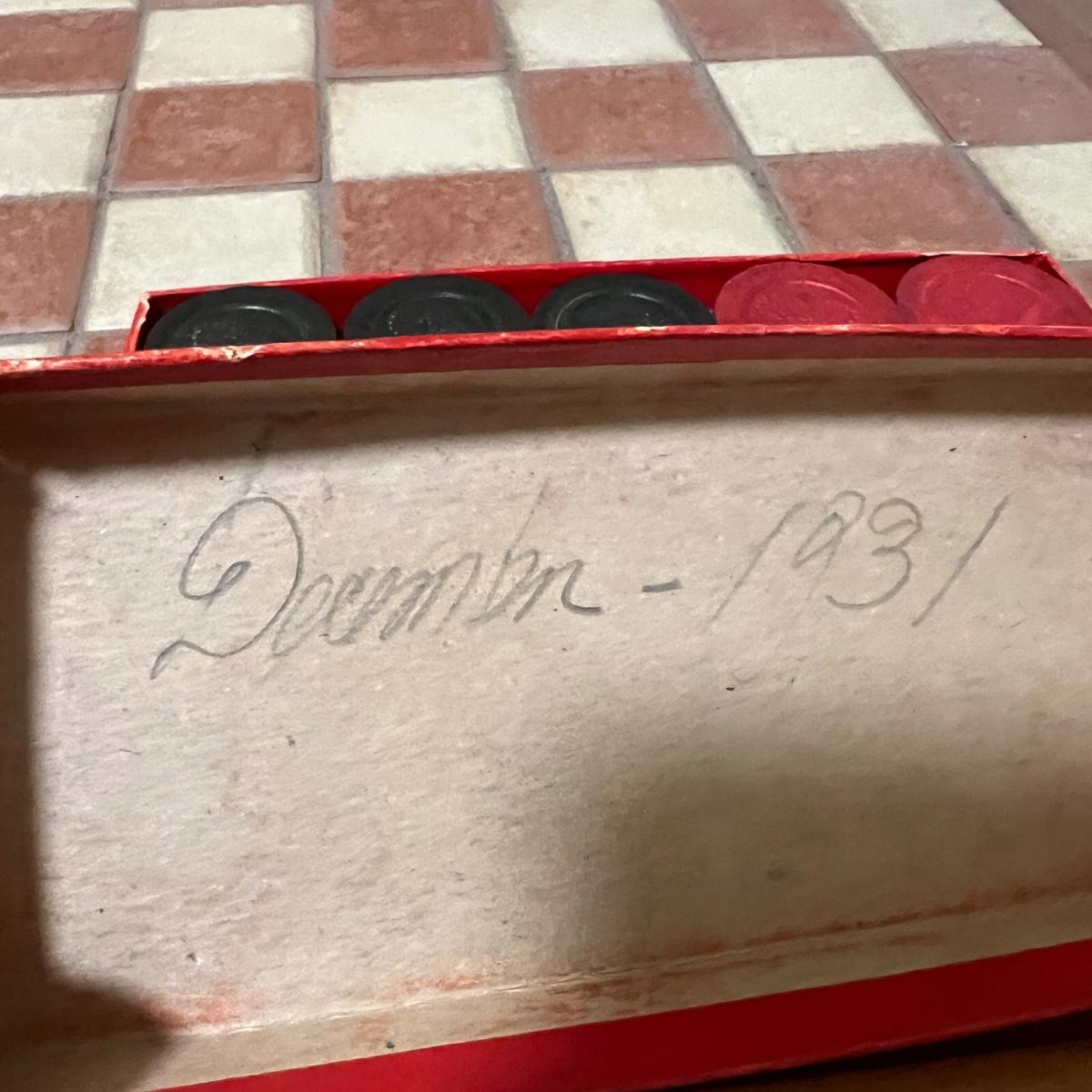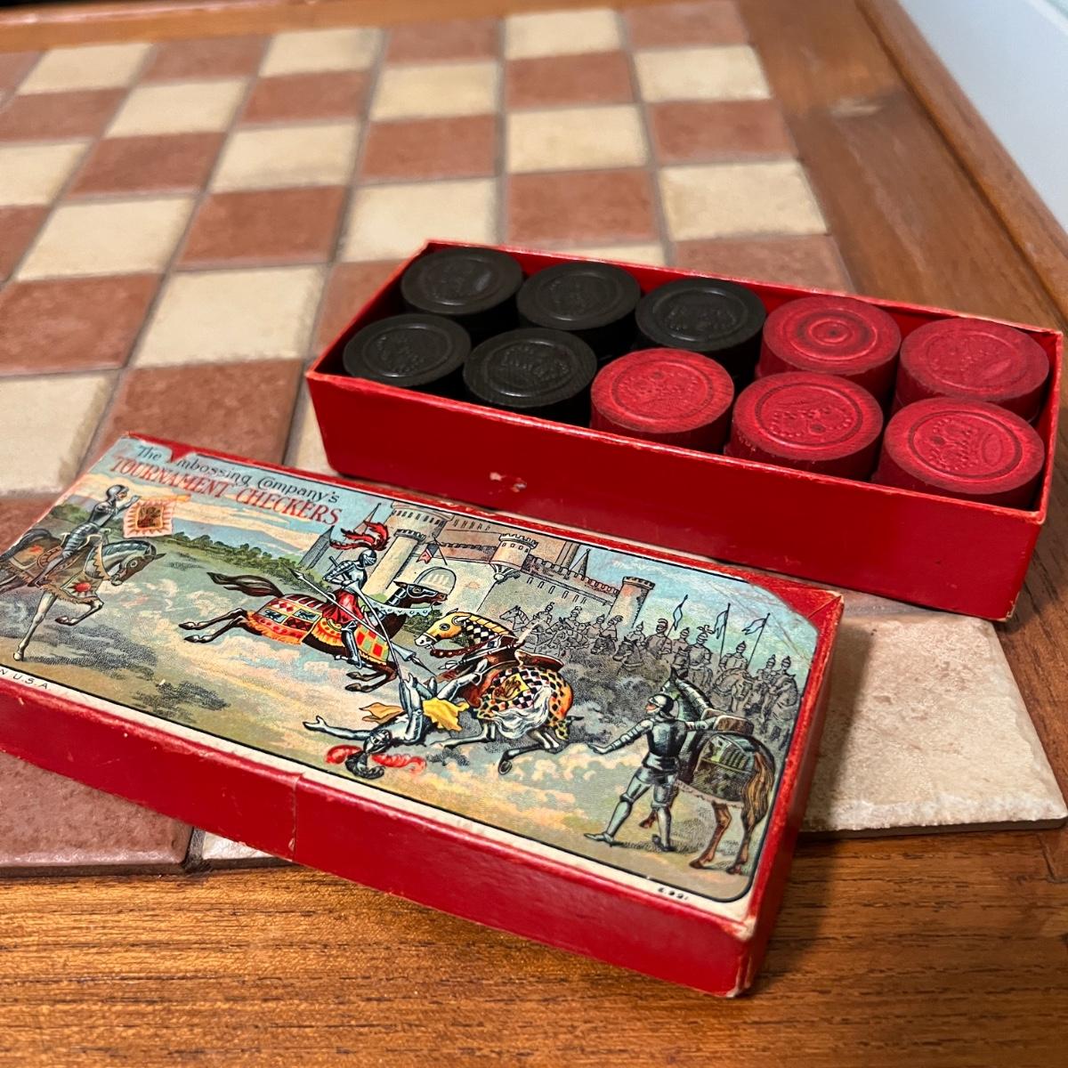 Vintage wood checker pieces in original box. Drawer has plastic chess pieces.