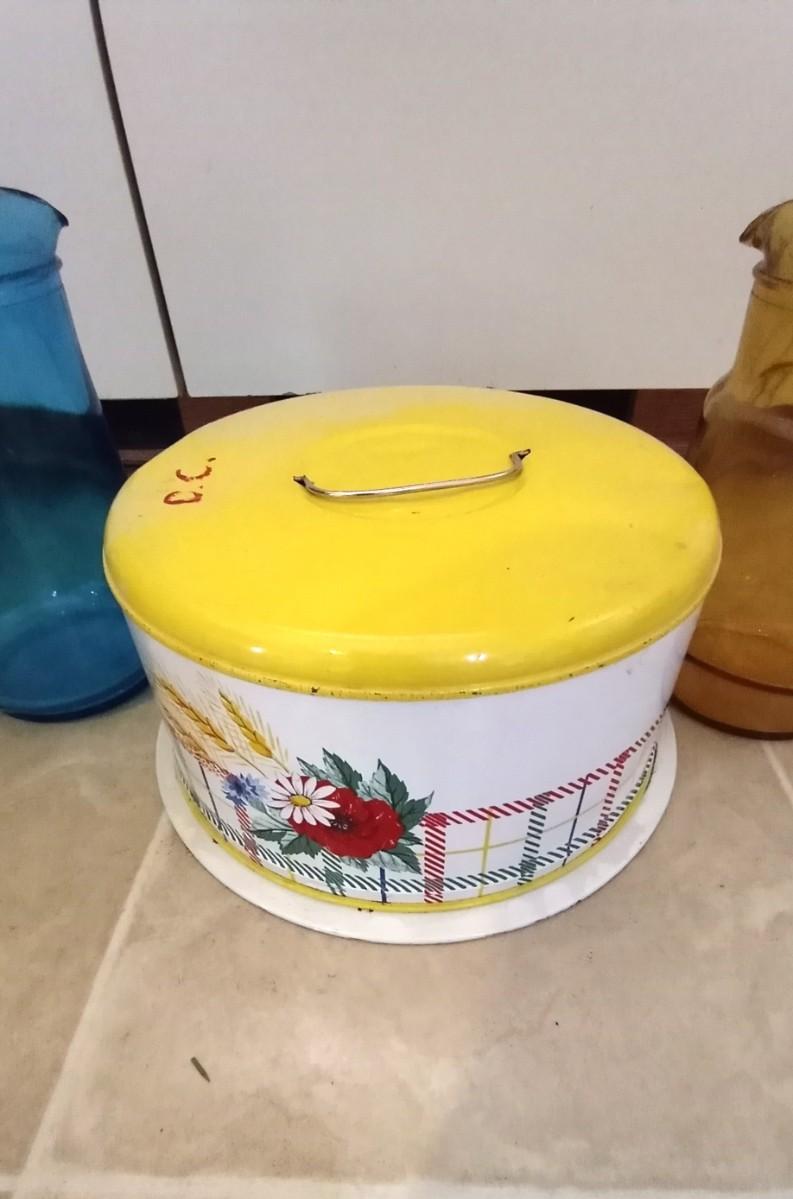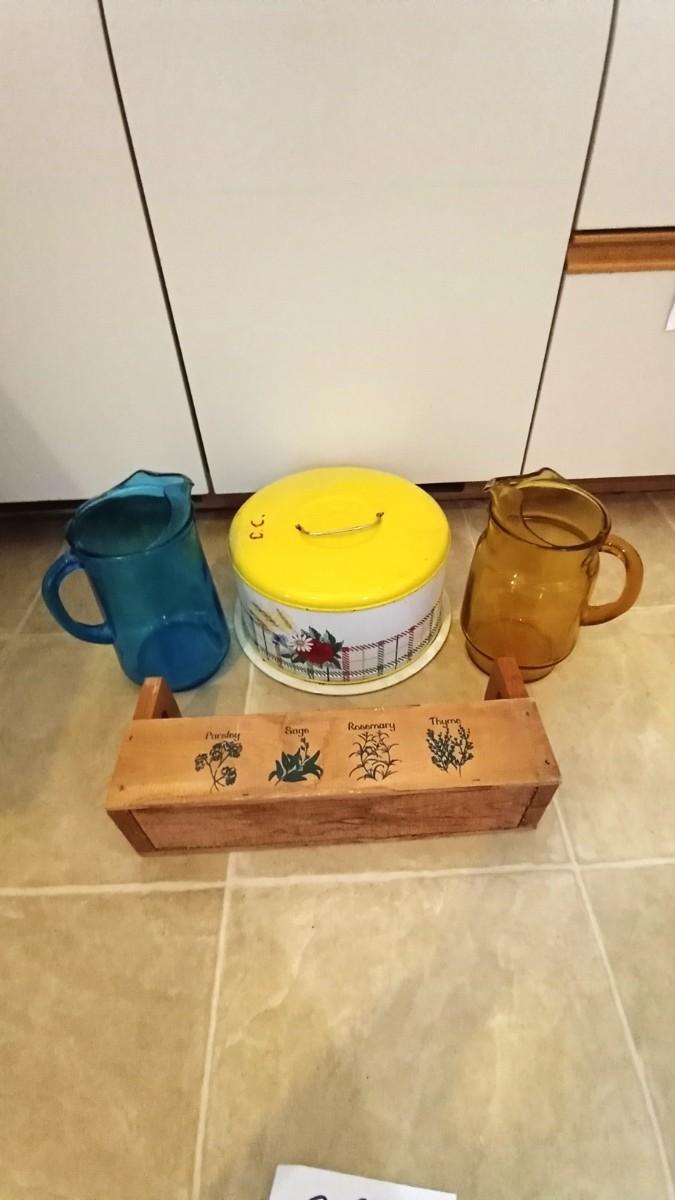 VINTAGE TIN CAKE SERVER-TWO GLASS PITCHERS AND WOODEN BOX