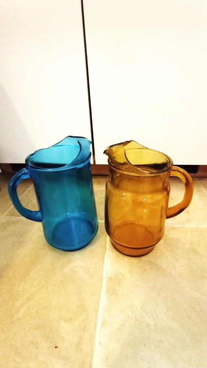 VINTAGE TIN CAKE SERVER-TWO GLASS WATER PITCHERS AND WOODEN BOX