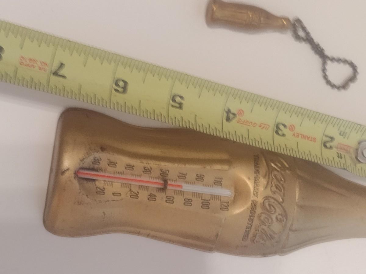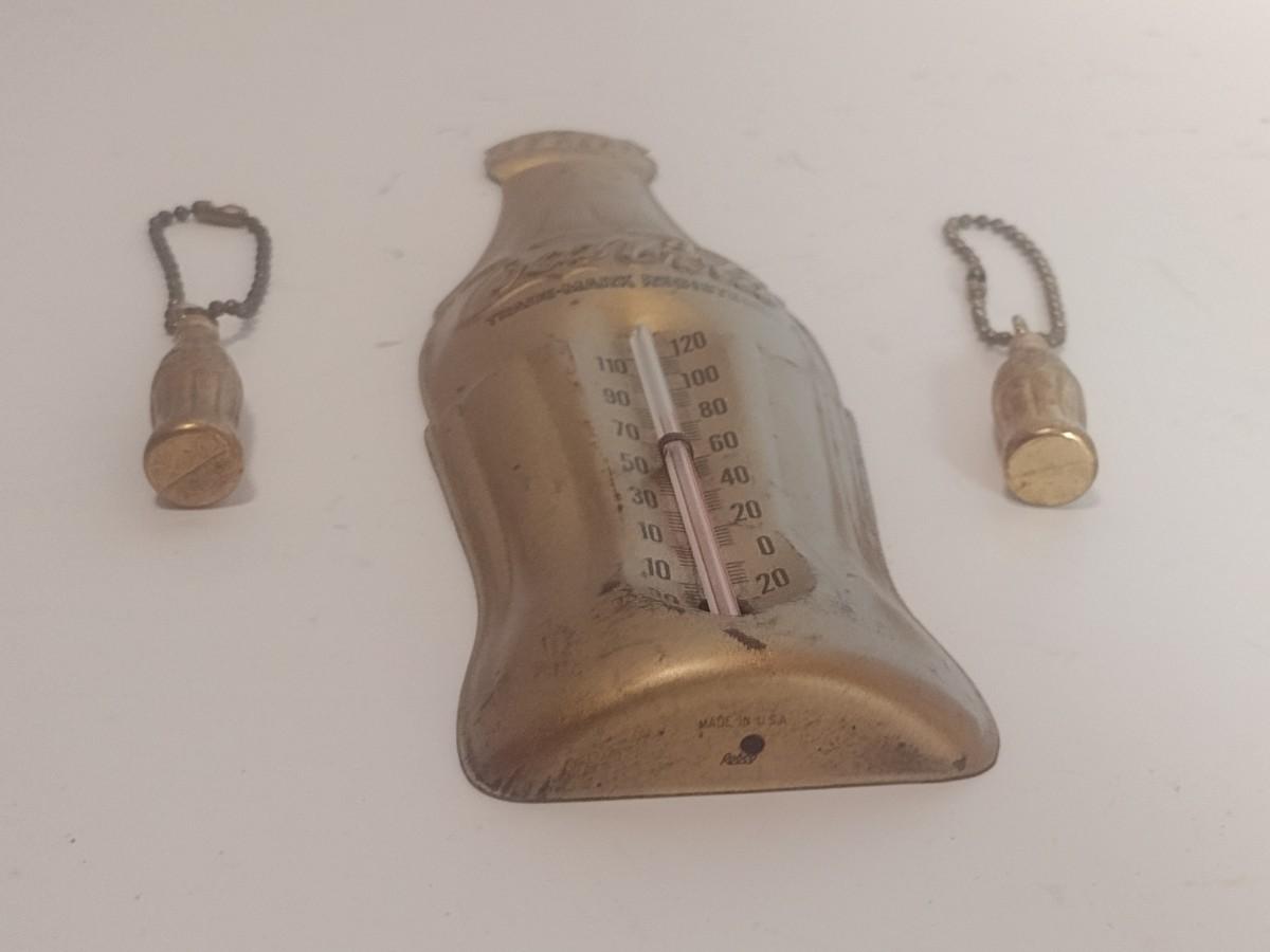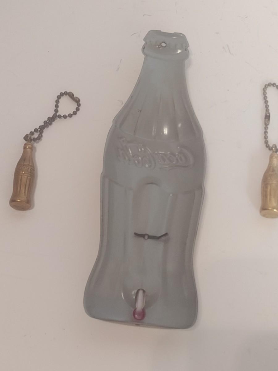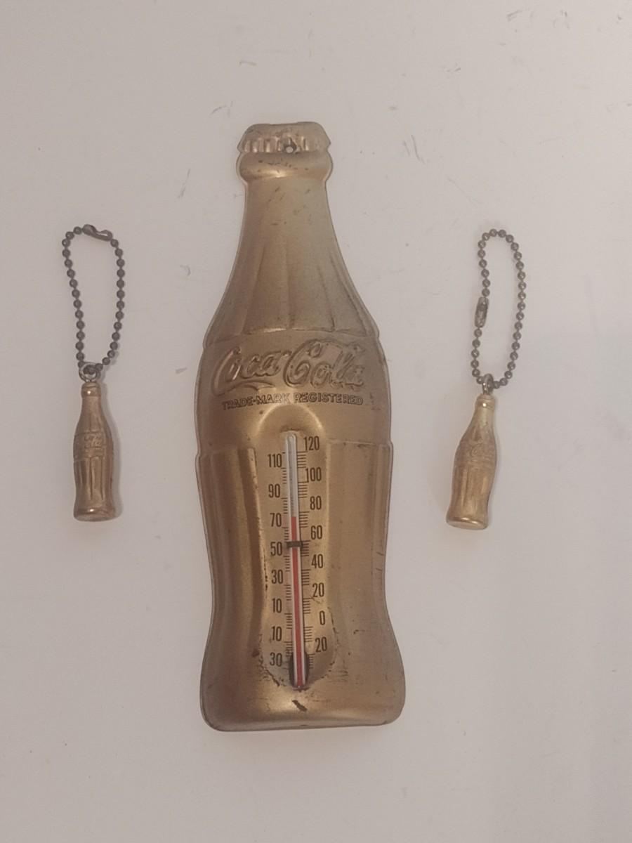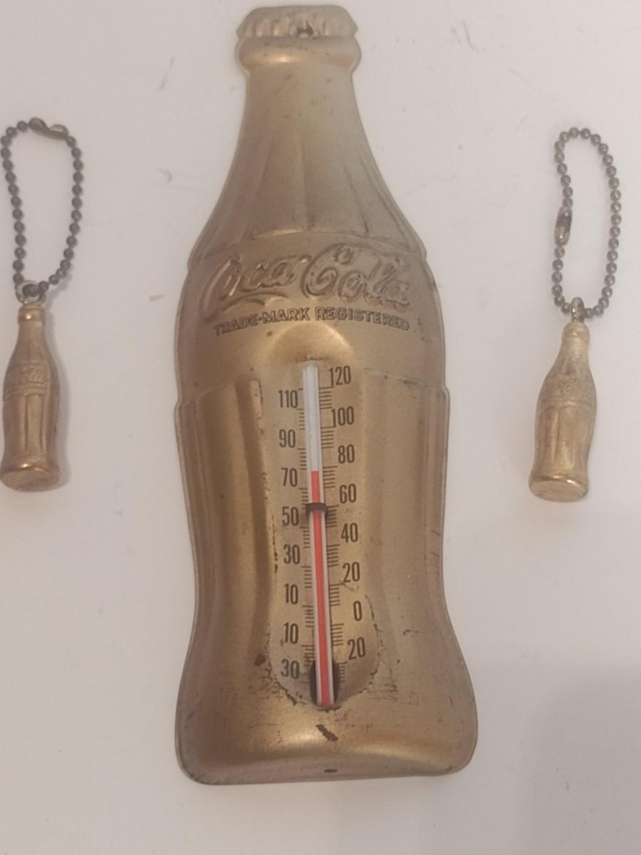 Vintage Tin Coca-Cola Wall Thermometer and Two Coca-Cola Key Chains