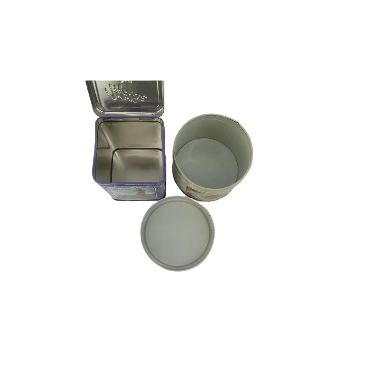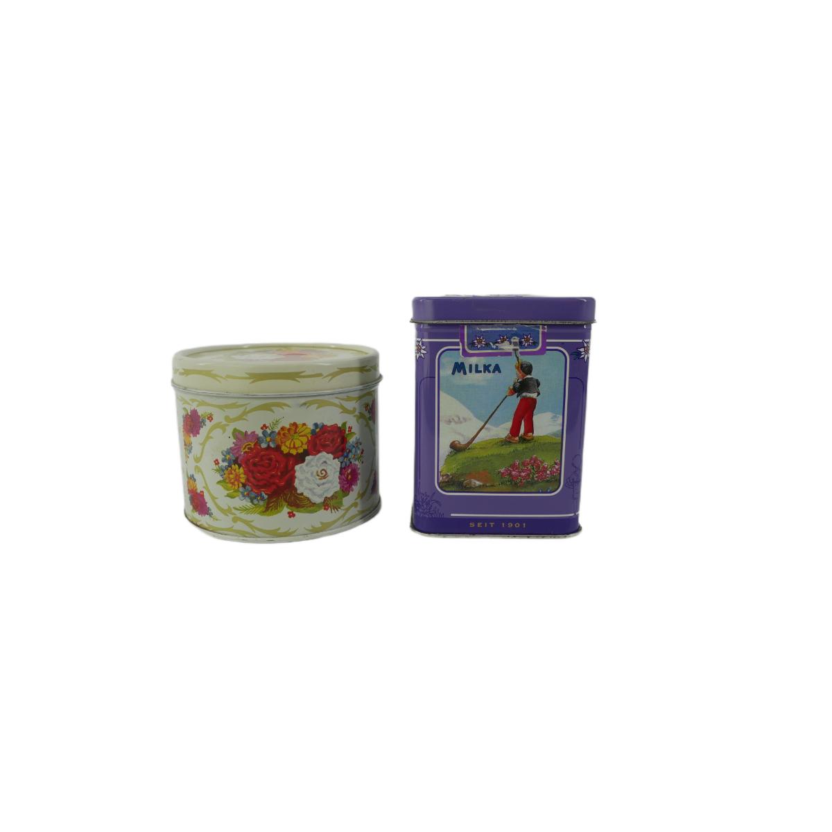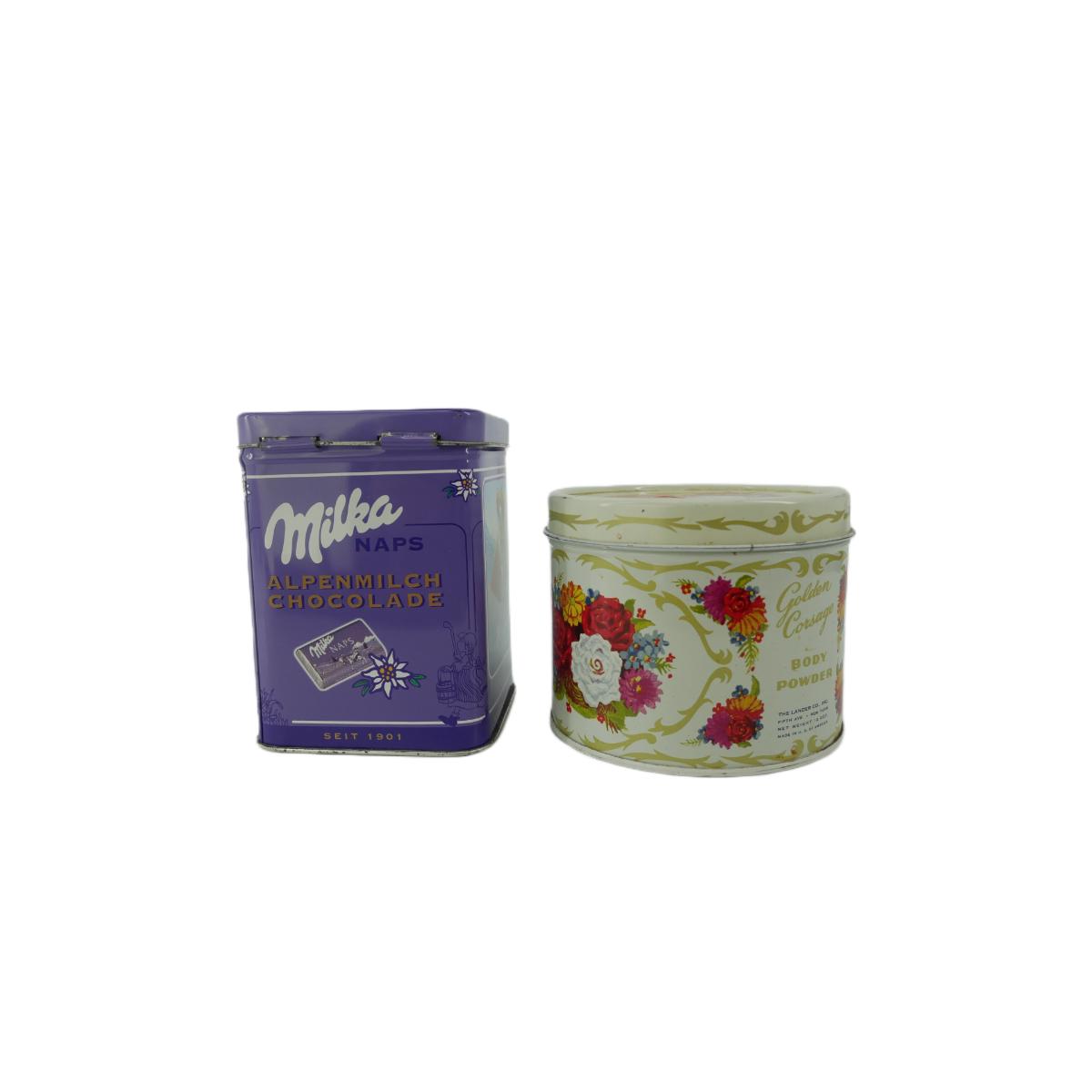Austrian Milka chocolates tin container in good condition. Measures L 3.5" x H 4.5". Floral designed Golden Corsage body powder container by The Lander Co, made in the USA measures 4.25" diameter, H 3.5". Writing present on bottom. Weight of lot is 8 oz. Both in great condition. (C62)