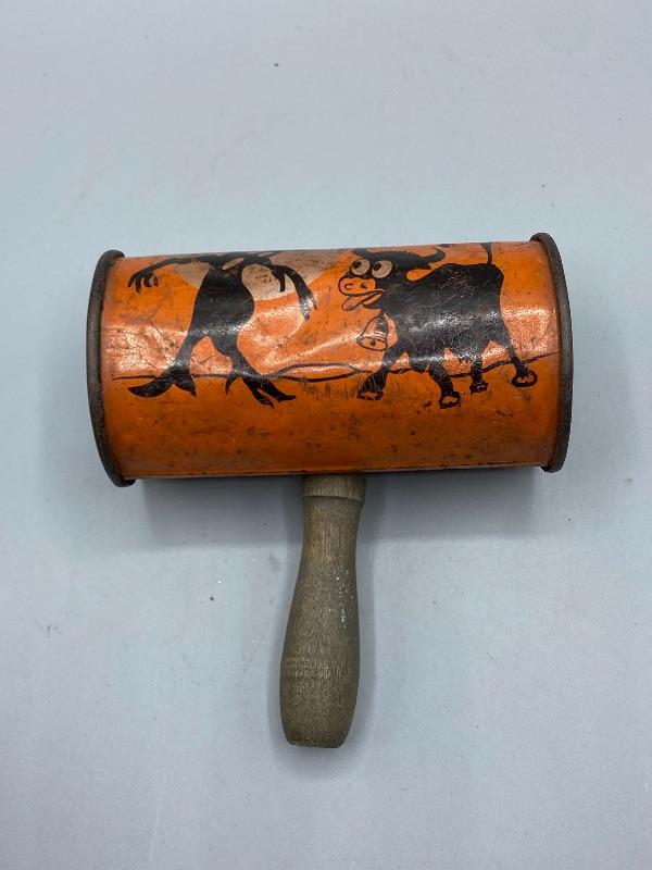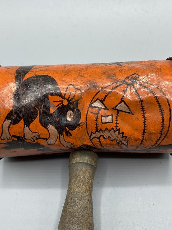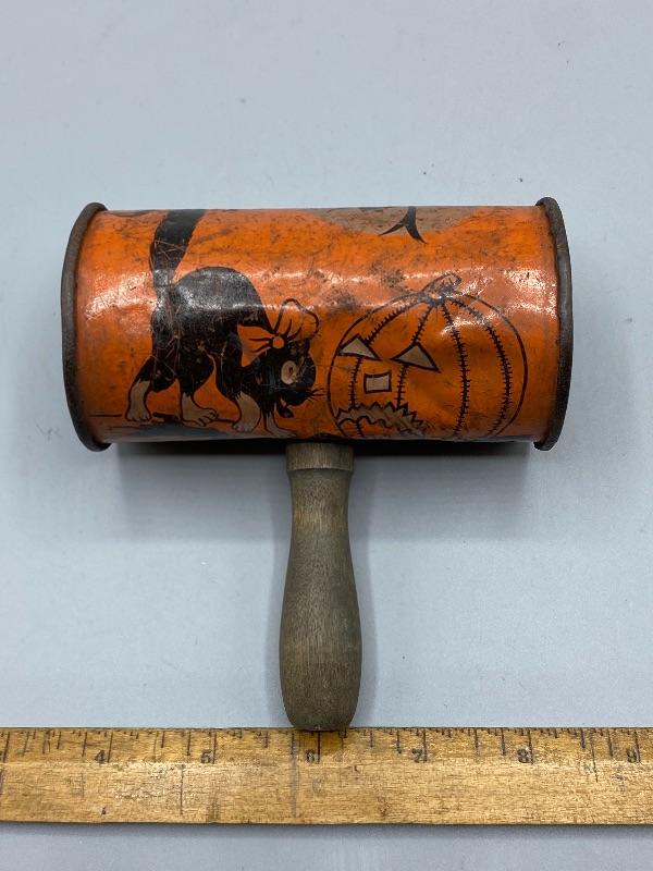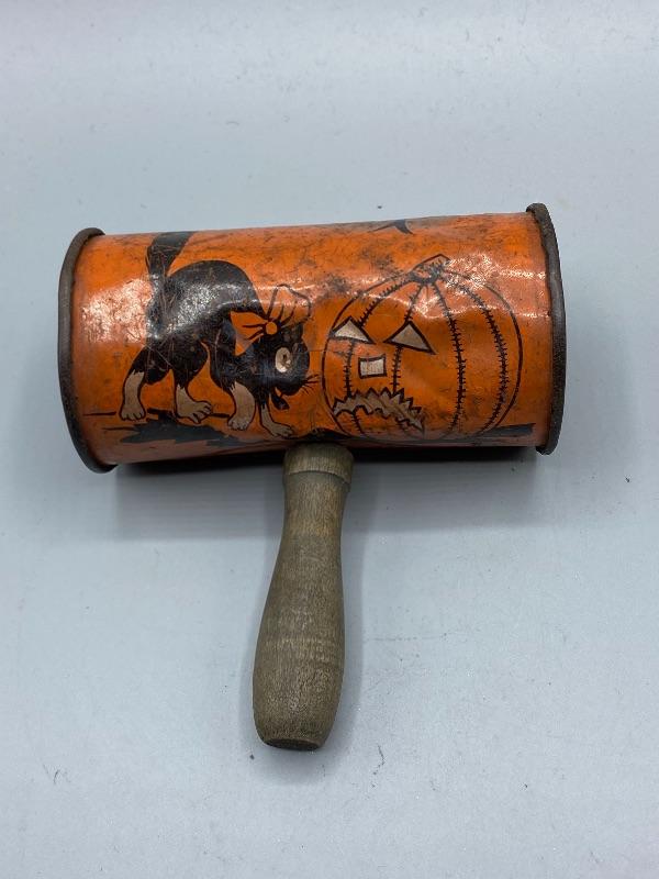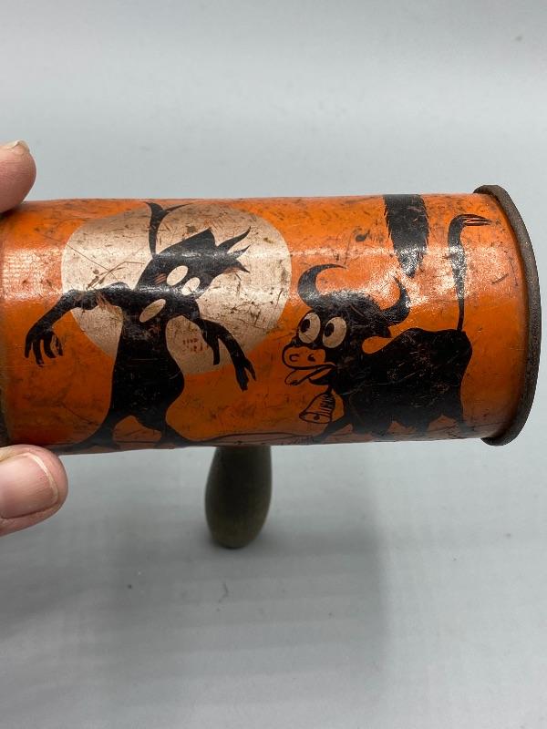Vintage tin Halloween rattle. Has a wood handle that is a little loose and is a bit beat up, but still cool. Has a jack-o-lantern and black cat on one side and a haunted tree and cow on the other. Painted orange, black, and silver.