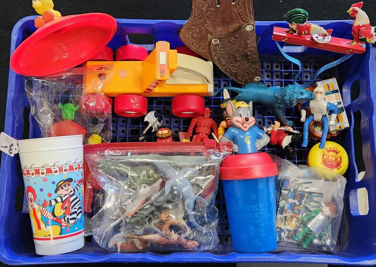 Retro Toy lot w/ Vintage Tin Hand operated Mechanical Toy Pecking Feeding Chickens & Retro Chuckie E Cheese Cup plus Old Toy tank Soldiers