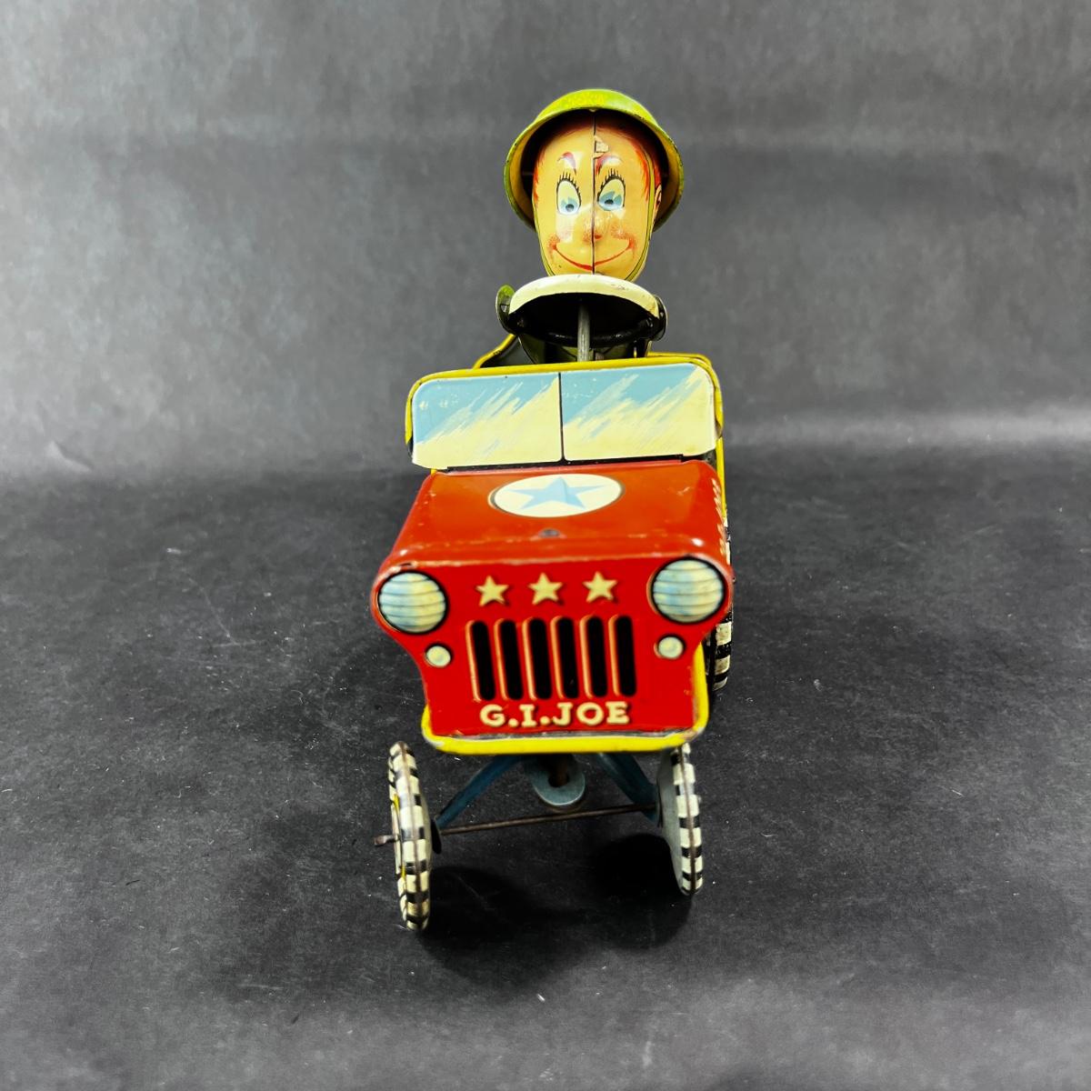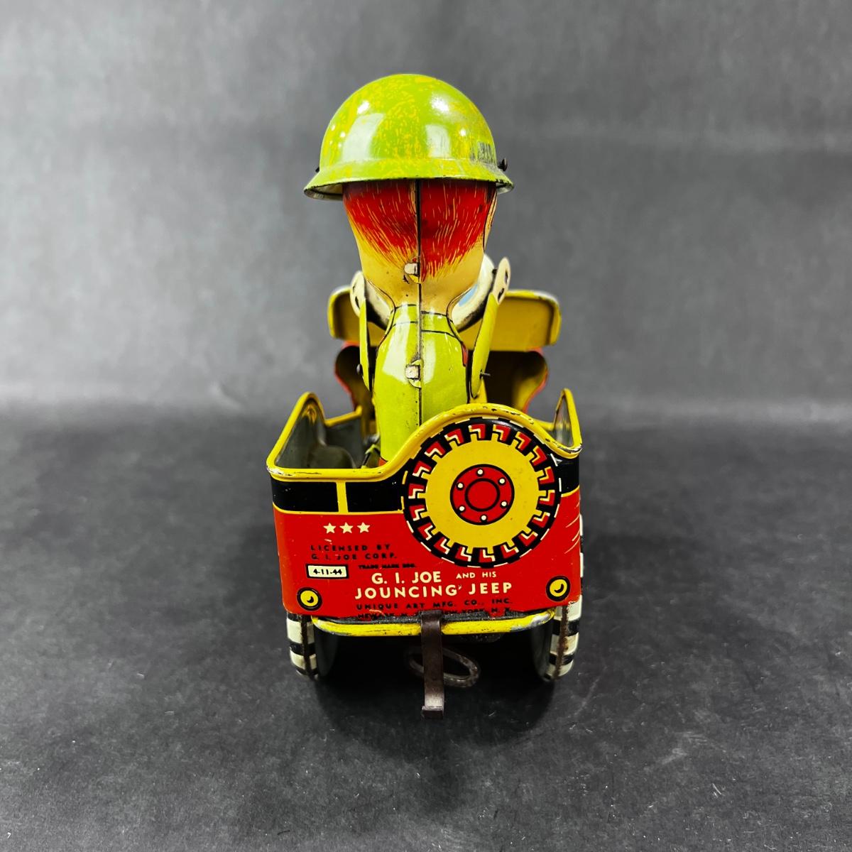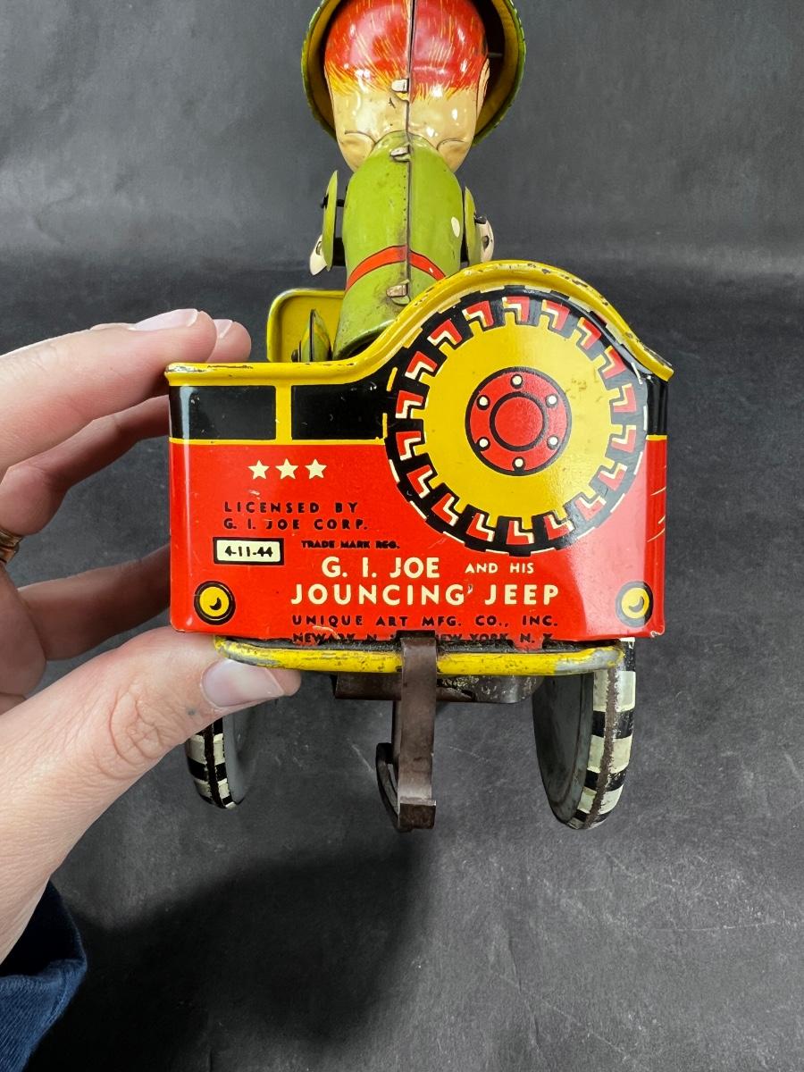 Another stunner from Unique Art. This Vintage Tin Litho G-I Joe and His Jouncing Jeep is in exceptional condition for its age. It's got great action too! **Works, Video of Function on YouTube Video, Has Key** This Tin Litho was produced in the 1940s and has phenomenal graphics still! **|** Please see photos for details and condition. ::: Shipping is available on this lot. If you require shipping you must let us know at the close of the auction. We will coordinate with you after the item has been won. Shipping fees will include insurance up to or exceeding the value of all items being mailed. If you have any questions regarding this lot please contact the auctioneer either via this website, by direct email or by phone. PICK UP TIMES and other important information can be found in the TERMS and DESCRIPTION of the auction. Please take a look for pertinent information. Thanks!