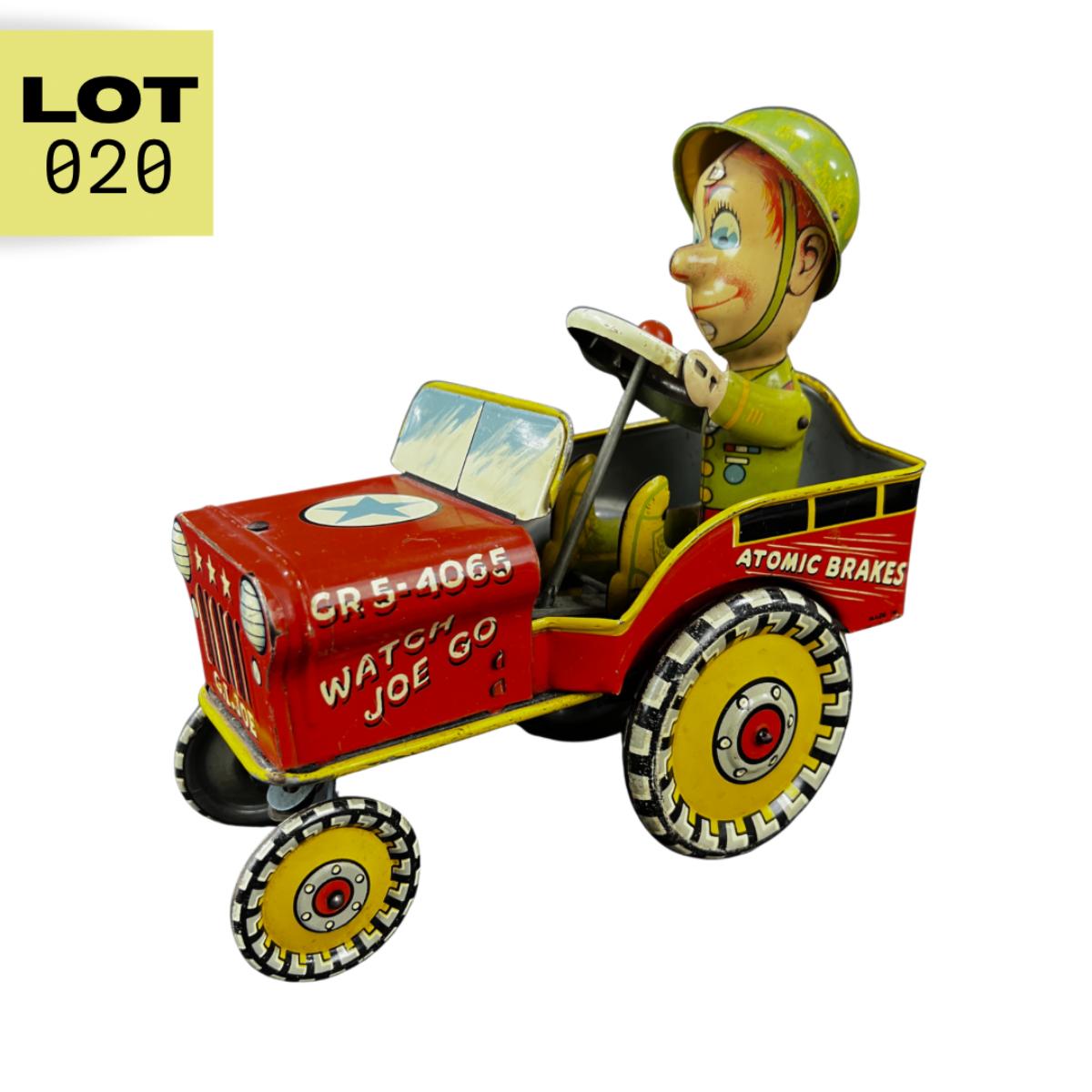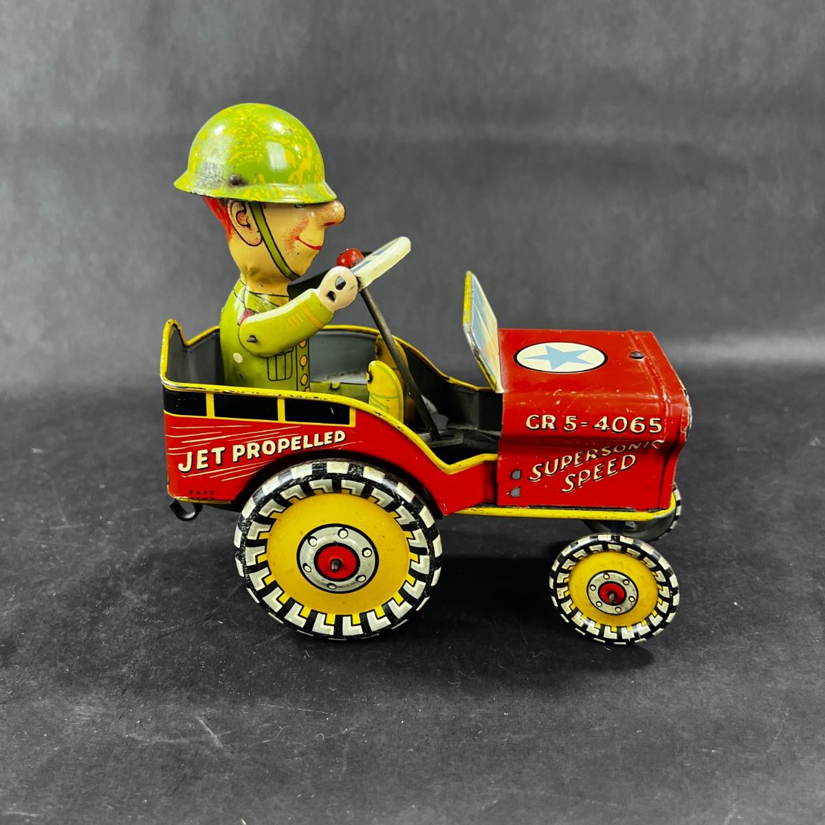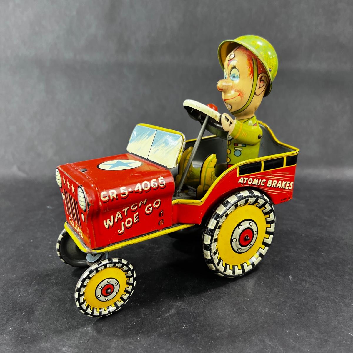 Another stunner from Unique Art. This Vintage Tin Litho G-I Joe and His Jouncing Jeep is in exceptional condition for its age. It's got great action too! **Works, Video of Function on YouTube Video, Has Key** This Tin Litho was produced in the 1940s and has phenomenal graphics still! **|** Please see photos for details and condition. ::: Shipping is available on this lot. If you require shipping you must let us know at the close of the auction. We will coordinate with you after the item has been won. Shipping fees will include insurance up to or exceeding the value of all items being mailed. If you have any questions regarding this lot please contact the auctioneer either via this website, by direct email or by phone. PICK UP TIMES and other important information can be found in the TERMS and DESCRIPTION of the auction. Please take a look for pertinent information. Thanks!