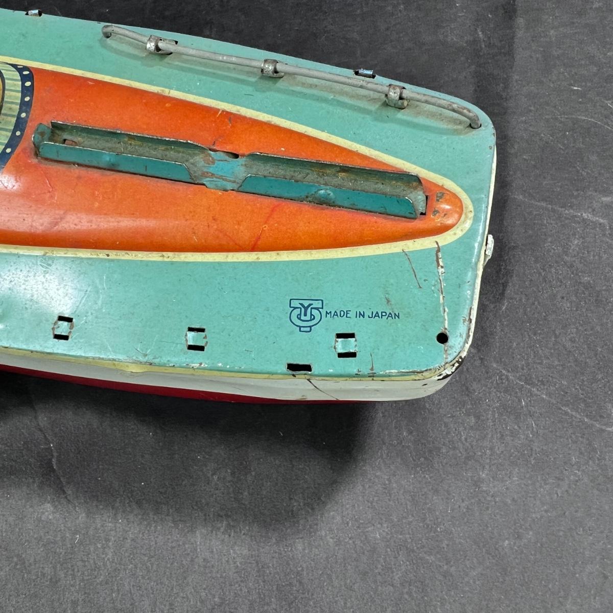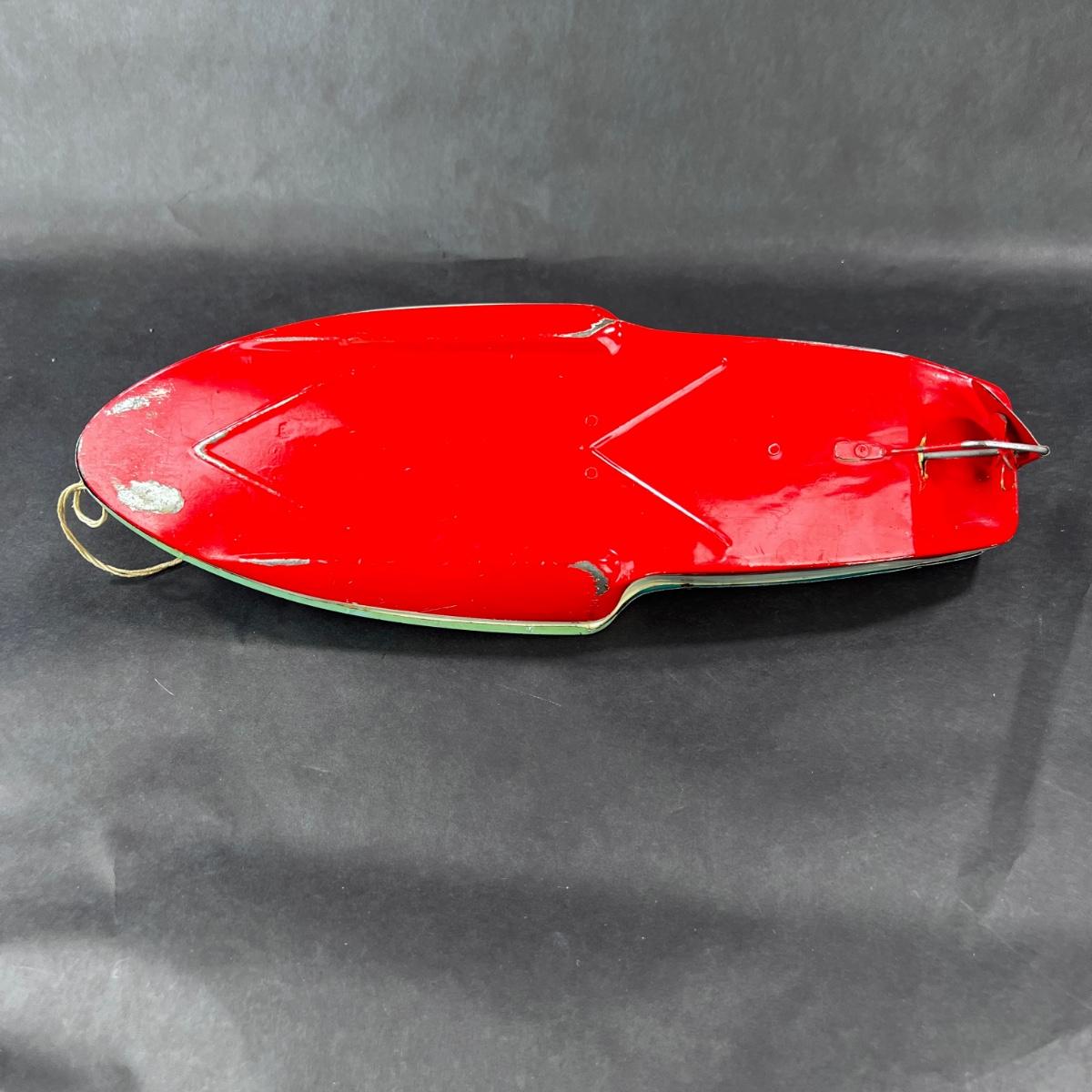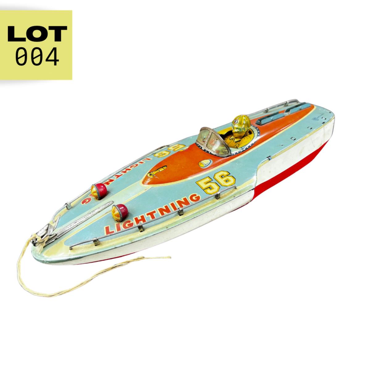 An attractive Vintage Tin Lithograph Lightening 56 Speed Boat, by Yonezawa Toys. This speedboat does not hold a wind, but has function. Probably a loose spring. **Works, Video of Function on YouTube Video, Has Key** **|** Please see photos for details and condition. ::: Shipping is available on this lot. If you require shipping you must let us know at the close of the auction. We will coordinate with you after the item has been won. Shipping fees will include insurance up to or exceeding the value of all items being mailed. If you have any questions regarding this lot please contact the auctioneer either via this website, by direct email or by phone. PICK UP TIMES and other important information can be found in the TERMS and DESCRIPTION of the auction. Please take a look for pertinent information. Thanks!