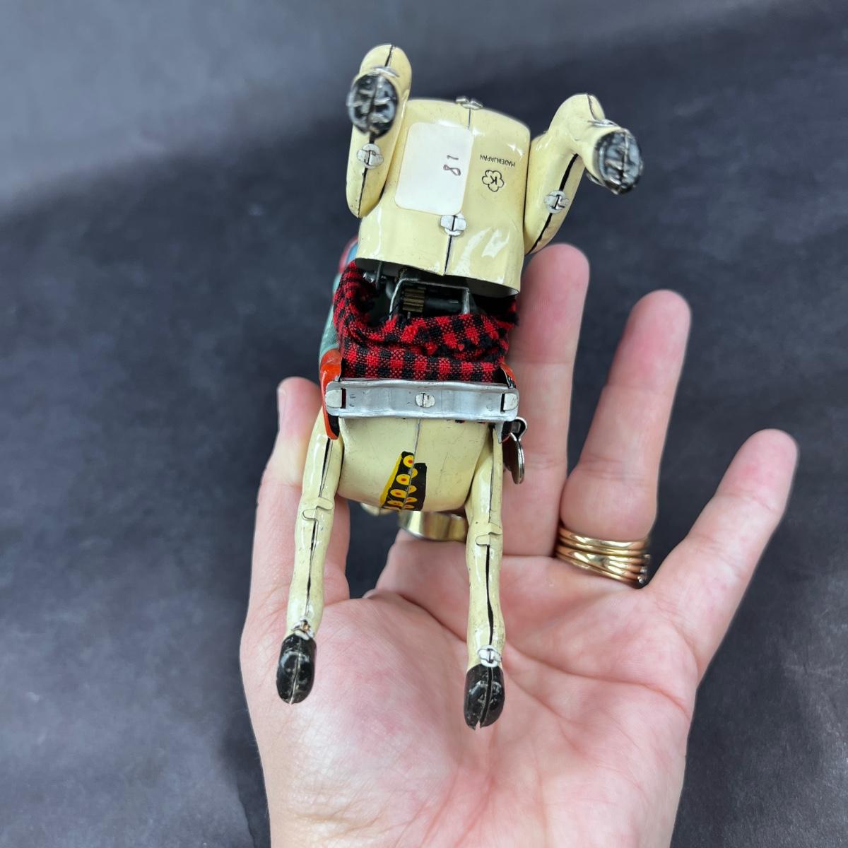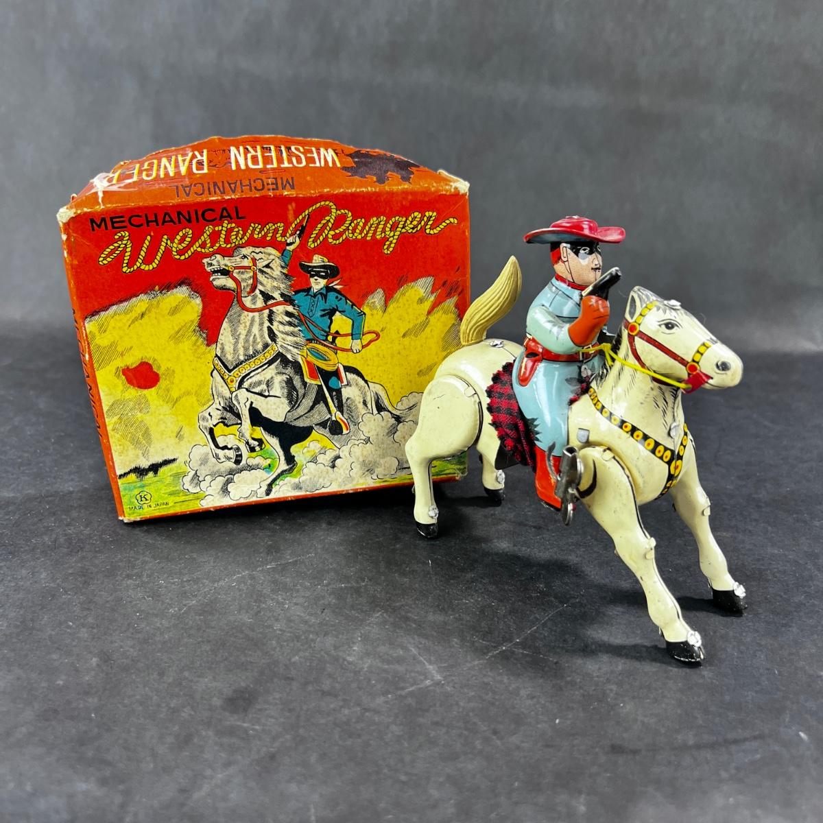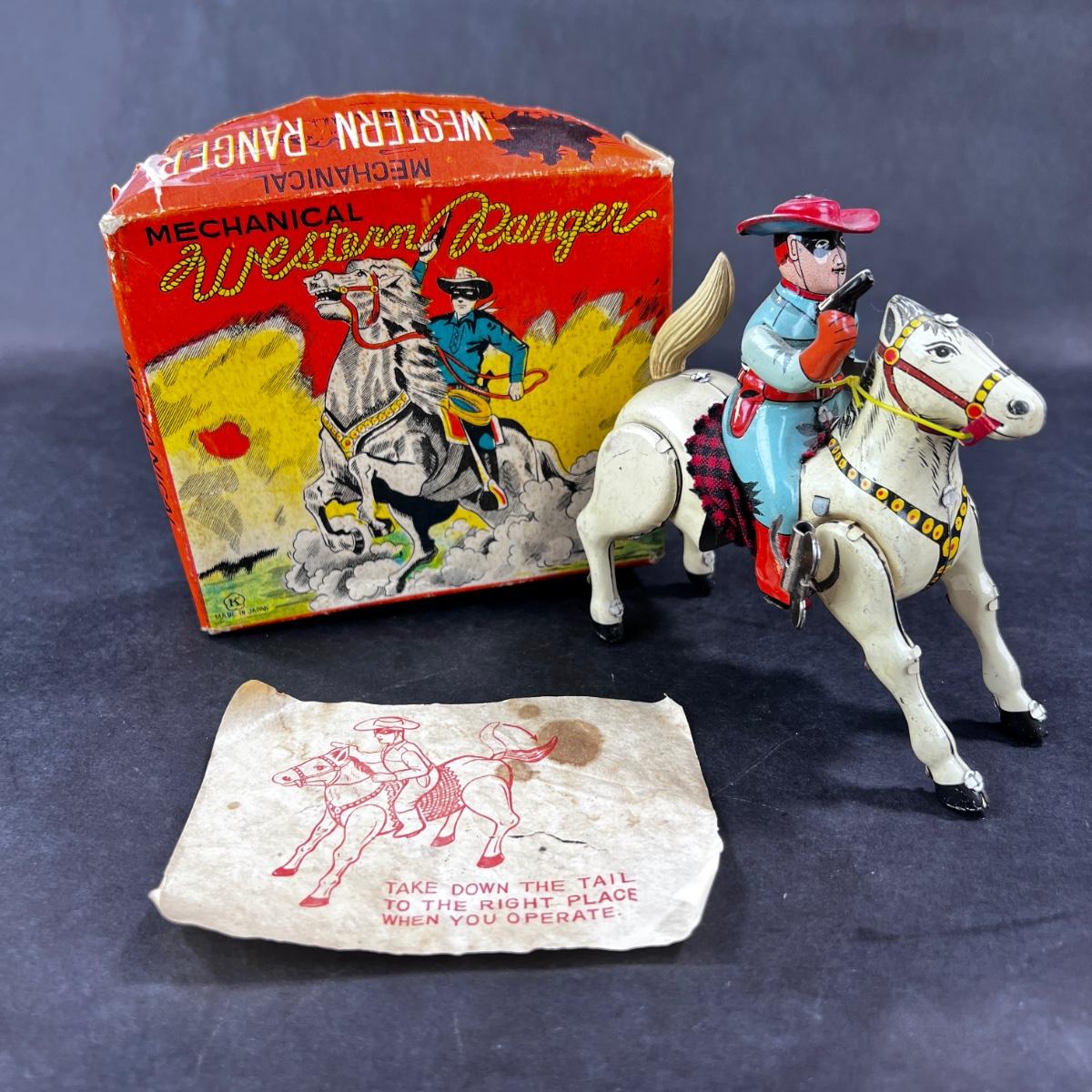 This Mechanical Western Ranger was produced by Kokyu in Japan in the Mid 1900s. This toy has great action. This toy comes with its original box. **Works, Video of Function on YouTube Video, Has Key** Please see photos for details and condition. **|** ::: Shipping is available on this lot. If you require shipping you must let us know at the close of the auction. We will coordinate with you after the item has been won. Shipping fees will include insurance up to or exceeding the value of all items being mailed. If you have any questions regarding this lot please contact the auctioneer either via this website, by direct email or by phone. PICK UP TIMES and other important information can be found in the TERMS and DESCRIPTION of the auction. Please take a look for pertinent information. Thanks!