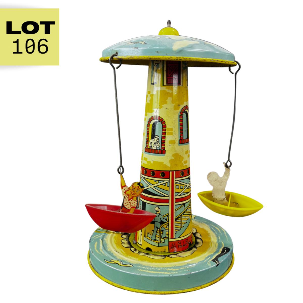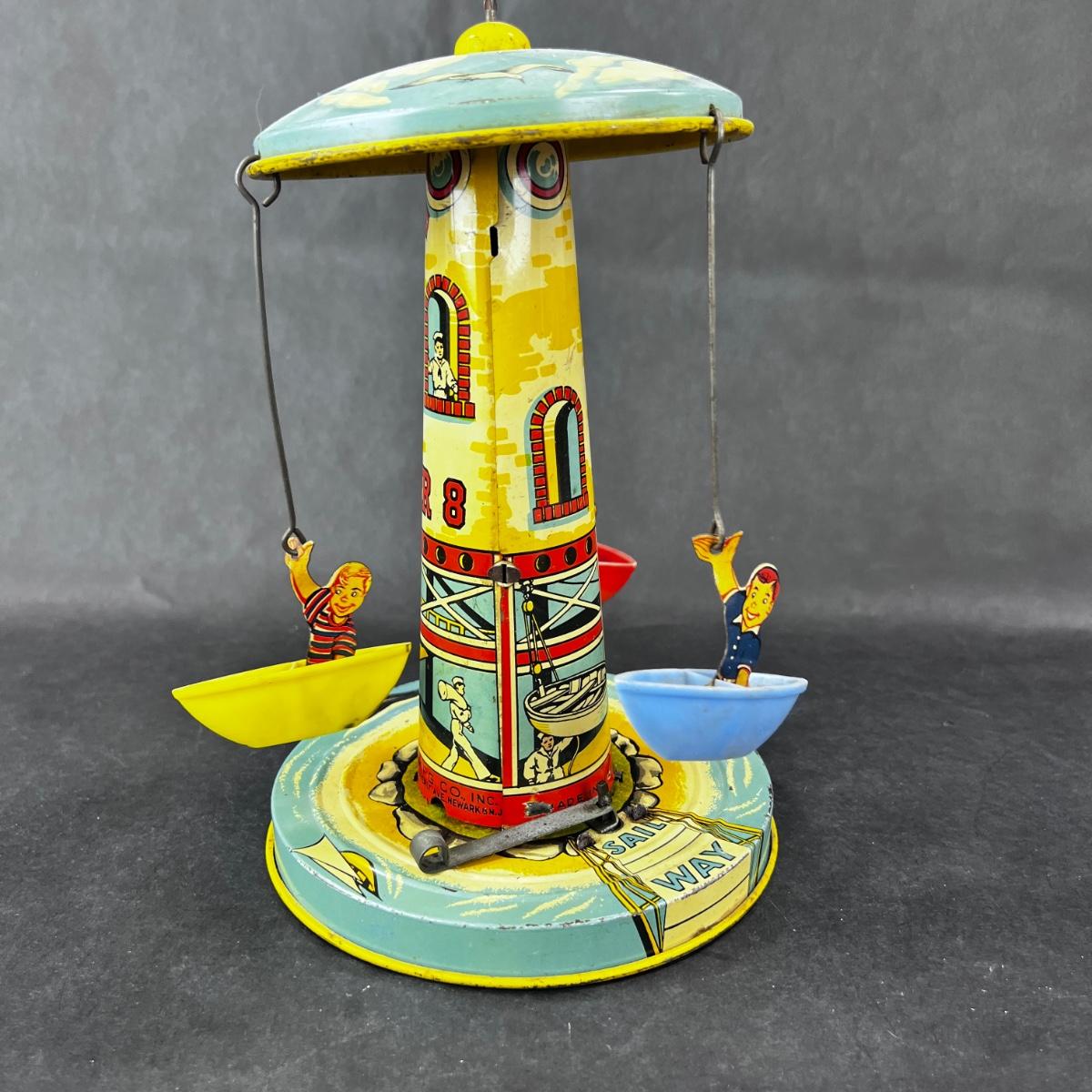 A great Vintage Tin Lithograph toy by Unique Art. This toy was produced in the mid 1900s. When you use the lever the boats spin around the lighthouse with their happy passengers inside. **Works, Video of Function on YouTube Video, Has Key** Please see photos for details and condition. **|** ::: Shipping is available on this lot. If you require shipping you must let us know at the close of the auction. We will coordinate with you after the item has been won. Shipping fees will include insurance up to or exceeding the value of all items being mailed. If you have any questions regarding this lot please contact the auctioneer either via this website, by direct email or by phone. PICK UP TIMES and other important information can be found in the TERMS and DESCRIPTION of the auction. Please take a look for pertinent information. Thanks!
